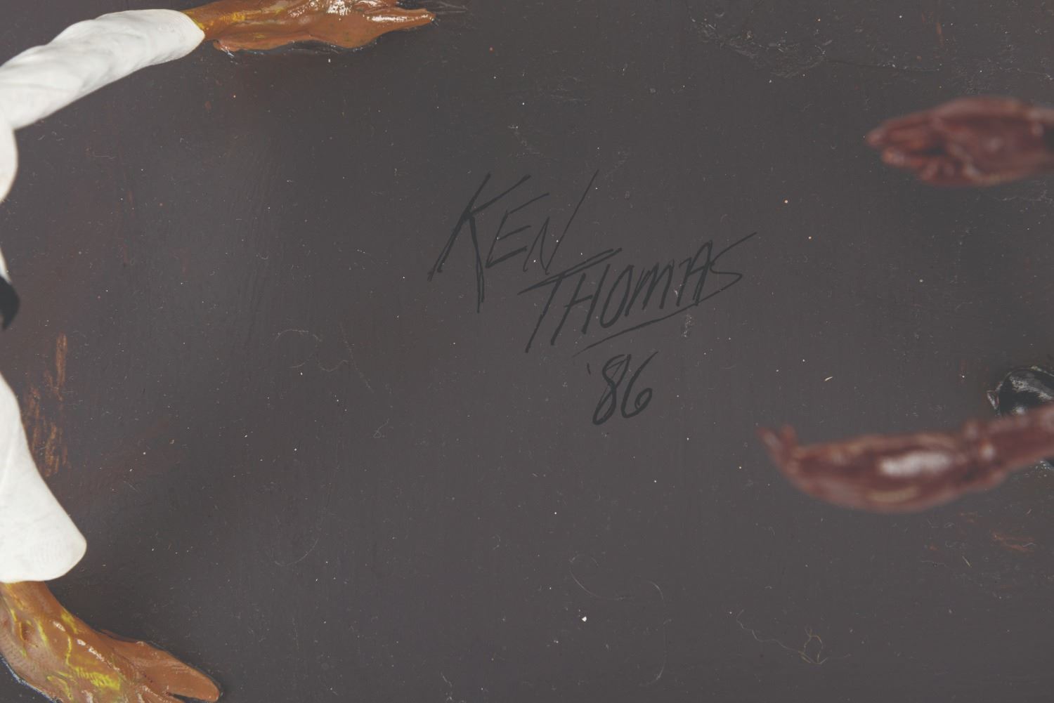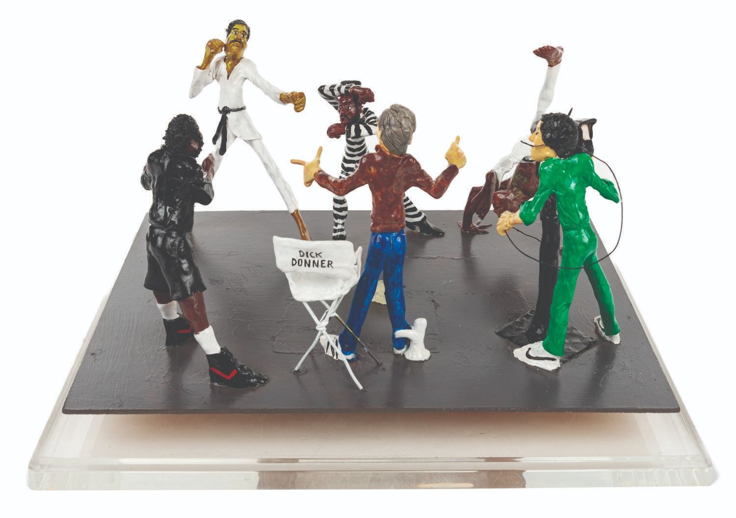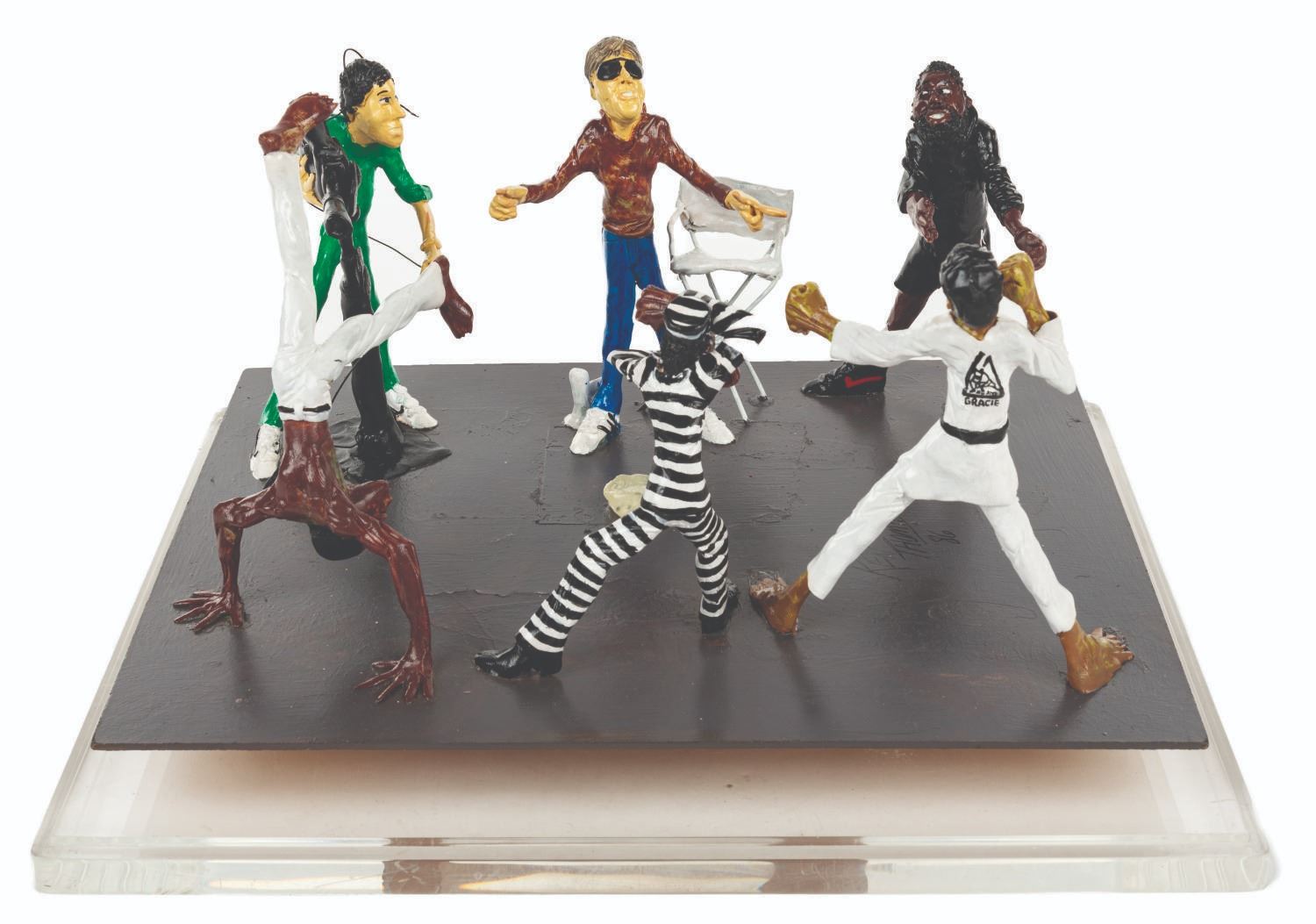 (Warner Bros., 1986) A unique sculpture signed by Ken Thomas, inspired by the production of “Lethal Weapon” and gifted to director Richard Donner. Mel Gibson trained with the film’s technical adviser, Cedric Adams in Capoeira, Dennis Newsome in Jailhouse rock, and UFC co-founder Grand Master Rorian Gracie in Jiu Jitsu to create his character’s fighting style. The statue depicts director Richard Donner, additional second assistant director Willie Simmons, a cameraman, Adams, Newsome, and Gracie. Measuring 11” x 14” x 8” tall in a 12.5” x 15.5” x 9.5” tall acrylic display, the sculpture is in very good condition with light wear and paint loss from age. The acrylic display exhibits scratches, scuffs, and wear. This item requires special shipping arrangements. Please inquire before bidding.