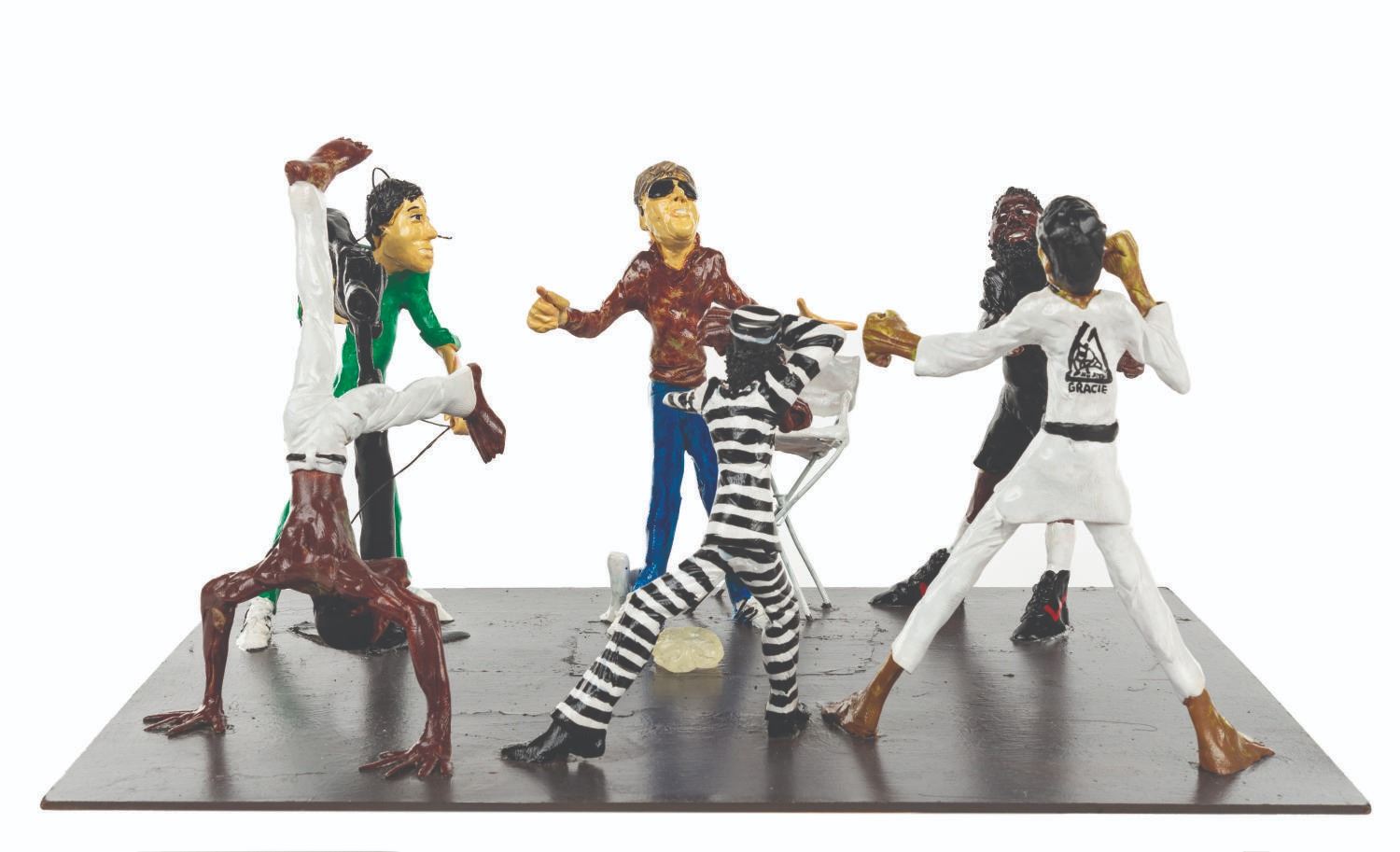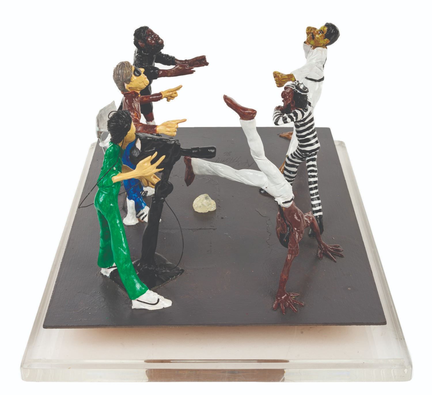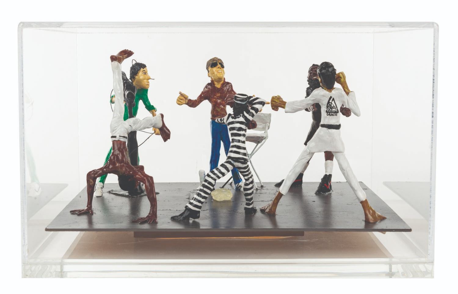 (Warner Bros., 1986) A unique sculpture signed by Ken Thomas, inspired by the production of “Lethal Weapon” and gifted to director Richard Donner. Mel Gibson trained with the film’s technical adviser, Cedric Adams in Capoeira, Dennis Newsome in Jailhouse rock, and UFC co-founder Grand Master Rorian Gracie in Jiu Jitsu to create his character’s fighting style. The statue depicts director Richard Donner, additional second assistant director Willie Simmons, a cameraman, Adams, Newsome, and Gracie. Measuring 11” x 14” x 8” tall in a 12.5” x 15.5” x 9.5” tall acrylic display, the sculpture is in very good condition with light wear and paint loss from age. The acrylic display exhibits scratches, scuffs, and wear. This item requires special shipping arrangements. Please inquire before bidding.