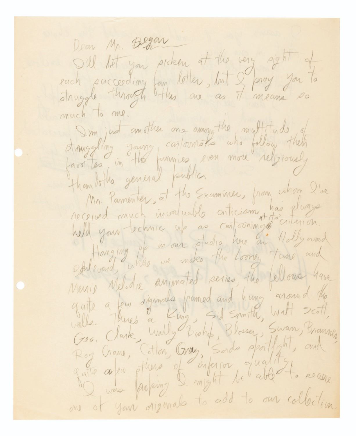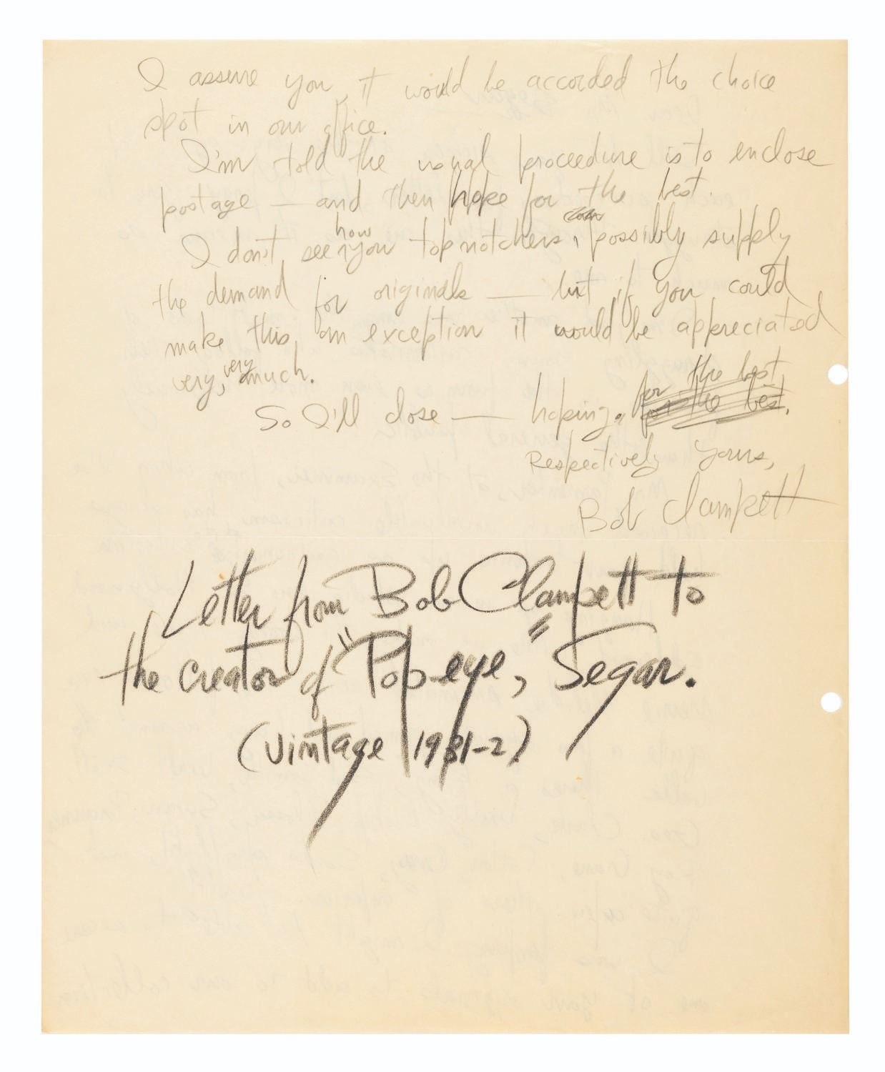 (Clampett, 1931-1932) A letter draft from Bob Clampett to E.C. Segar, the creator of Popeye the Sailor. Clampett kept this handwritten draft of the letter he sent to the cartoonist, requesting a piece of original Popeye artwork to display on the Harman-Ising Studio’s wall of originals, which included artists such as Jack King, Sid Smith, Walt Scott, and others. Ever the collector, Clampett later wrote the provenance of this keepsake directly on the letter, effectively signing it. According to Clampett, Segar never responded. Measuring 9.75” x 12”, the double-sided letter is in very good condition with light wear, discoloration from age, and a full horizontal fold from mailing.