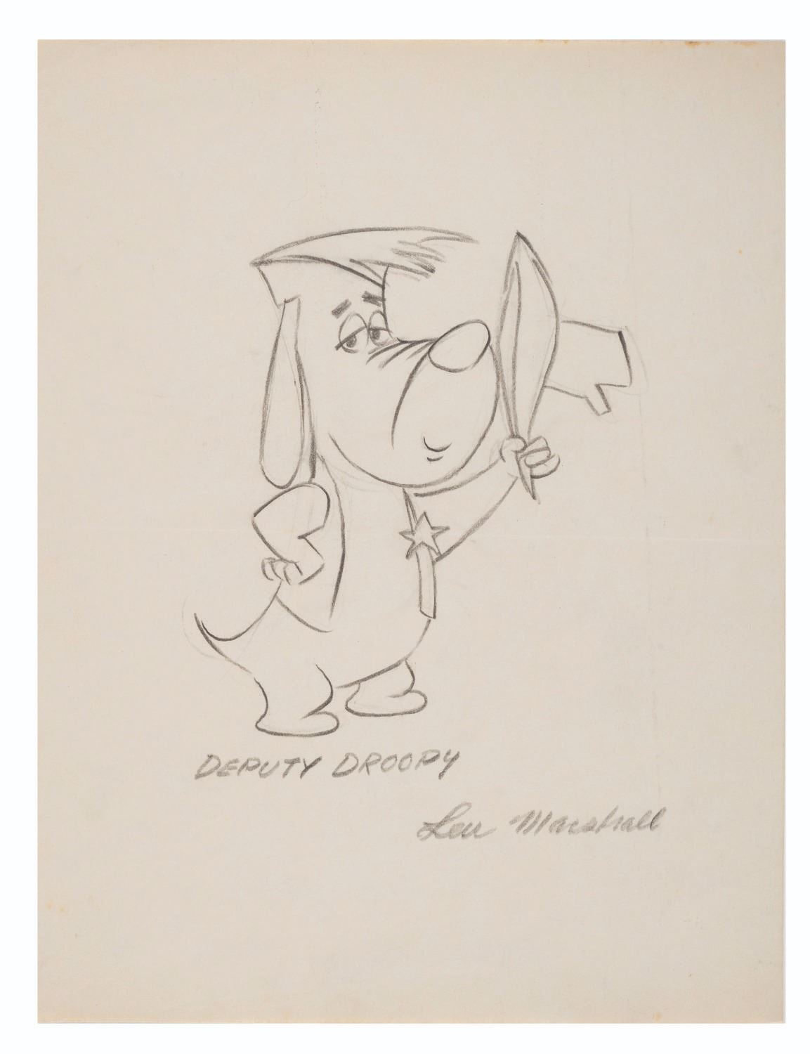 (Lew Marshall, 1980s-90s) A Lew Marshall signed drawing of Deputy Droopy. Marshall was an animator at MGM in the 1950s before moving on to Hanna-Barbera in the 1960s. He created this drawing of Deputy Droopy as a gift to a fan. The paper measures 8.5"x11" and has a character image size of 5"x5.75". The artwork is in very good condition with creasing, yellowing and wear to the edges.