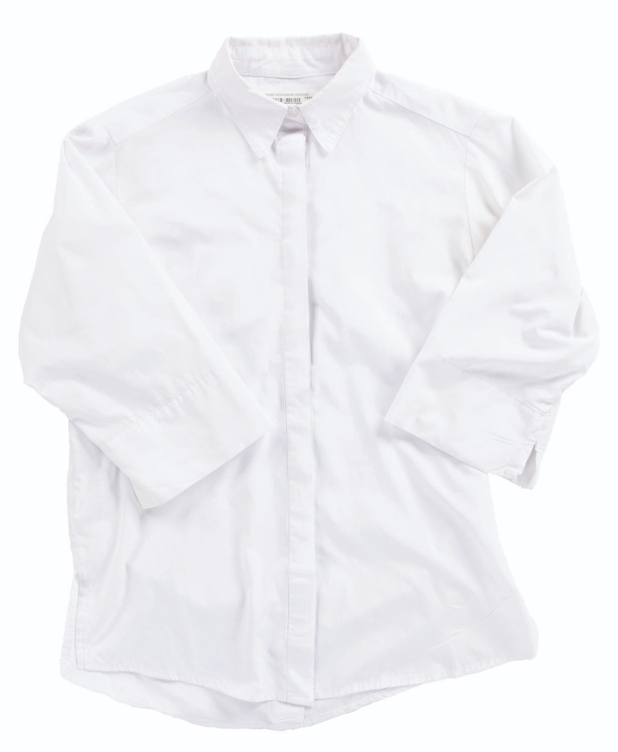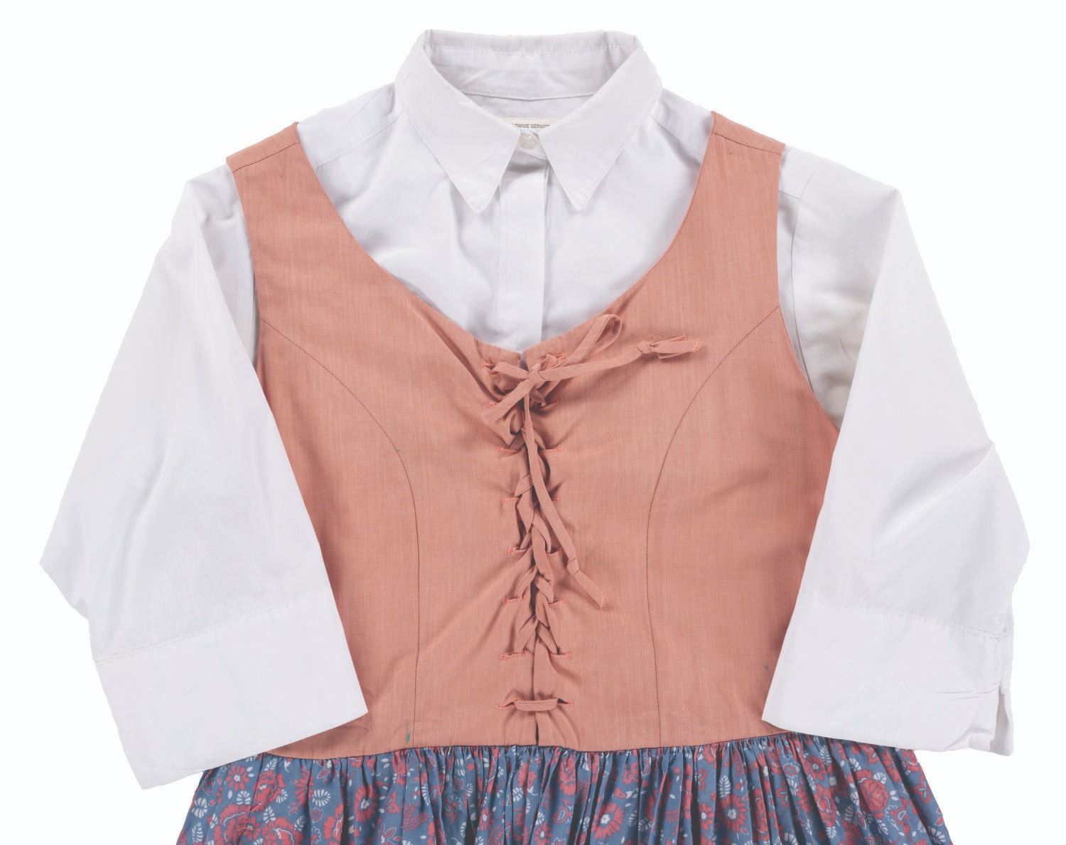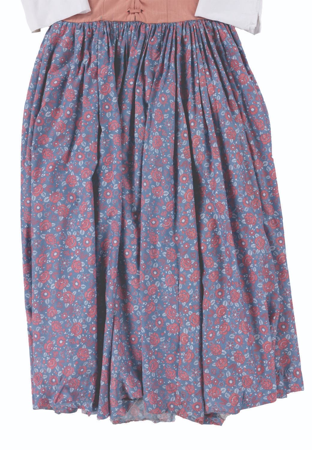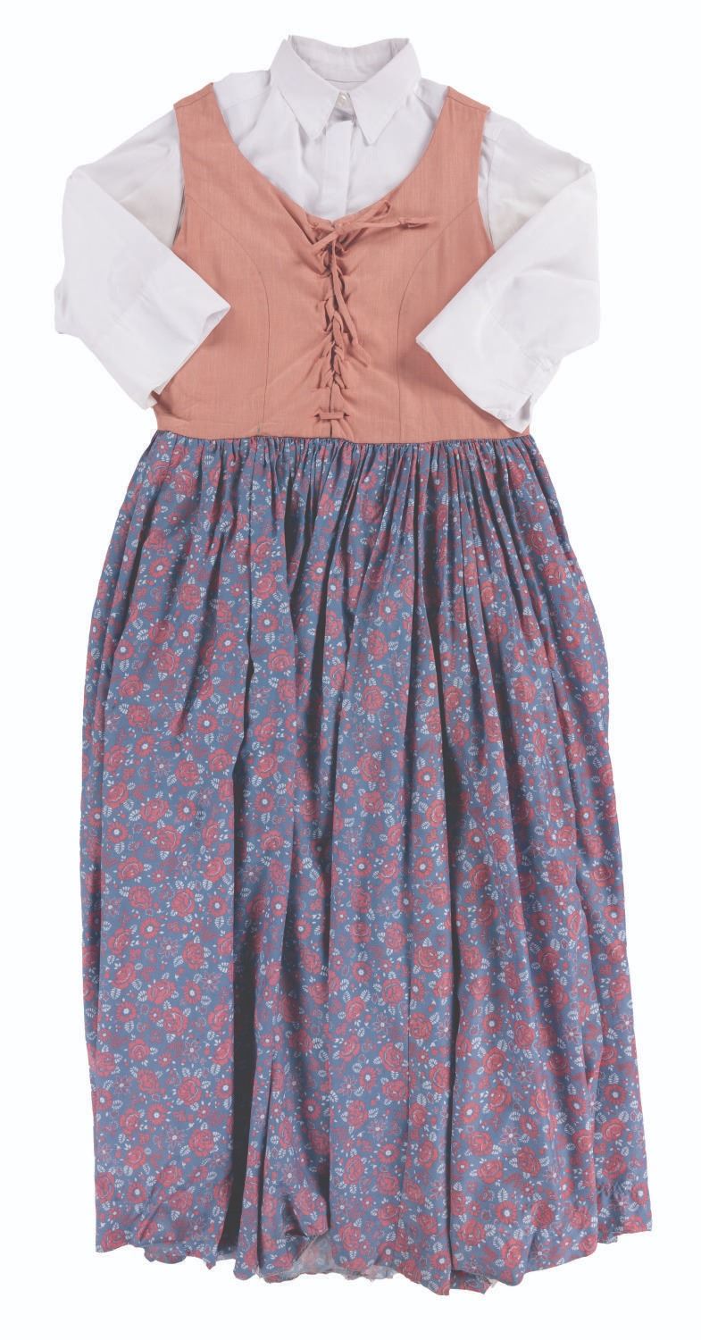 (Walt Disney World, 2010s) A female costume blouse and dress worn by Cast Members working in Liberty Square at the Magic Kingdom. The blouse is labeled a size S and the dress 08x36, both in good condition with fraying, a 2 " tear near the bottom, spots of paint stains, and wear from Park use.