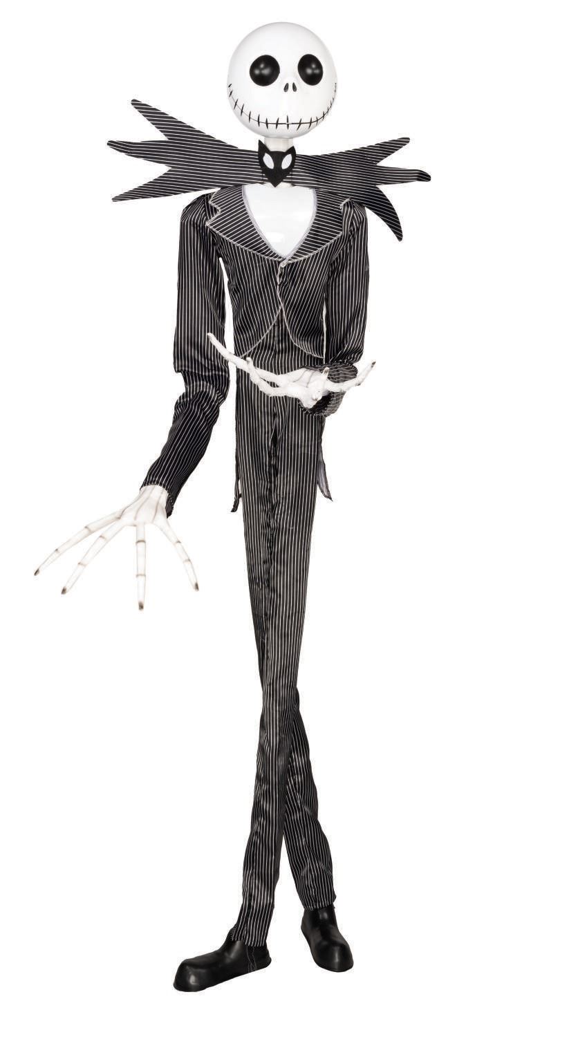 (Gemmy, 2017) A Jack Skellington Life-Size Animated Character by Gemmy Industries Corp. The 17-piece Jack figure is both sound and motion activated, features animated hands, mouth, and arms, and speaks twelve phrases from "Tim Burton's The Nightmare Before Christmas." Measuring an impressive 77" tall and 36" at its widest points, the figure is in very good, working condition, exhibiting only few spots of slight wear to the fabric of his pants.