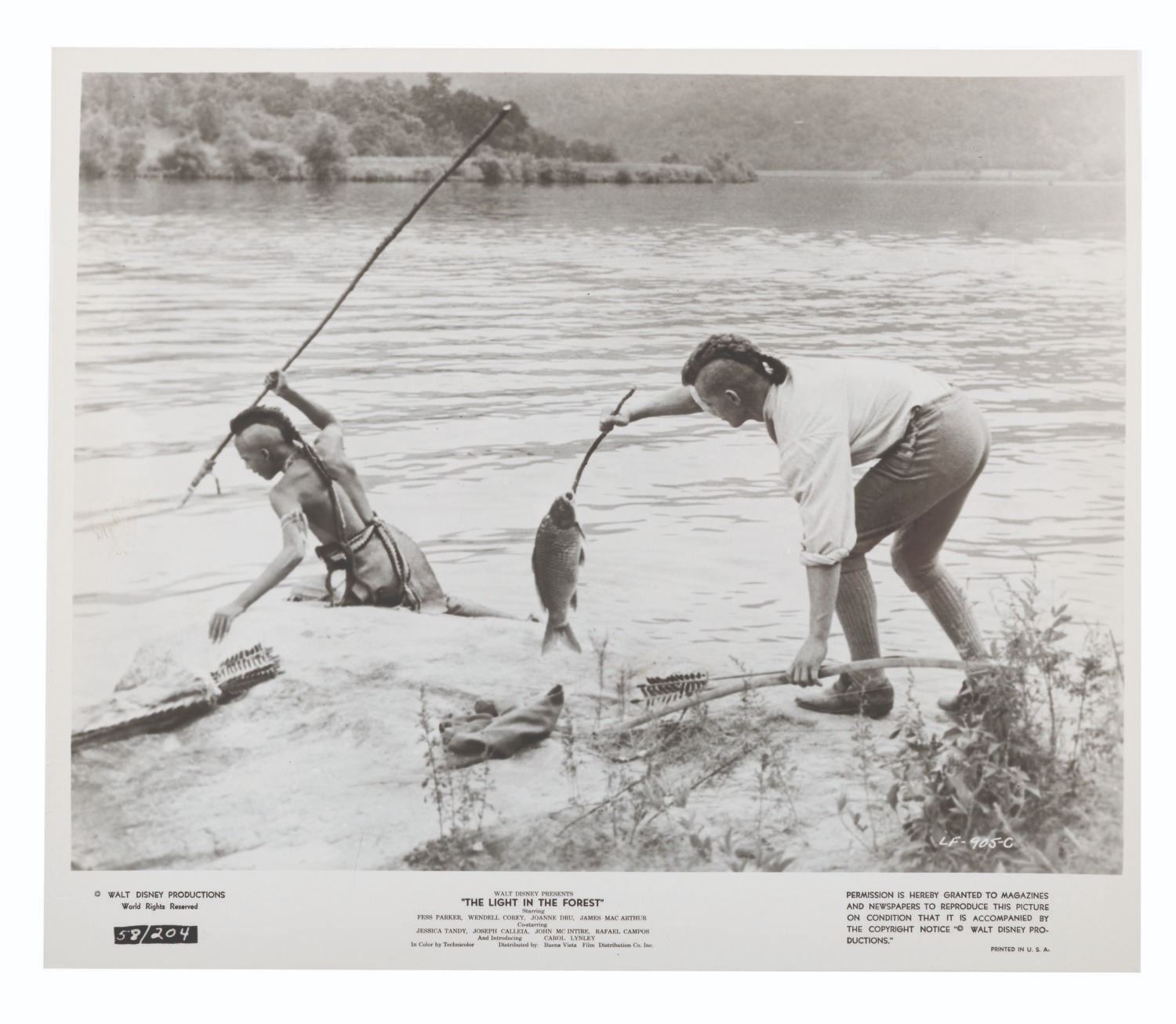 (Disney, 1958) A lobby card for "Light in the Forest" starring Fess Parker, Joanne Dru, James MacArthur, and Jessica Tandy. Measuring 8" x 9.5," the photo is in good condition, unevenly trimmed and exhibiting light discoloration and soiling to the reverse.