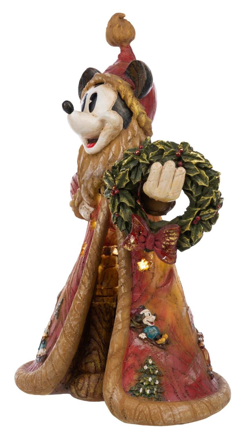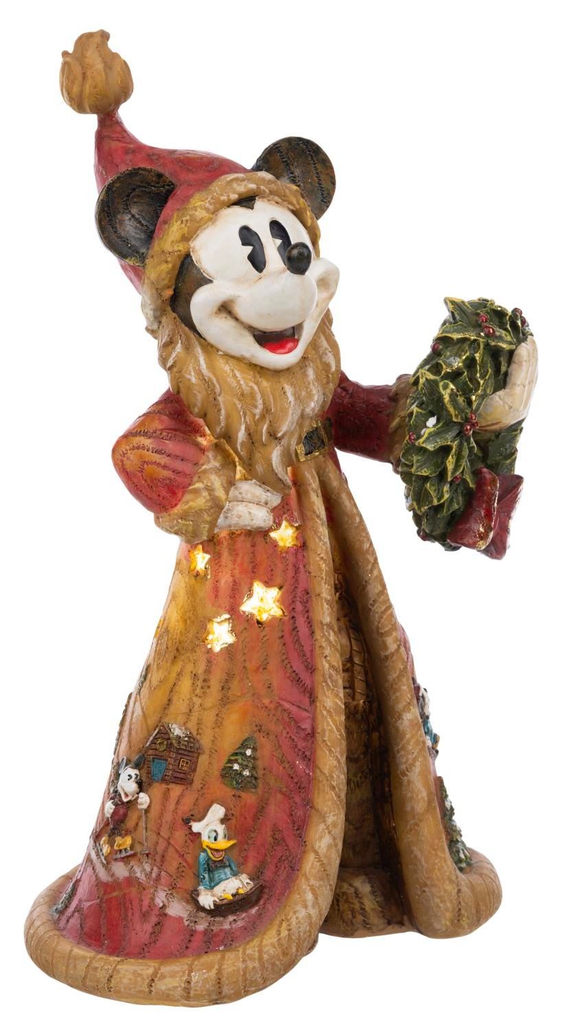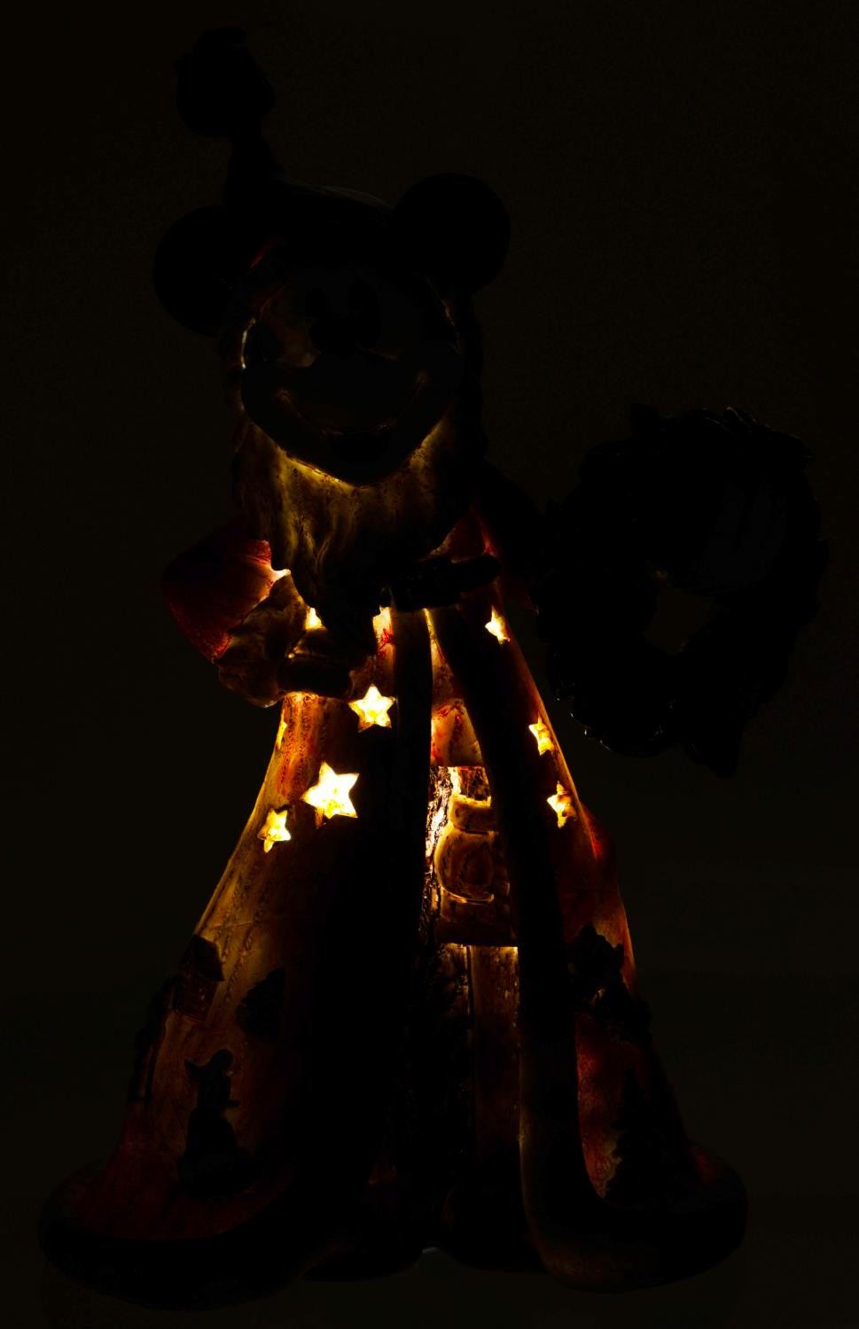 (Disney, 1990s) A Woodland"Santa Mickey on Stiltz" figurine that lights up with the use of two AA batteries (not included). Measuring 7" x 6" x 11" tall, the Mickey figurine is in good working condition with a missing battery cover screw.