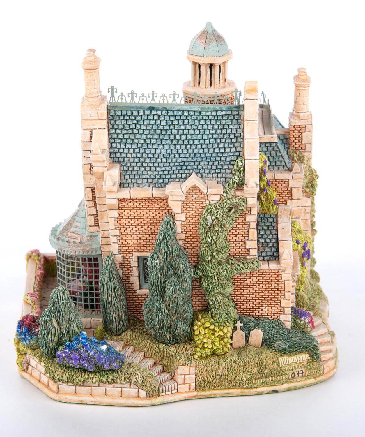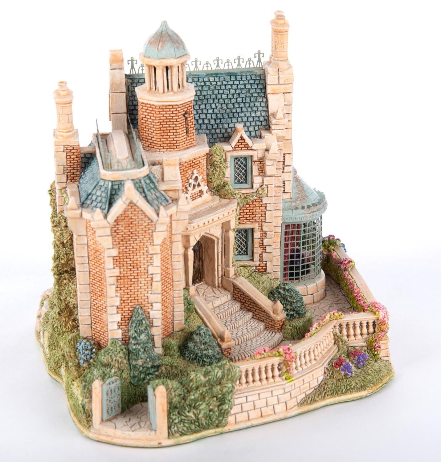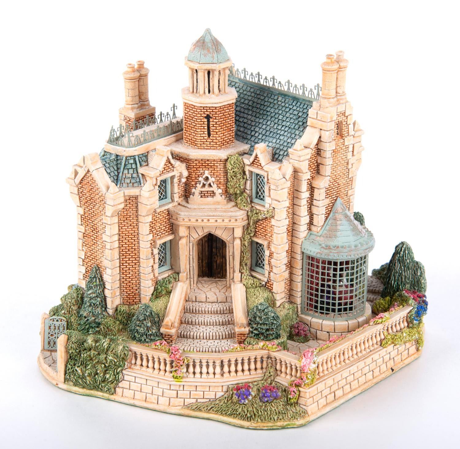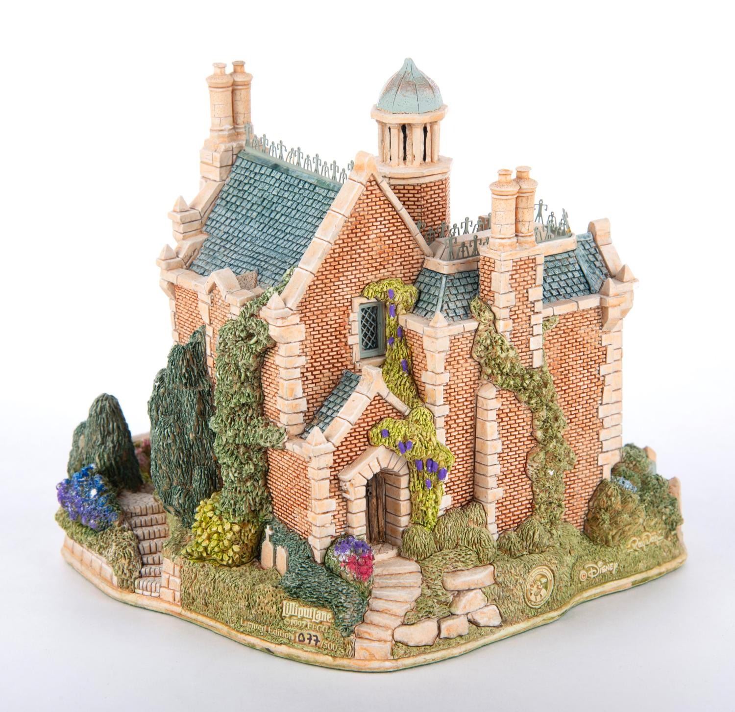 (Lilliput Lane, 1997) A Lilliput Lane Figure of The Haunted Mansion at The Magic Kingdom in Walt Disney World. This figure features little details like a miniature observatory with a seance, was limited to an edition of 500, and is signed by Disney Artists David Tate and Ray Day. Measuring 4.5” tall and 5” at its widest diameter, this piece is in fine condition.