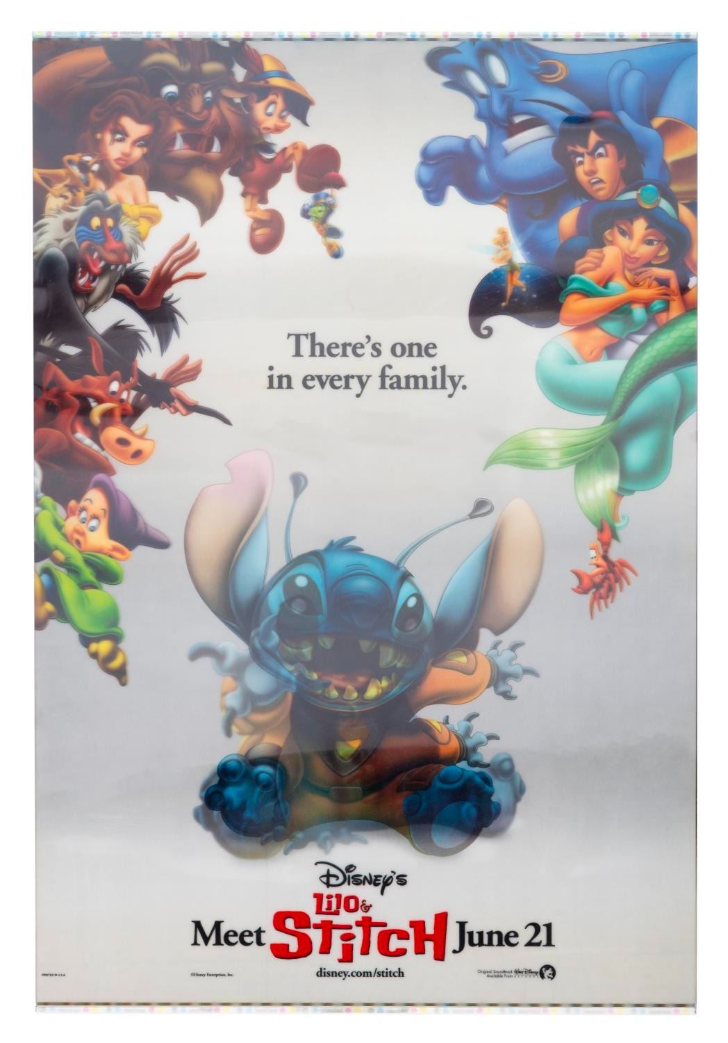 (Disney, 2002) A lenticular poster for "Lilo & Stitch." The lenticular image of Stitch switches between his alien and "dog" forms as classic Disney characters glare at him or run for cover. Measuring 27" x 40", the one-sheet is in very good condition with light creases, scuffs, scratches, discoloration, and a small area of faint cracks in the plastic where the poster was rolled too tightly.