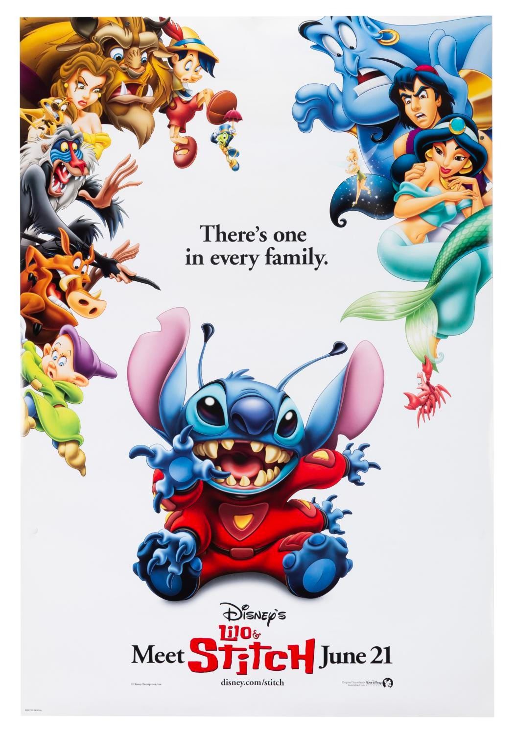 (Disney, 2002) A one-sheet for the theatrical release of "Lilo & Stitch." Measuring 27" x 40", the poster displays in very good condition with light wear from handling and display.