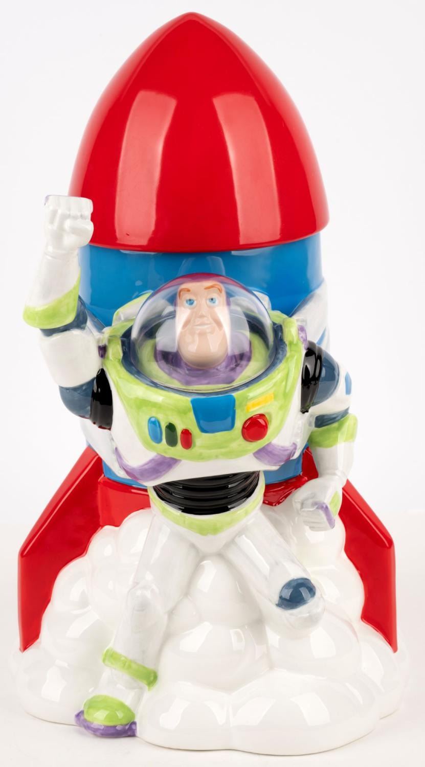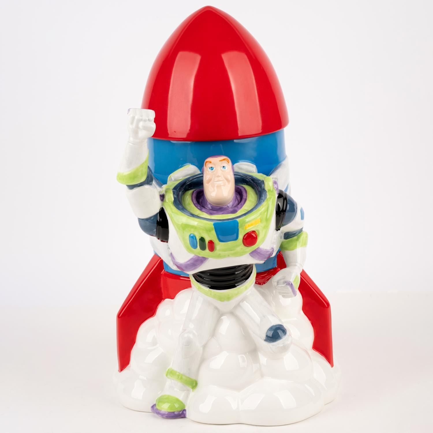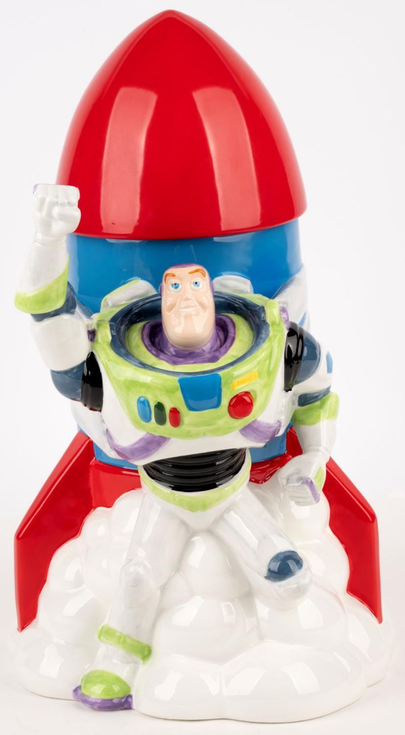 (Treasure Craft, 1997) A ceramic cookie jar of Buzz Lightyear strapped to a rocket from Disney/Pixar's "Toy Story." Part of an edition of 1500, the 9" x 10.5" and 16" tall cookie jar is in fine condition and comes with the original 14" x 13" x 17" box. Also included are a COA and folded invitation to join the Treasure Craft Collectors Club.