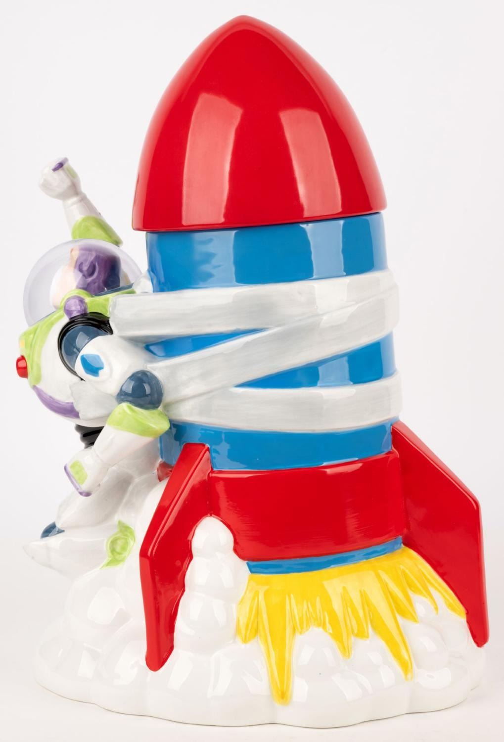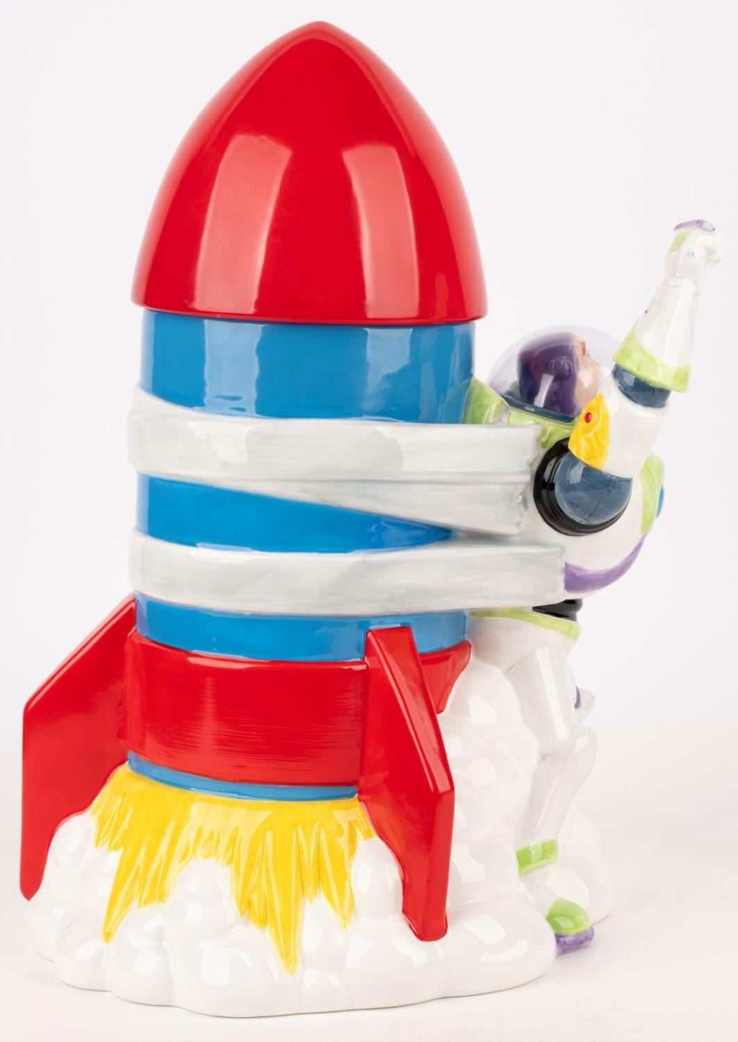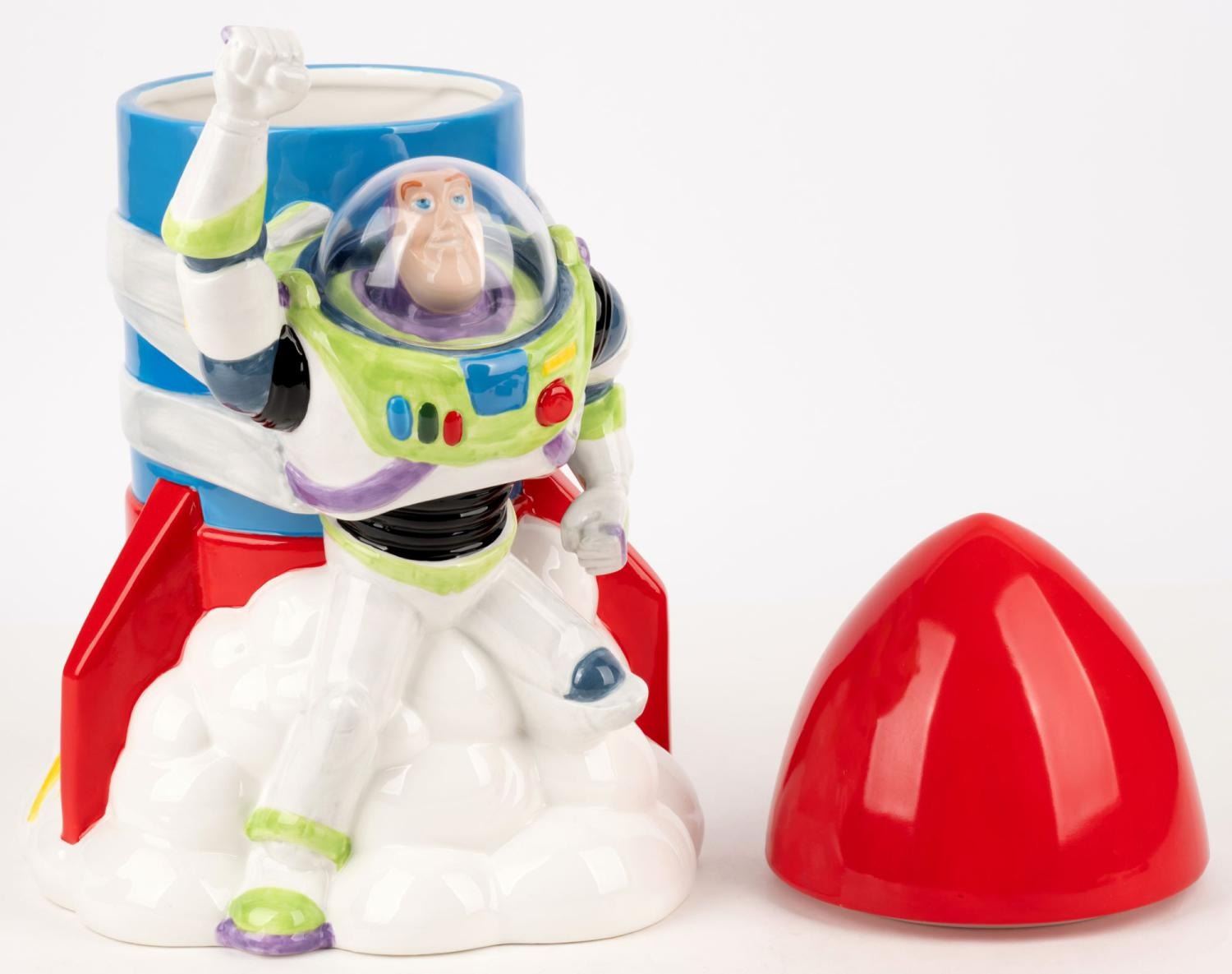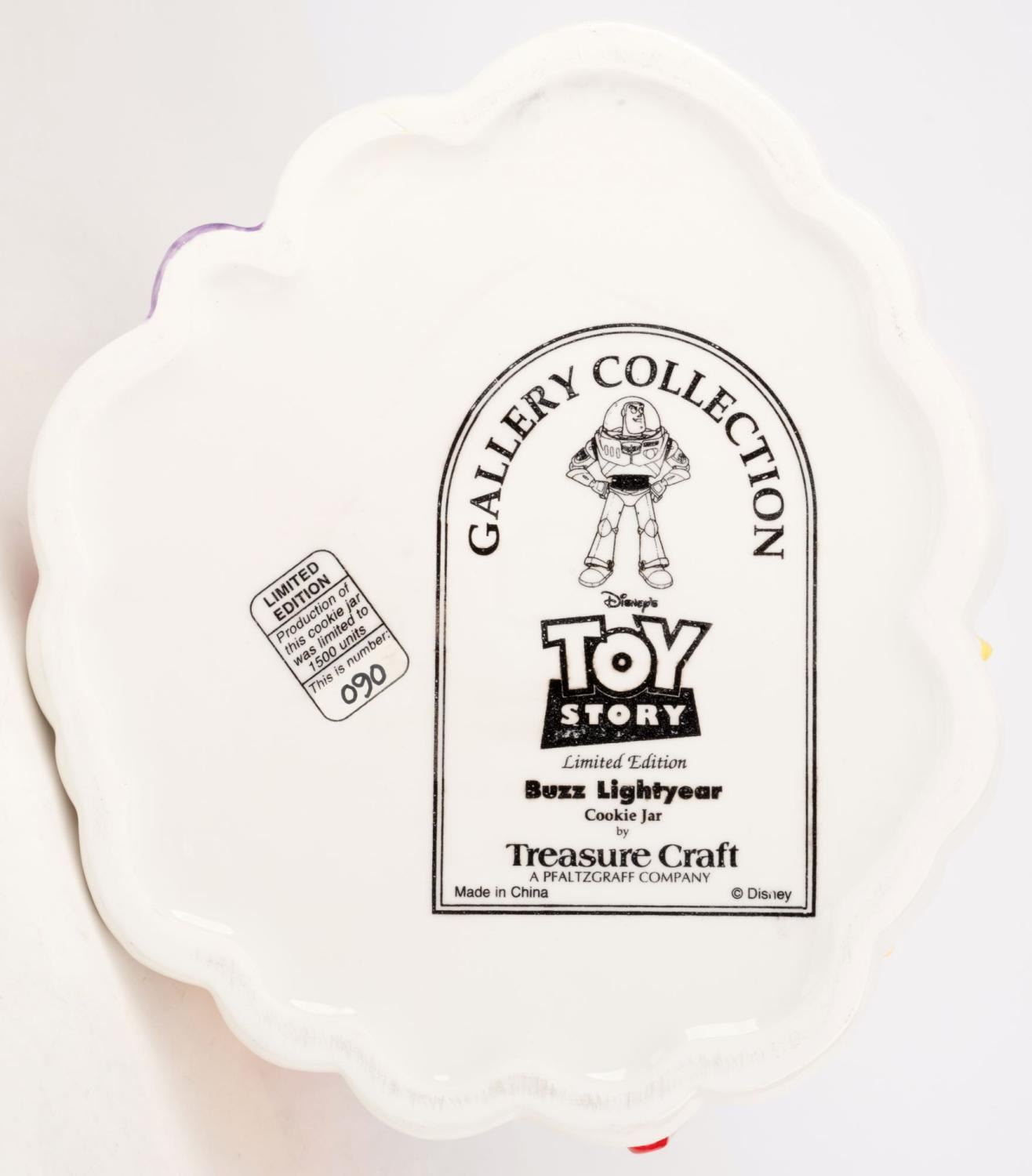 (Treasure Craft, 1997) A ceramic cookie jar of Buzz Lightyear strapped to a rocket from Disney/Pixar's "Toy Story." Part of an edition of 1500, the 9" x 10.5" and 16" tall cookie jar is in fine condition and comes with the original 14" x 13" x 17" box. Also included are a COA and folded invitation to join the Treasure Craft Collectors Club.