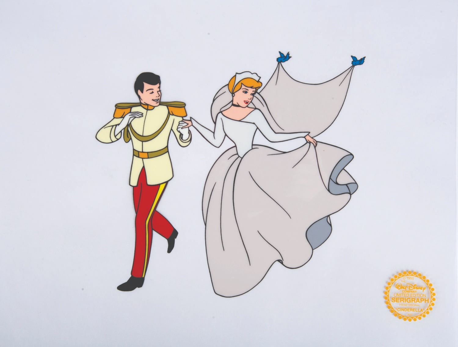 (Disney, 1990s) A limited edition serigraph cel featuring Cinderella and the Prince from "Cinderella." These cels were limited to an edition of 9,500 and created using a silk-screen process, rather than hand-painting. The cel measures 10.75"x14" and is in fine condition.