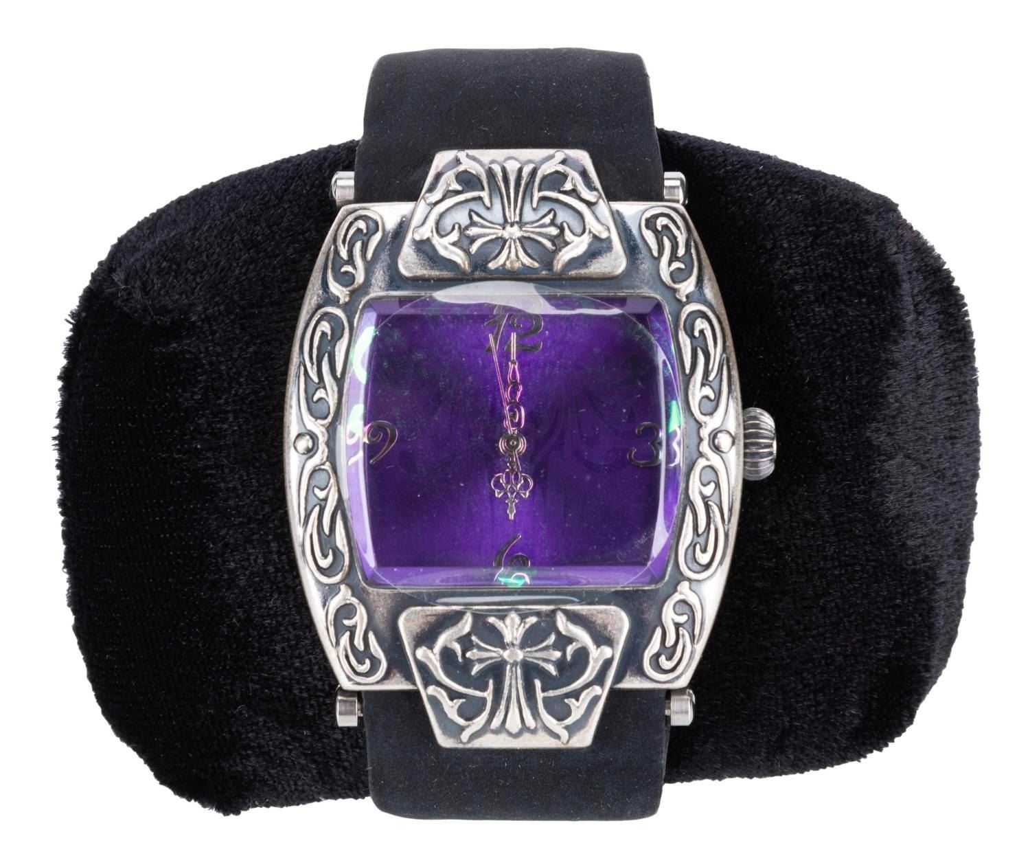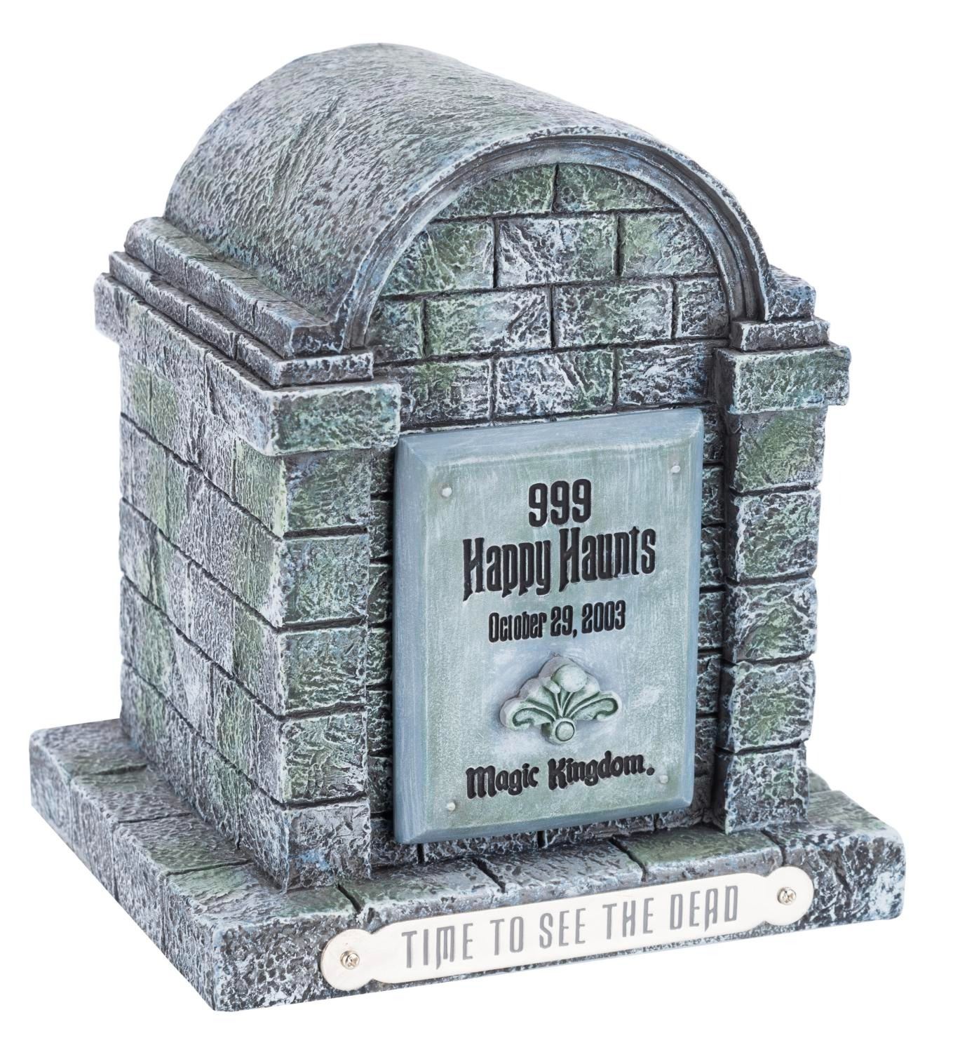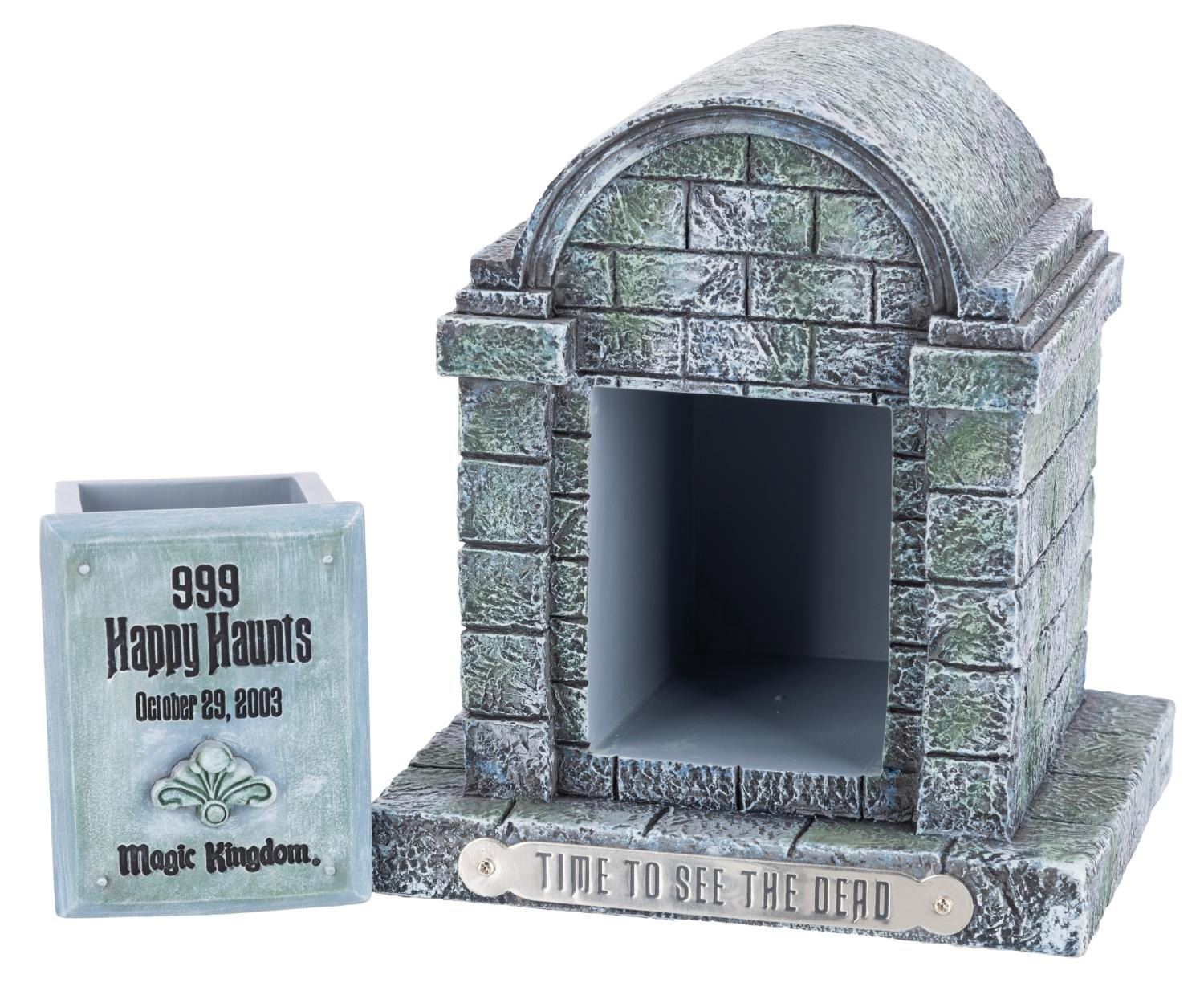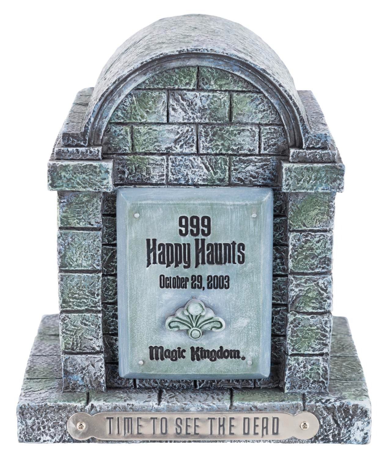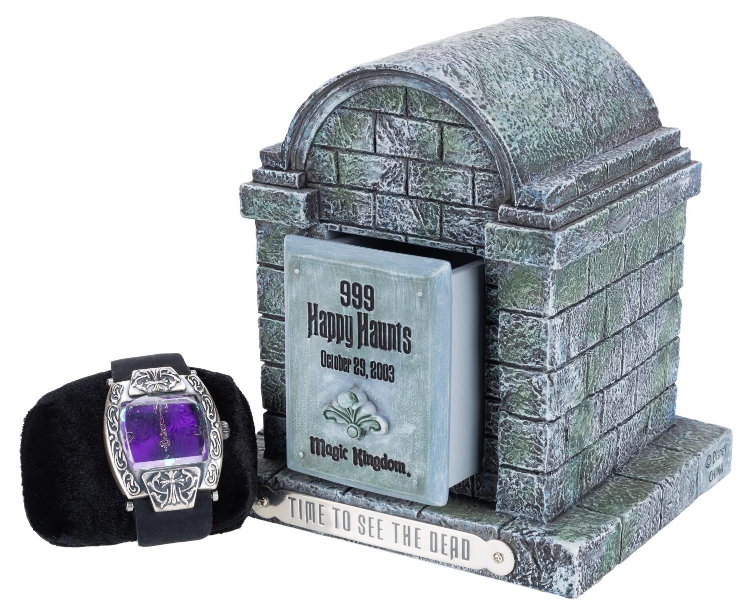 (Walt Disney World, 2003) A Time to See the Dead watch in a Magic Kingdom mausoleum case. Released in a limited edition of 400, the watch was exclusive to the 999 Happy Haunts event held in the Magic Kingdom on October 29, 2003. With a 1” x 1.25” face on a 9.25” long strap and housed in a 4.75” x 5.75” x 6” tall resin mausoleum, the watch displays in very good condition with light scratches, stains, and wear.
