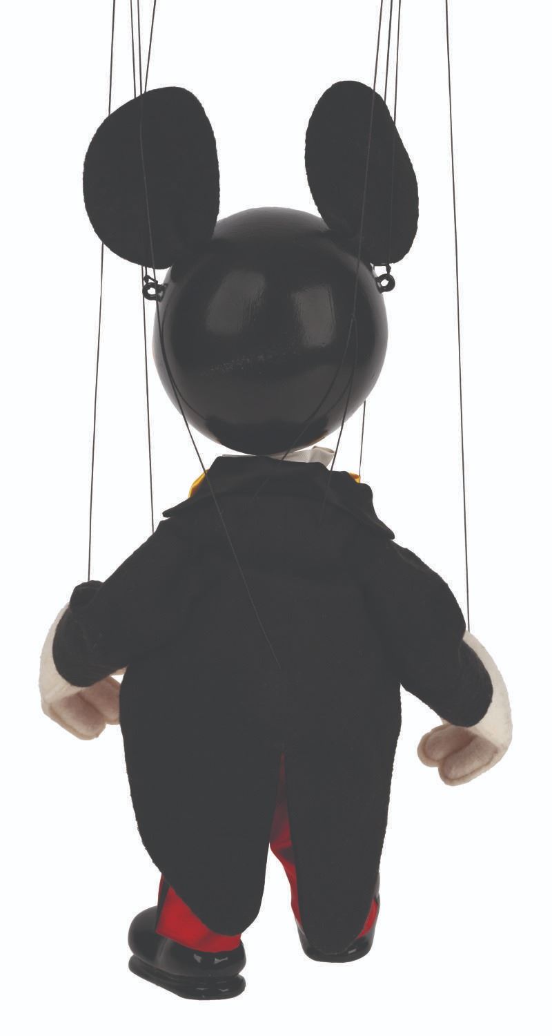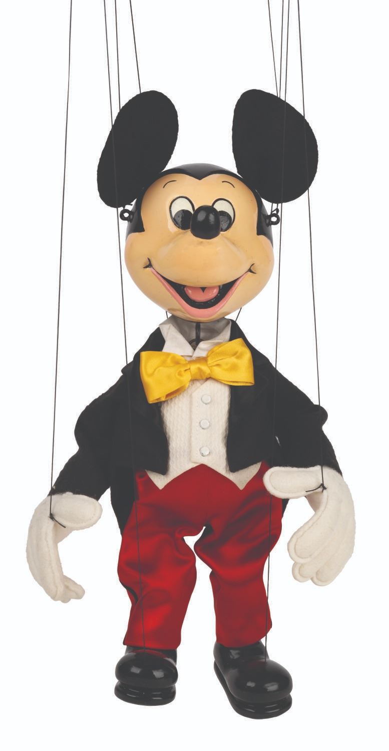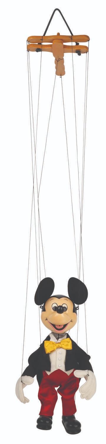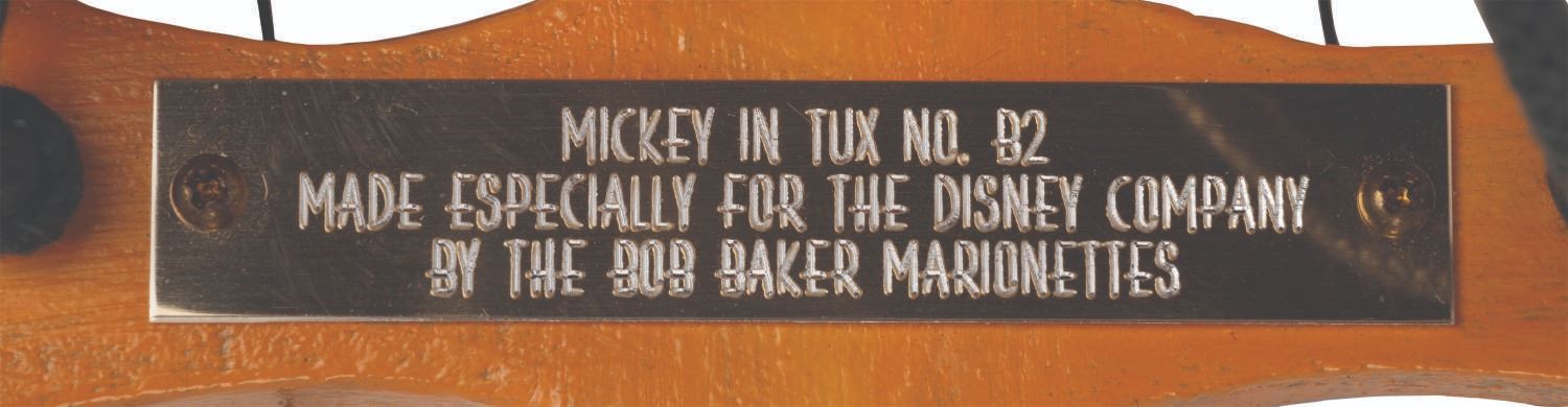 (Bob Baker, 1990s) A limited edition Mickey Mouse marionette "made especially for Walt Disney Productions by the Bob Baker Marionettes." Bob Baker Marionettes manufactured puppets of licensed Disney characters from the 1950s until the 1990s. Measuring approximately 12.5" tall, this hand-painted wooden Mickey Mouse No.59 Puppet features cloth ears, hand-painted features, and a Walt Disney Productions note under feet. This collectible displays in very good condition exhibiting minor wear and comes packaged in its original box.