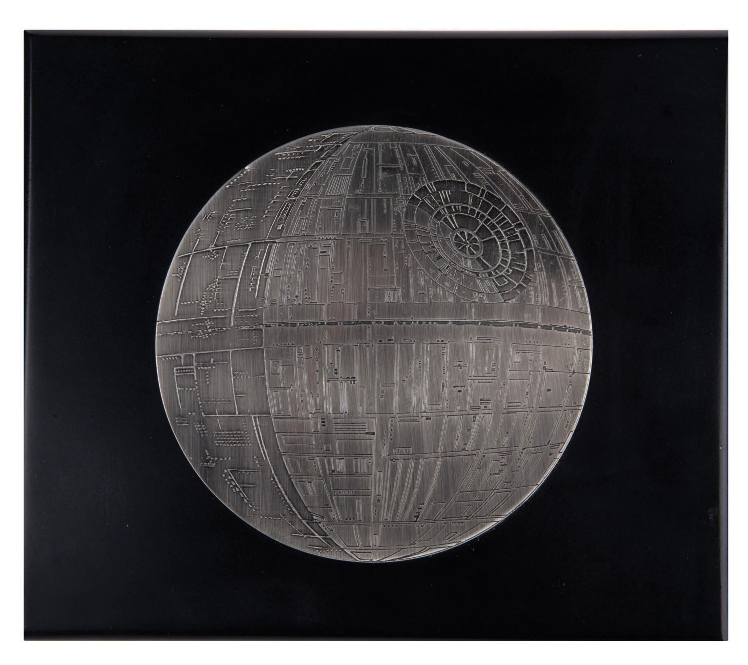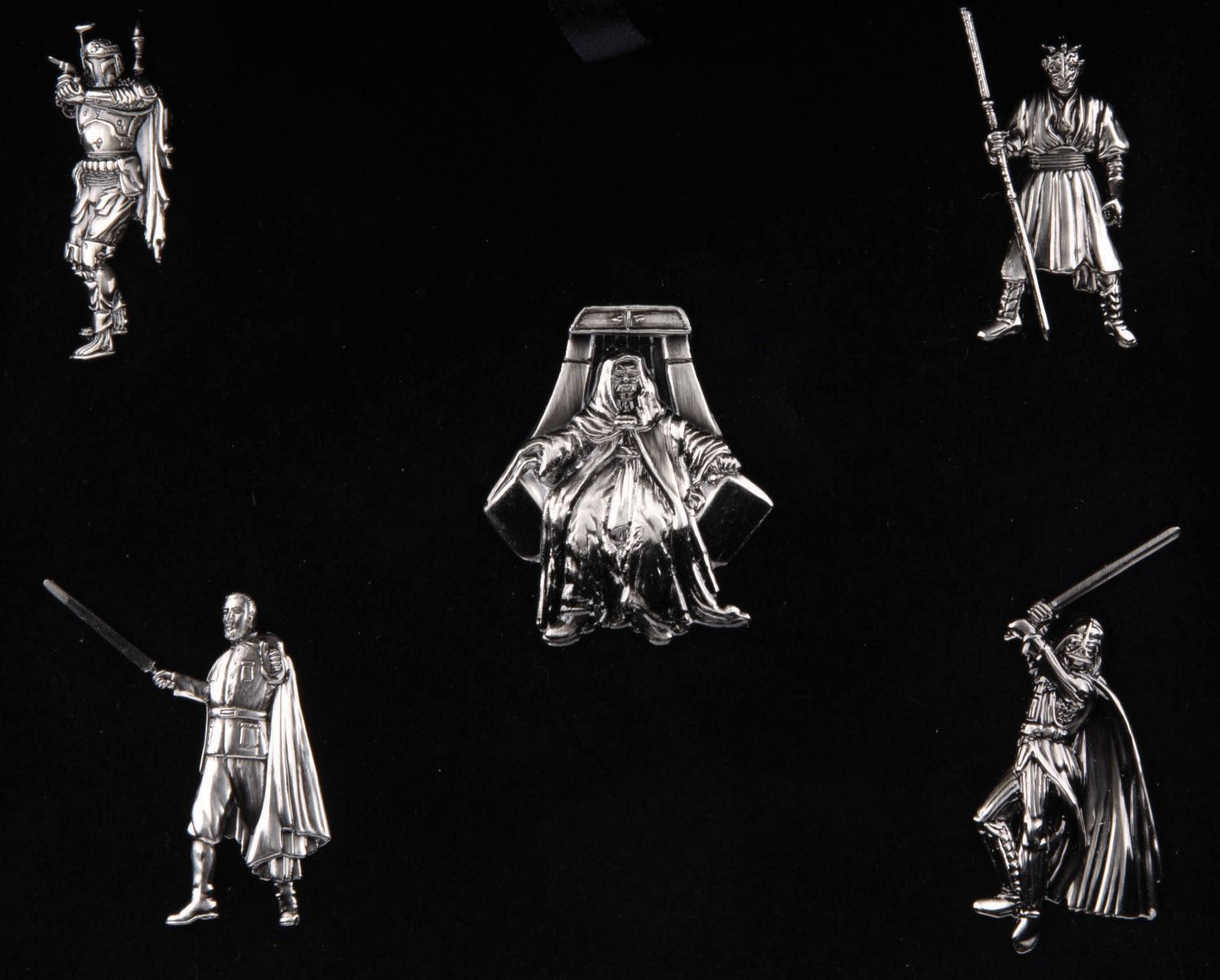 (Disney/Lucasfilm 2003) A Limited Edition Star Wars Weekends villains pin set from the Tatooine Traders shop at the Disney MGM Studios. Included are (5) pins of Star Wars villains Boba Fett, Darth Maul, Count Dooku, Darth Vader, and the Emperor, all presented in a lacquered box with 5" metal Death Star on the lid, and released in an edition of 500. The pins, measuring up to 3"x2" each, are in very fine condition. The 8.25"x7" box is in good condition, with some scuffing including a 1.5" scratch on the lower right inner edge.