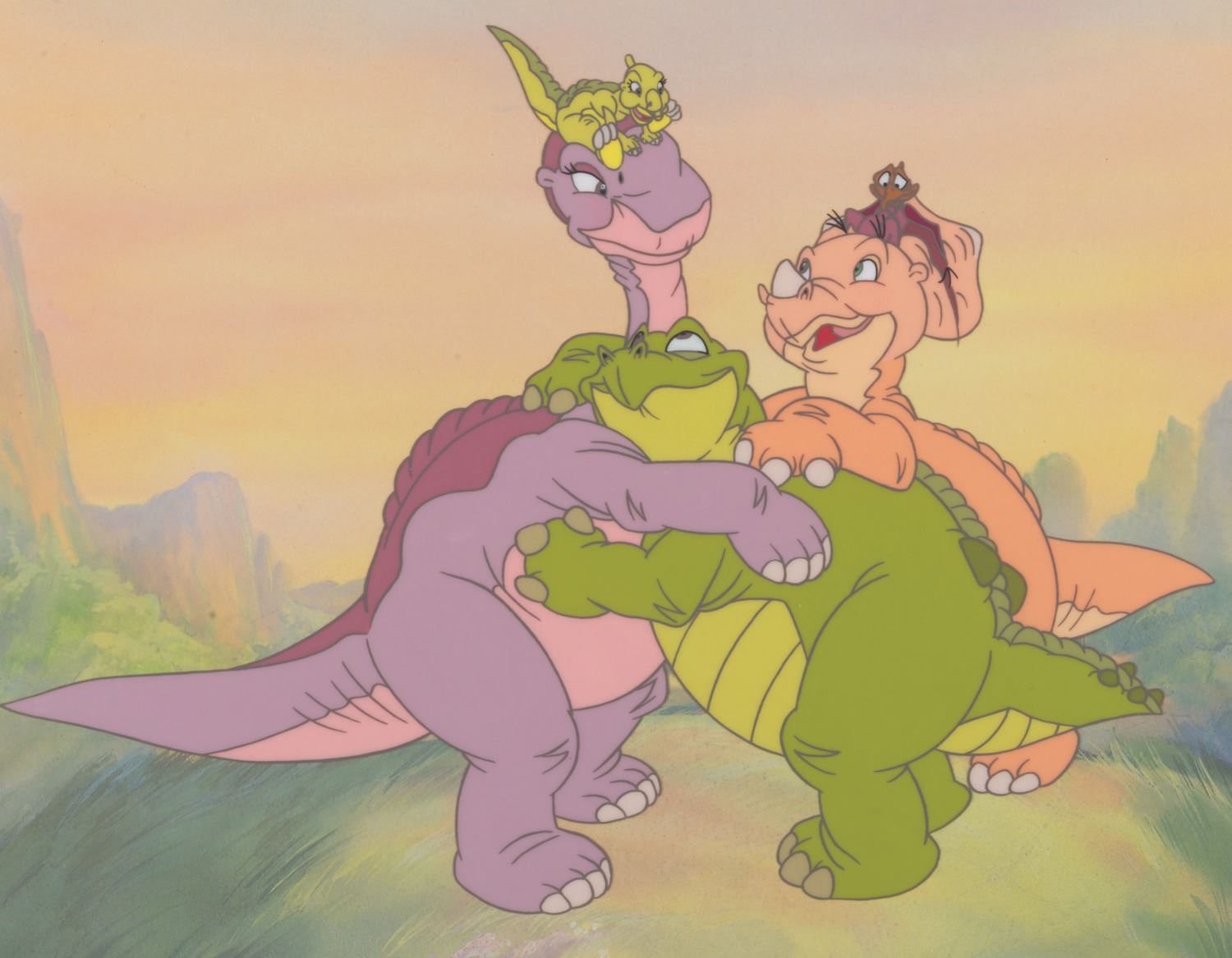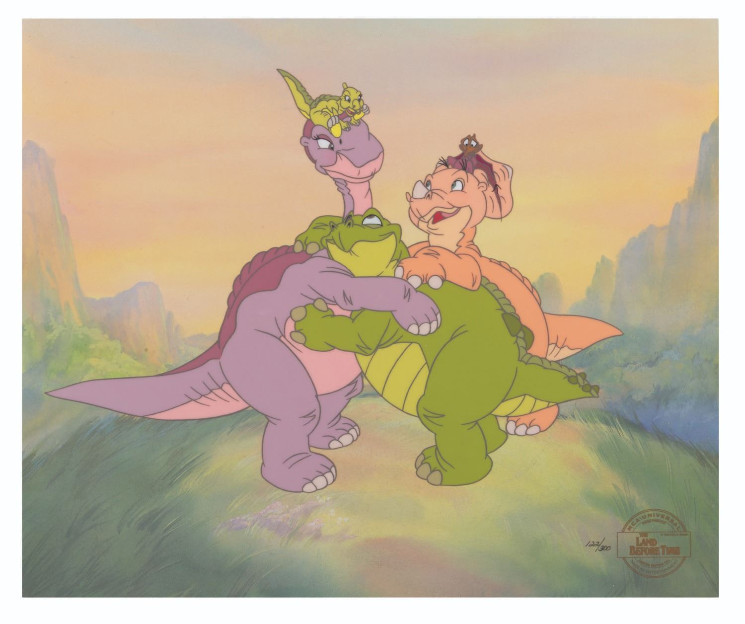 (Universal, 1988) A hand-painted limited edition “Family Portrait” cel of Littlefoot, Cera, Ducky, Spike, and Petrie from “The Land Before Time.” Numbered 122 of 300, the characters have an image size of 7.75” x 10.25” on a 10.5” x 12.5” cel. The cel is paired with a color reproduction background and is in very good condition with light wear.