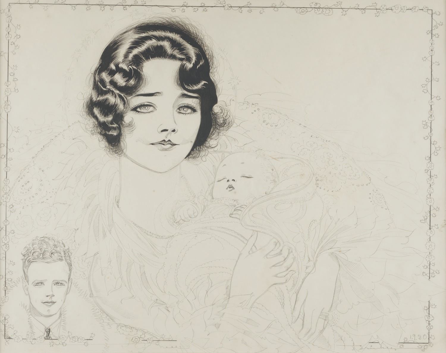 (Brinkley, 1930) An ink on paper drawing titled "Portrait of Charles, Anne Morrow Lindbergh, and Charles Jr." by American illustrator Nell Brinkley. This delicate portrait of the famous aviator and family predates the tragic kidnapping of Charles Jr., which became known as "the crime of the century." Brinkley was a prolific illustrator with a nearly forty-year career in New York newspapers and magazines from the 1910s through 40s. With an image area measuring 14" x 11.5", the piece is in fine condition.