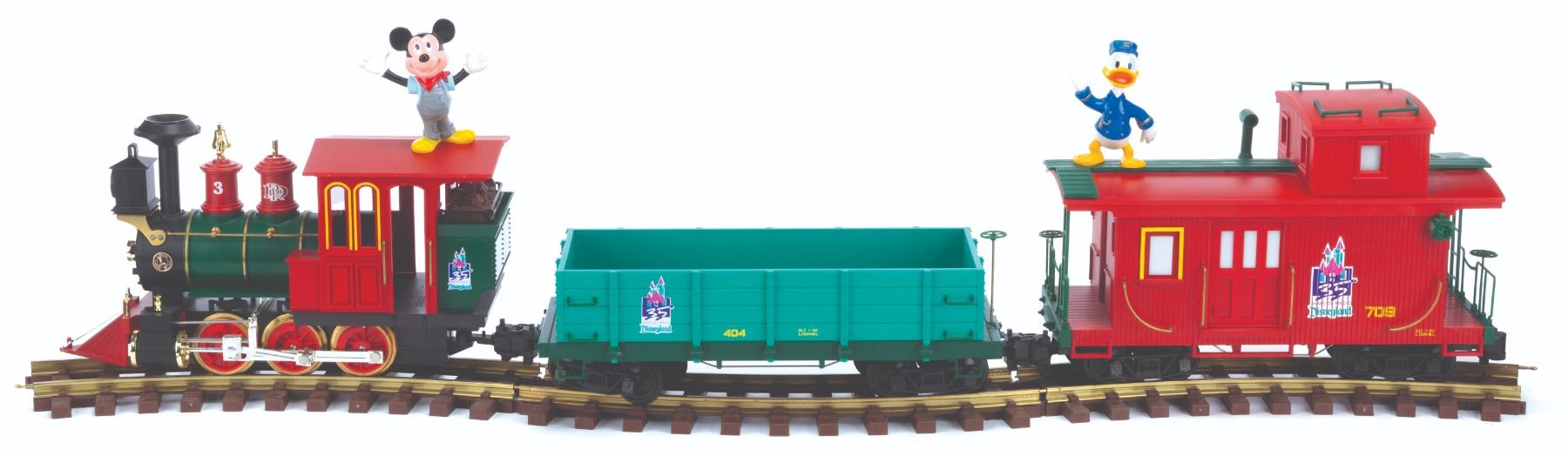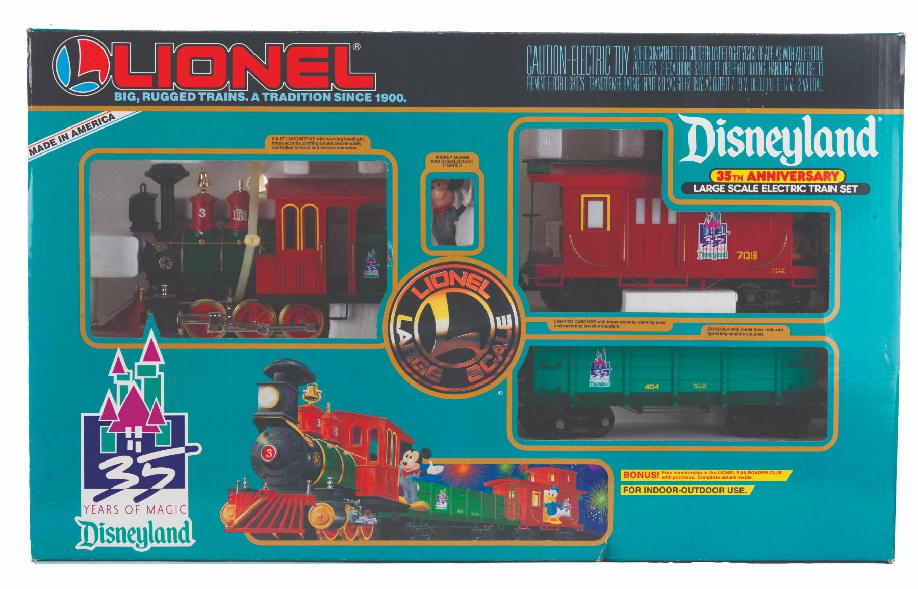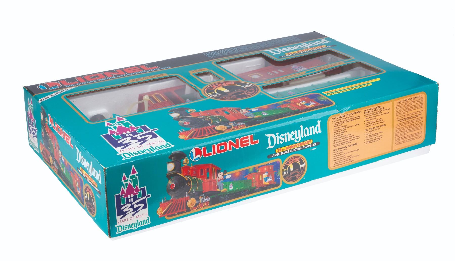 (Lionel, 1990) A Disneyland 35th anniversary large scale electric train set by Lionel. This impressive train includes a locomotive, gondola, caboose, transfer with lockin and wires, instructions, Mickey Mouse and Donald Duck figures, and twelve curving tracks with a 4.3’ diameter. The set’s power and directional functions worked when tested except for the bulbs, which need to be replaced. The smoke feature could not be tested as the Lionel smoke liquid is not included. With parts ranging in size from 11.5” x 5.5” x 6.5” tall to 13” x 4” x 3.75” tall in its 30.75” x 18.75” x 5.75” tall original box, the train set is in fine condition.