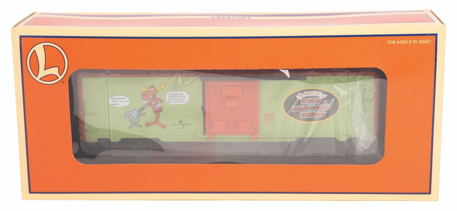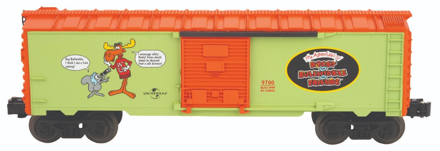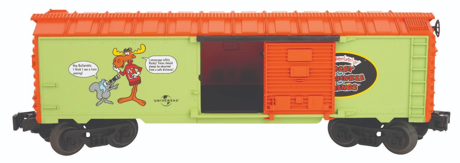 (Lionel, 1999) An “O” gauge train car featuring an image of Rocky and Bullwinkle on each side with “The Adventures of Rocky and Bullwinkle and Friends” logo. The car features sliding doors, plastic trucks, operating knuckle couples, metal wheels, and axles. Measuring 10.25” x 3.5” x 2.5”, the car is in fine unused condition, with the original 13.25” x 3” x 5.5” box in good condition with a light crease to the top and separation to the cellophane window.