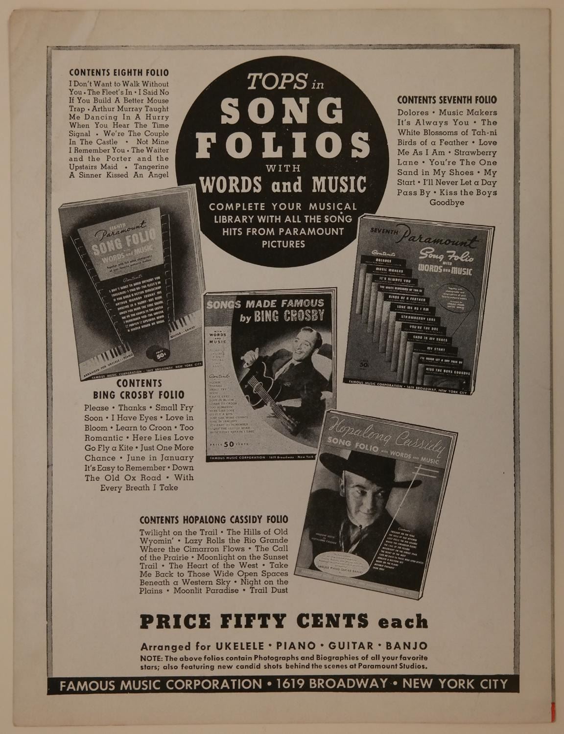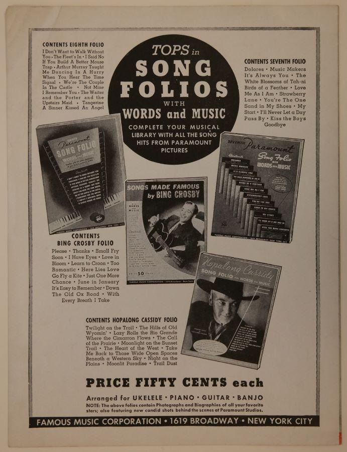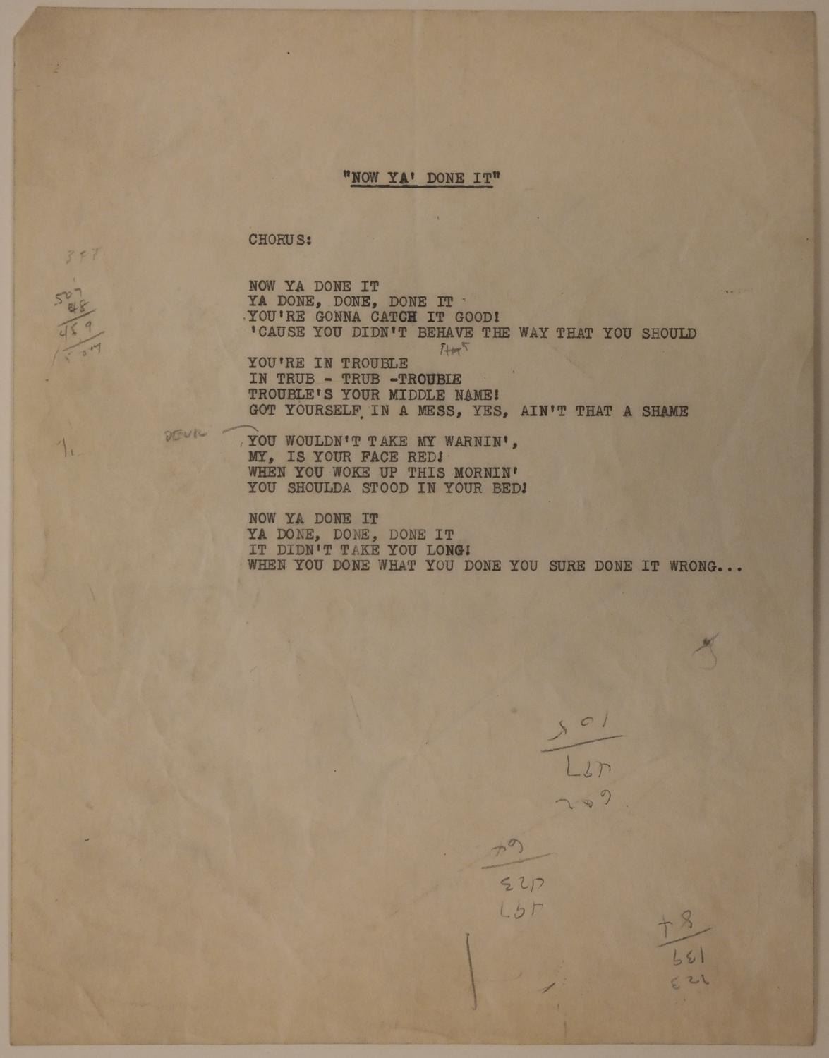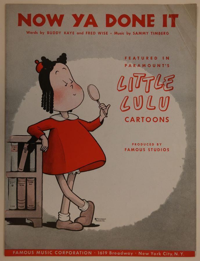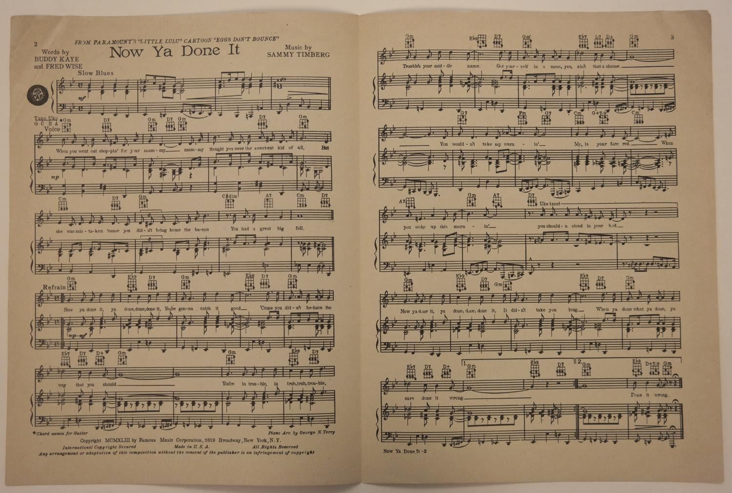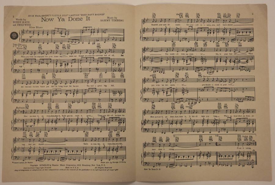 (Famous Studios, 1943) A sheet music folio for “Now Ya Done It” from the Famous Studios “Little Lulu” short “Eggs Don't Bounce.” Also included is a separate sheet with the chorus lyrics to “Now Ya Done It,” which was created at the studio and used during the production of the short. Measuring 9" x 12" the folio is in good condition with light creasing and folded corners. Measuring 8.5” x 11” the chorus sheet is in good, production-used condition with creasing, soiling and pencil notes throughout.