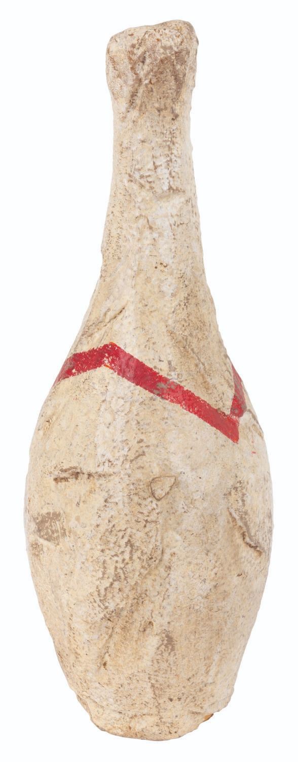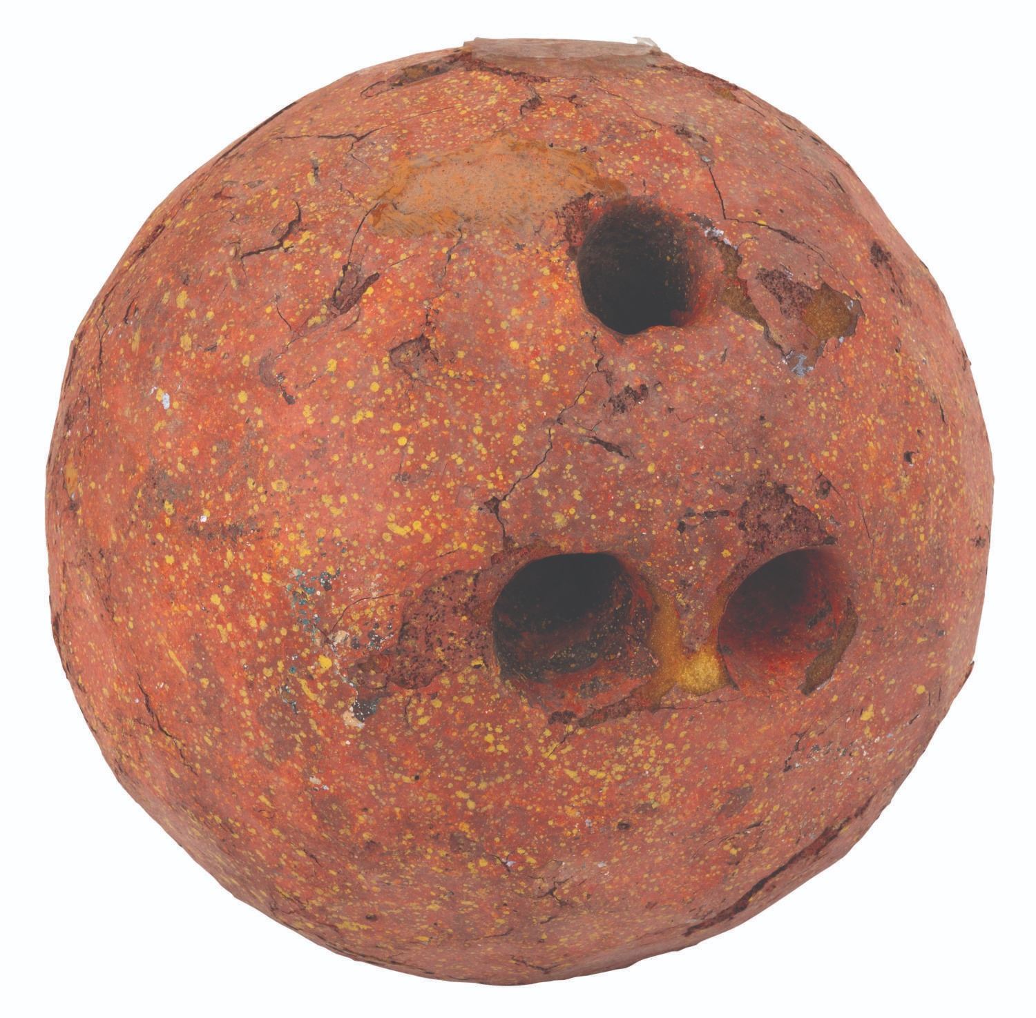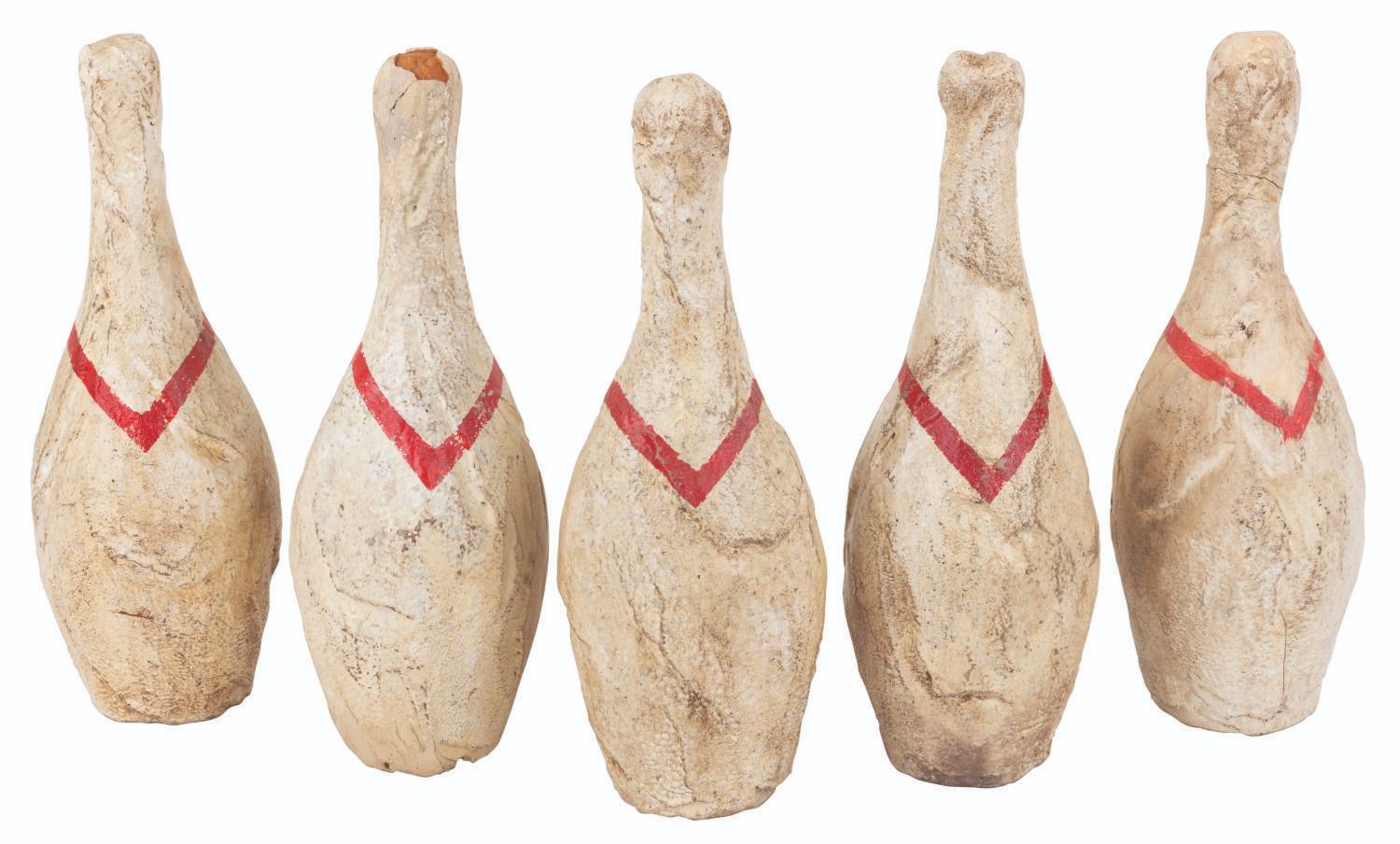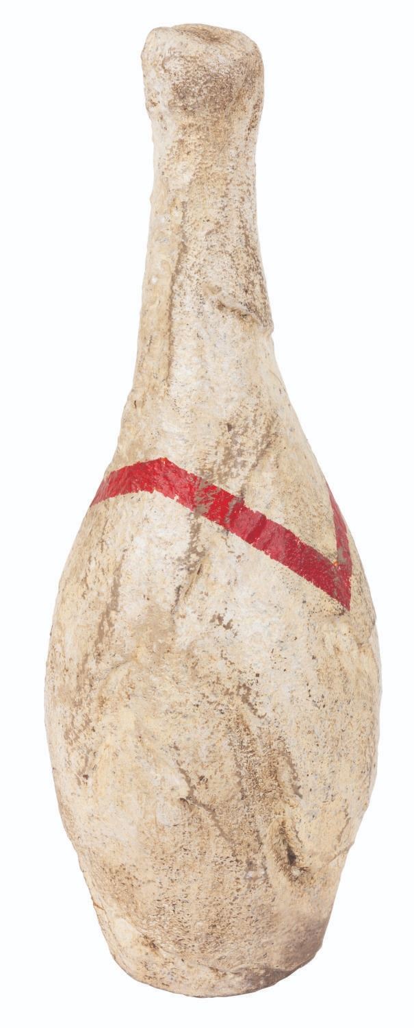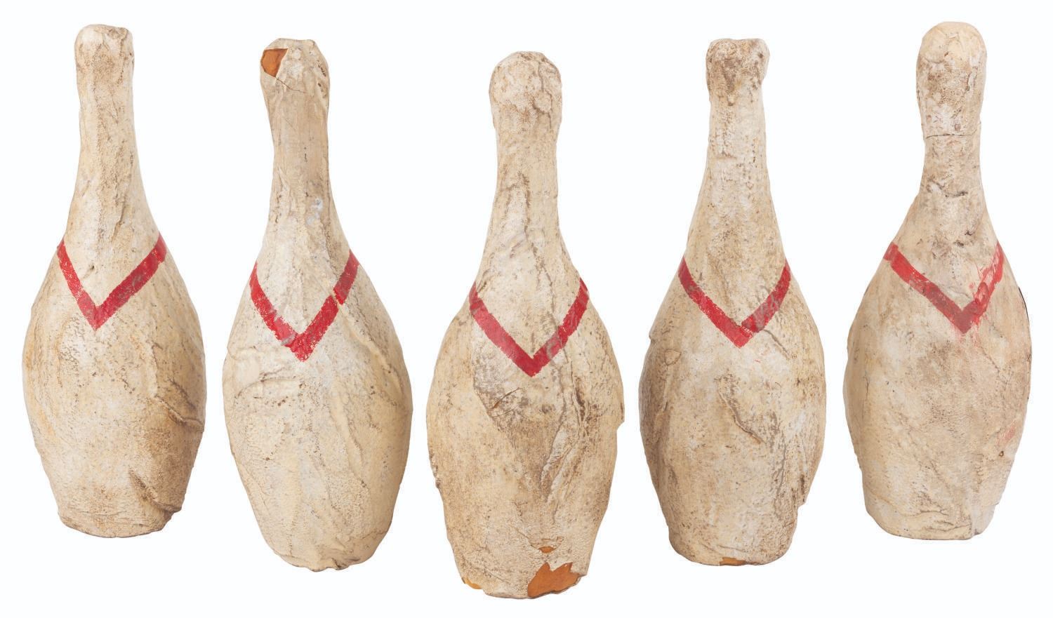 (Universal, 2000) A screen-used bowling ball and five pin props from “The Flintstones in Viva Rock Vegas,” seen in the scene where Fred teaches Wilma how to bowl. One of the pins matches the prop held onscreen by the pin-changing monkey. The bowling ball measures 9” in diameter and the foam-cast pins are 16” tall and 5” in diameter, in good condition with wear from production use including cracks, material loss, glue residue, paint loss, and scuffs.