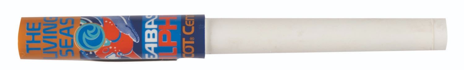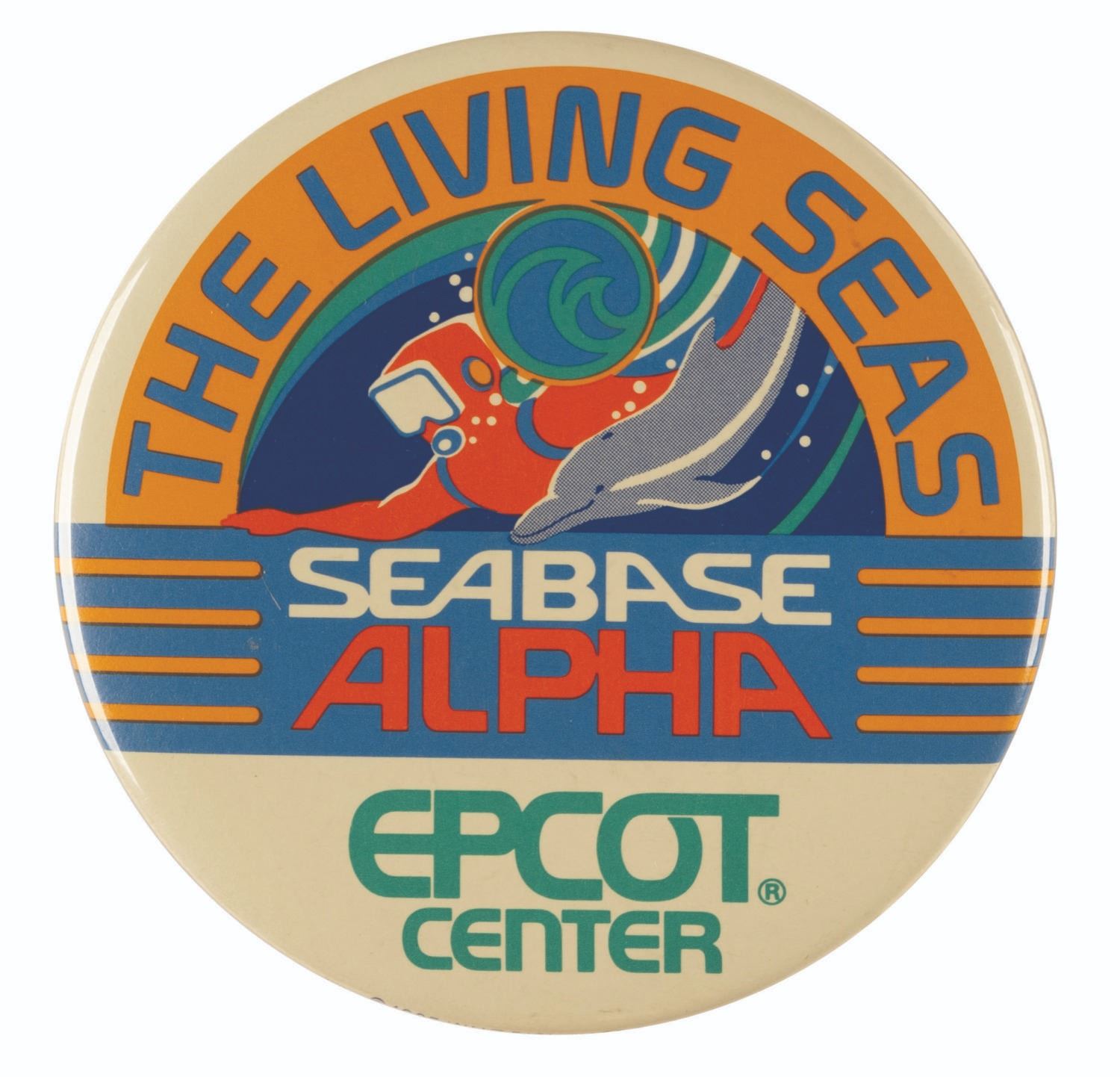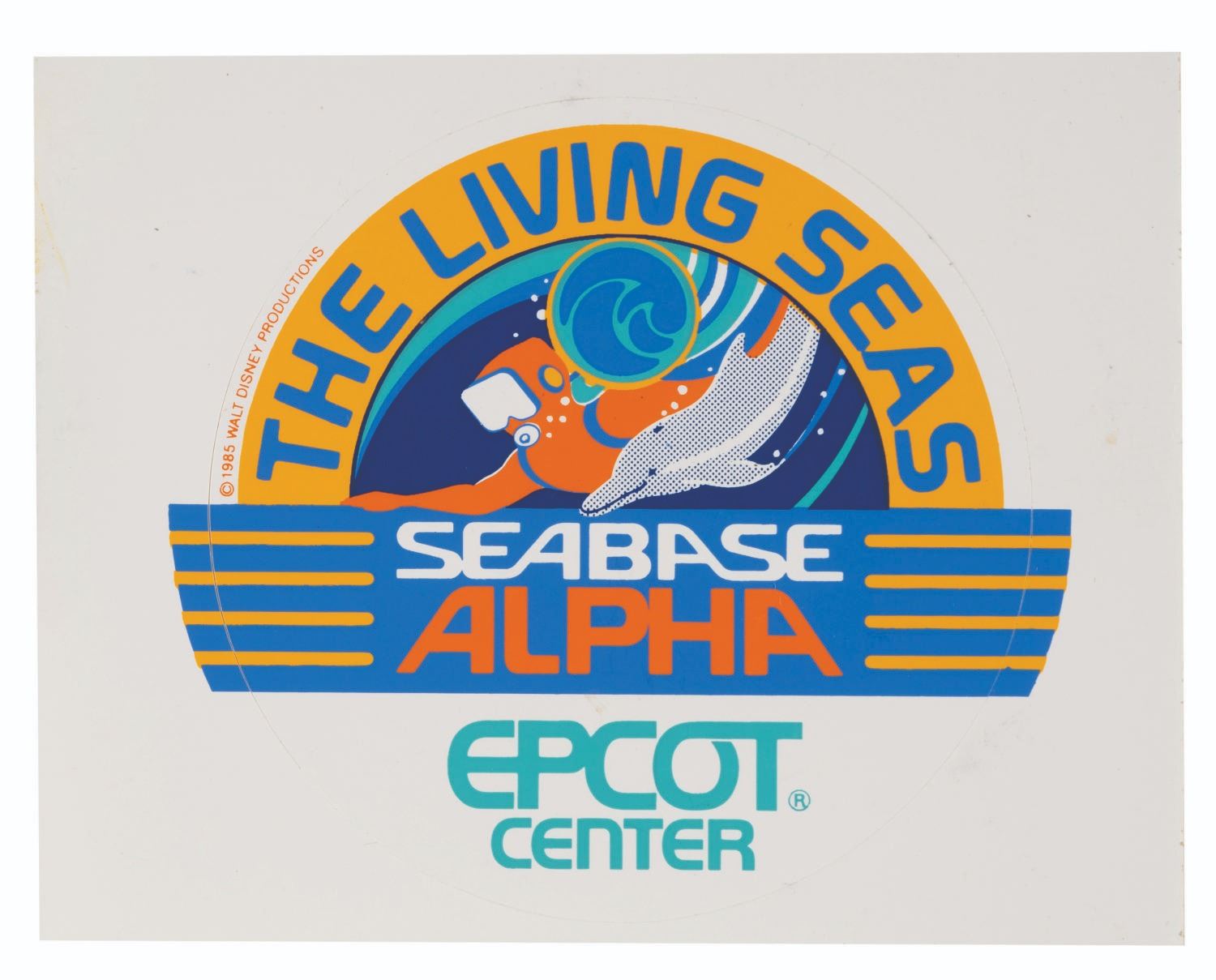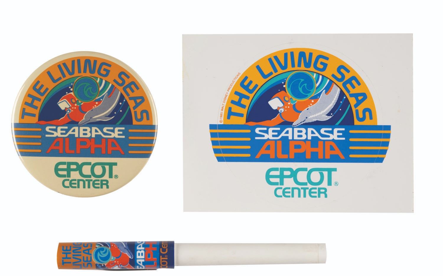 (EPCOT Center, 1985) A Living Seas Sticker, Pen and button from EPCOT Center. This collection of early souvenirs features logos and imagery associated with the recently opened Seabase Alpha and The Living Seas Pavilion. The pen measures 5.5” long, the pinback button is 3” in diameter, and the sticker measures 5”x3.75”. Each piece is in very good condition with few scuffs and minor wear.