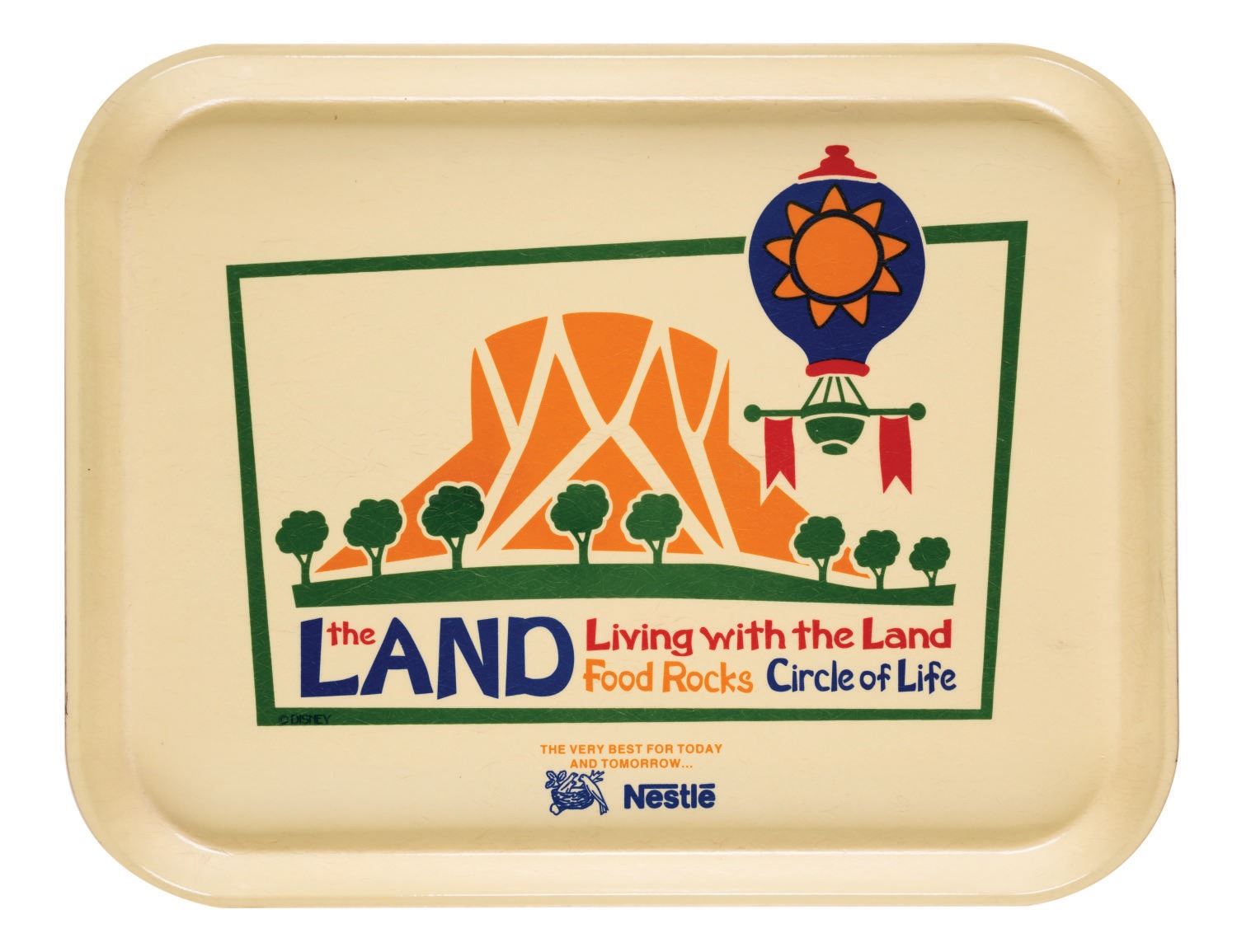 (EPCOT, 1993) A Living with the Land table service tray from EPCOT Center at Walt Disney World. The tray features colorful imagery of hot air balloons over the pavilion with the name of participant sponsor Nestle. Measuring 18"x14", the tray is in very good condition with crazing, scuffs, and scratches throughout from Park use, handling, and age.