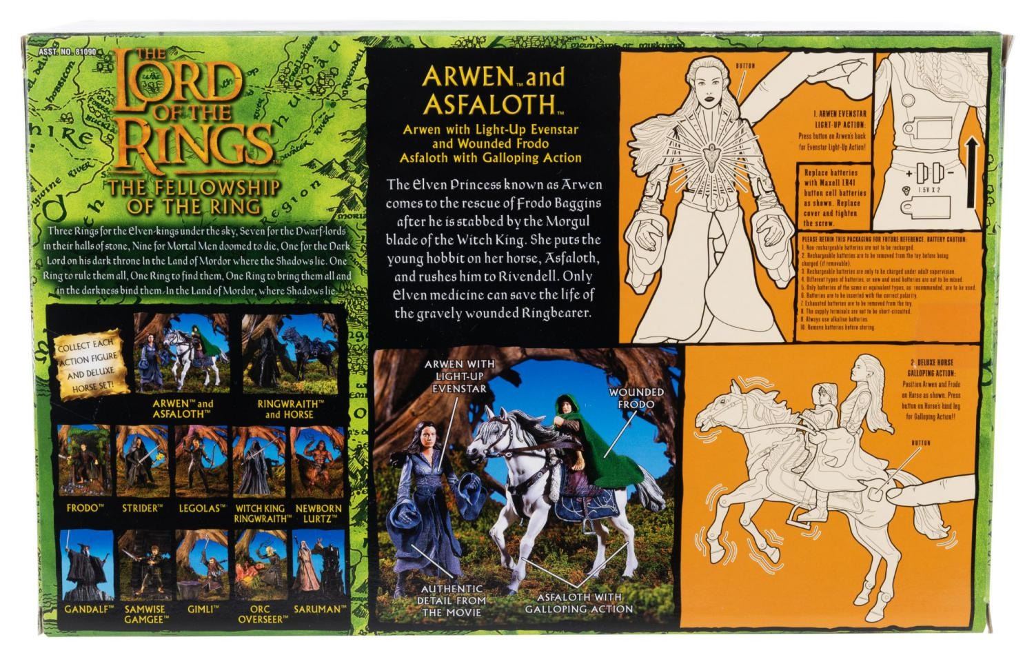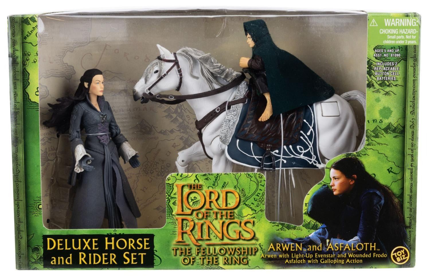 (Toy Biz, 2001) A Deluxe Horse and Rider set featuring Arwen, wouned Frodo, and Asfaloth action figures from "Lord of the Rings: The Fellowship of the Ring." Arwen’s Evenstar lights up with two button batteries, included but likely requiring replacement.In the box measuring 13.5" x 5" x 9" high, the set is in fine unopened condition with typical light wear to the box.