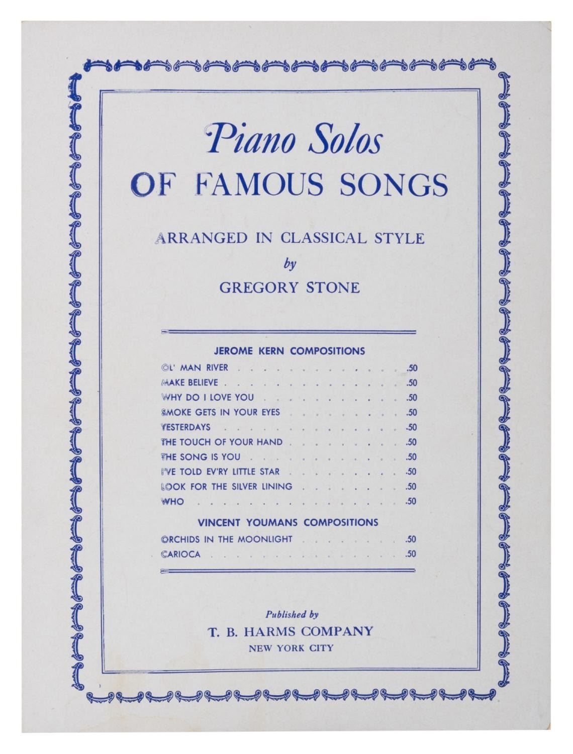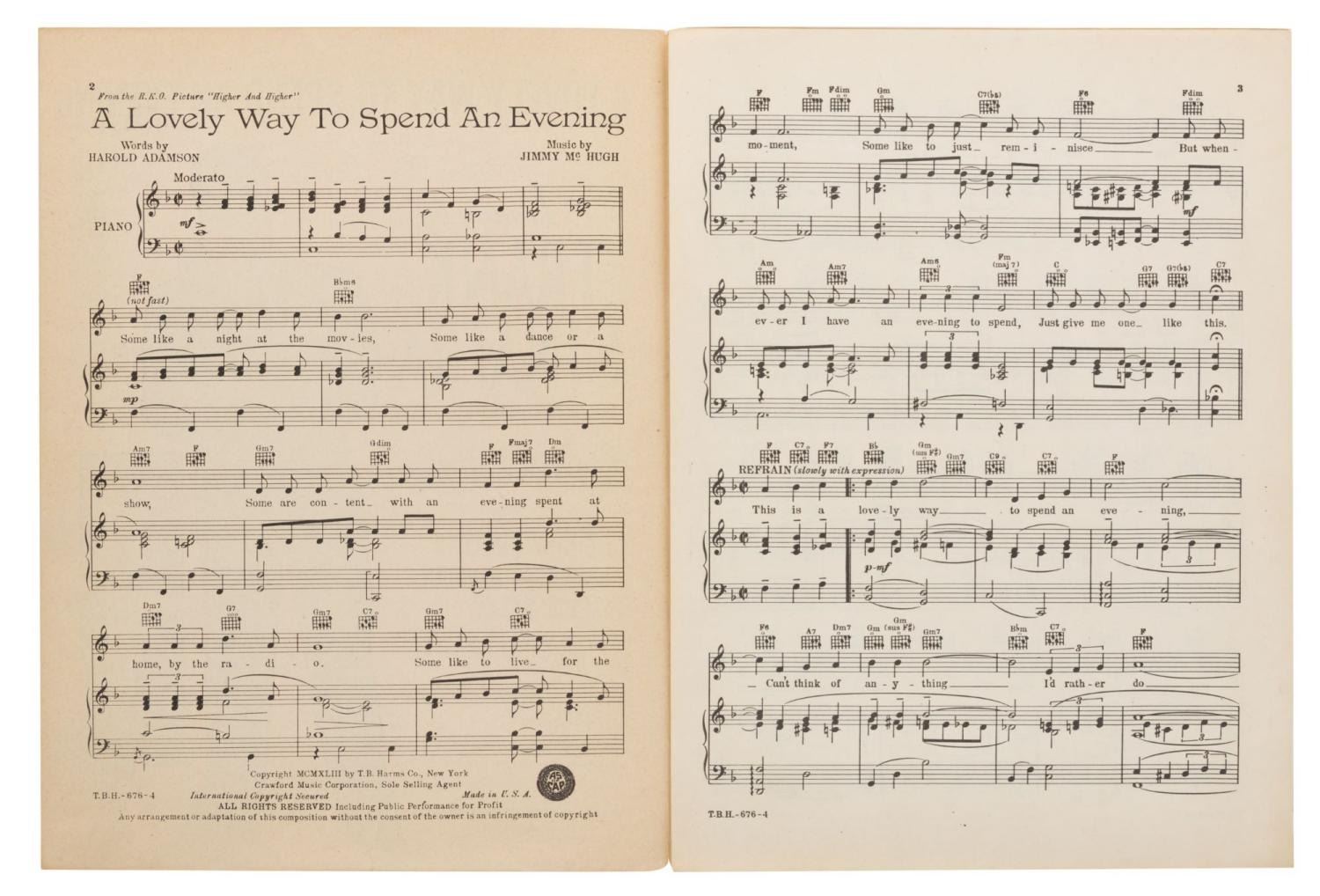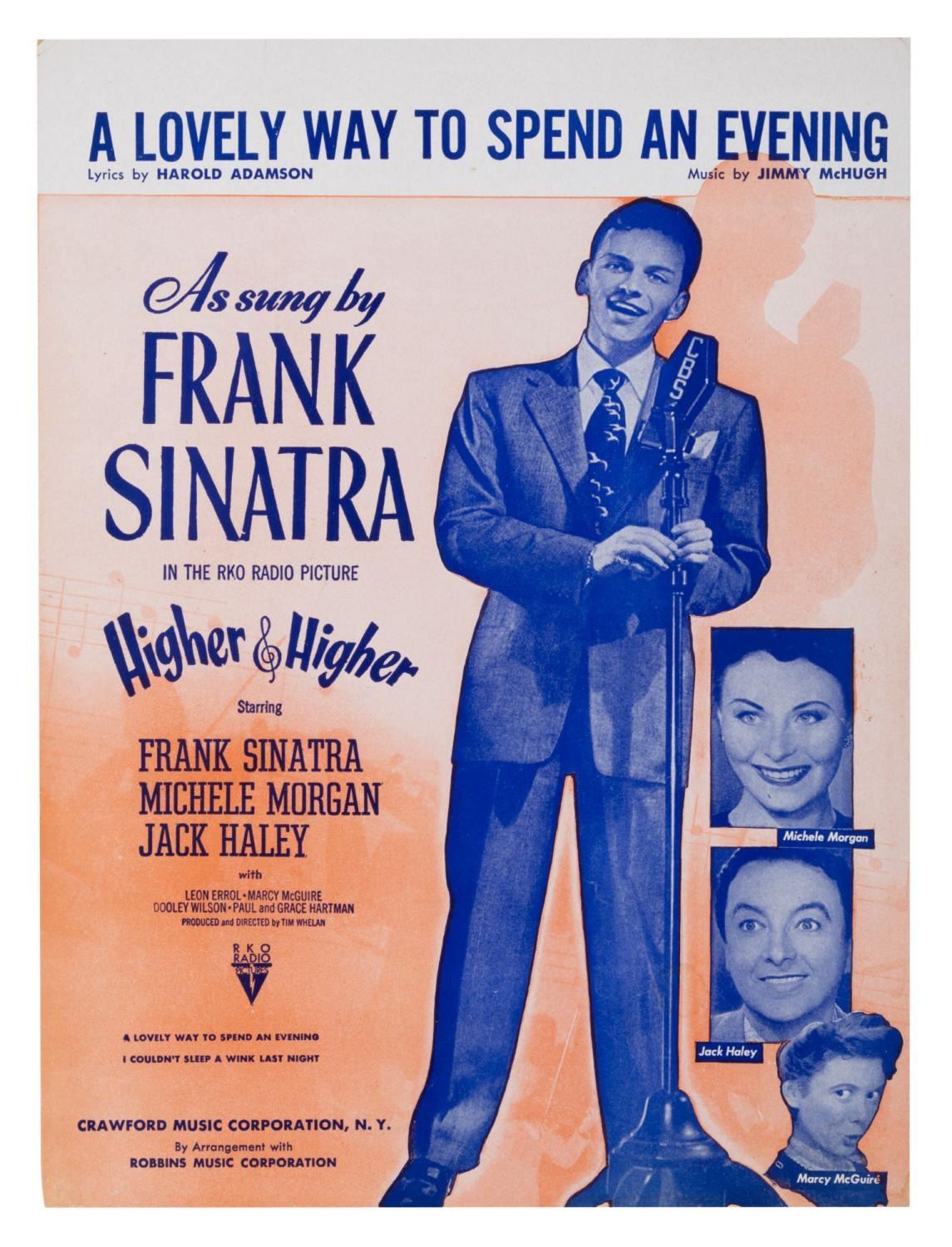 (Crawford Music Corp, 1944) Sheet music for "A Lovely Way to Spend an Evening" from the Frank Sinatra-starring motion picture "Higher and Higher." Measuring 9" x 12" the music is in good condition with discoloration, light creasing and edge wear.