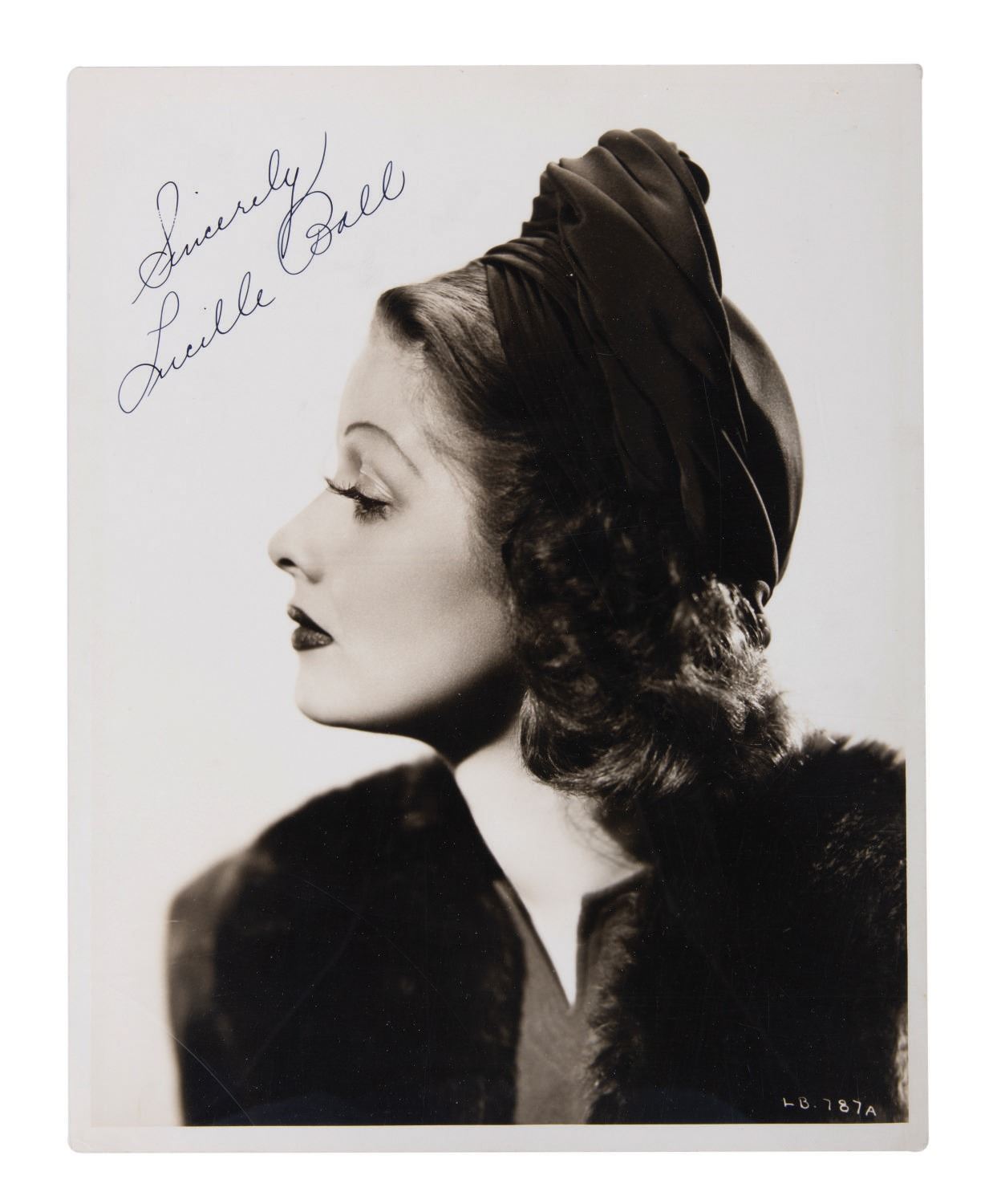 (Lucille Ball, 1940's) An early oversized portrait of Lucille Ball, signed and inscribed by the comedienne. The 11"x14" matte portrait is in very good condition, exhibiting very slight wear and edge toning from age and handling.