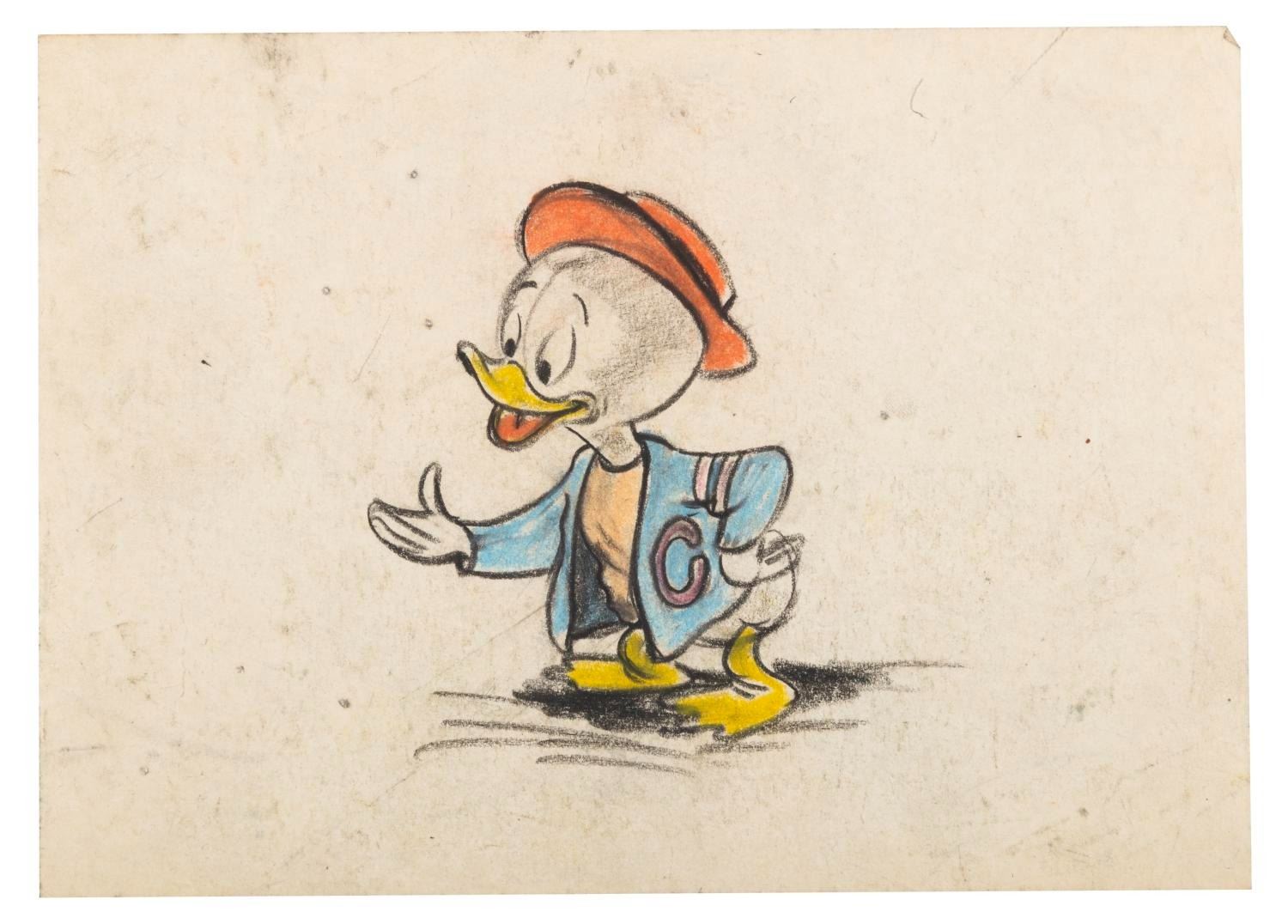 (Disney, 1951) A storyboard panel of one of Donald’s nephews from the short “Lucky Number.” Accomplished in grease pencil and pastels and measuring 6” x 8.25”, the drawing is in very good production-used condition with light wear and smudging.