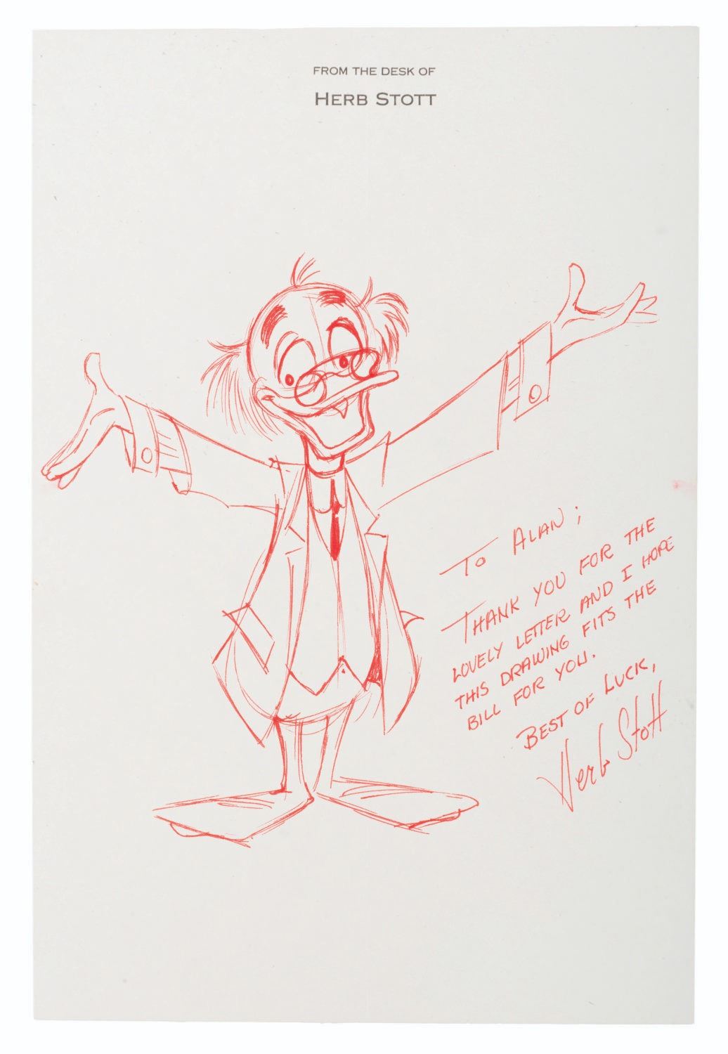 (Stott, 1980s-90s) A Ludwig Von Drake drawing signed with a dedication from artist Herb Stott. Accomplished in red ink, with an image size of 5" x 5.25" on a 5.75" x 8.5" piece of paper, the drawing is in fine condition.
