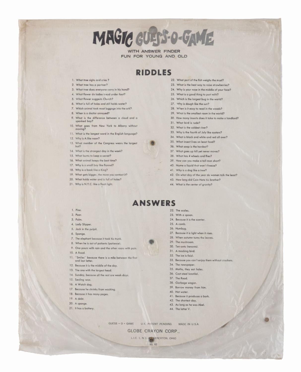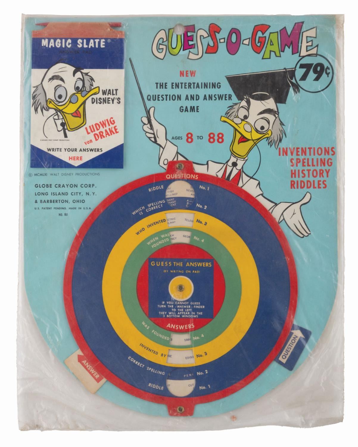 (Globe Crayon Corp., 1961) A Guess-O-Game question and answer game with Magic Slate, featuring Ludwig Von Drake. Measuring 11" x 14" the game is in good, unused condition in its original plastic wrap and exhibits wear from age and storage including scuffing, soiling and discoloration.