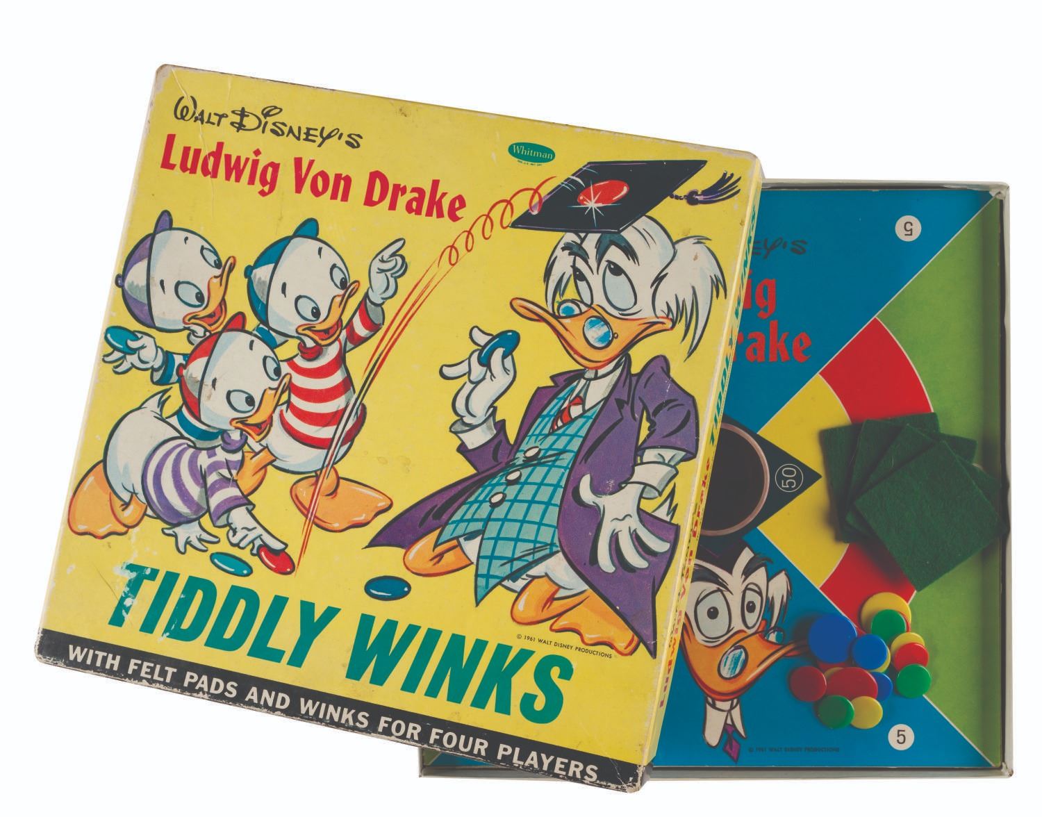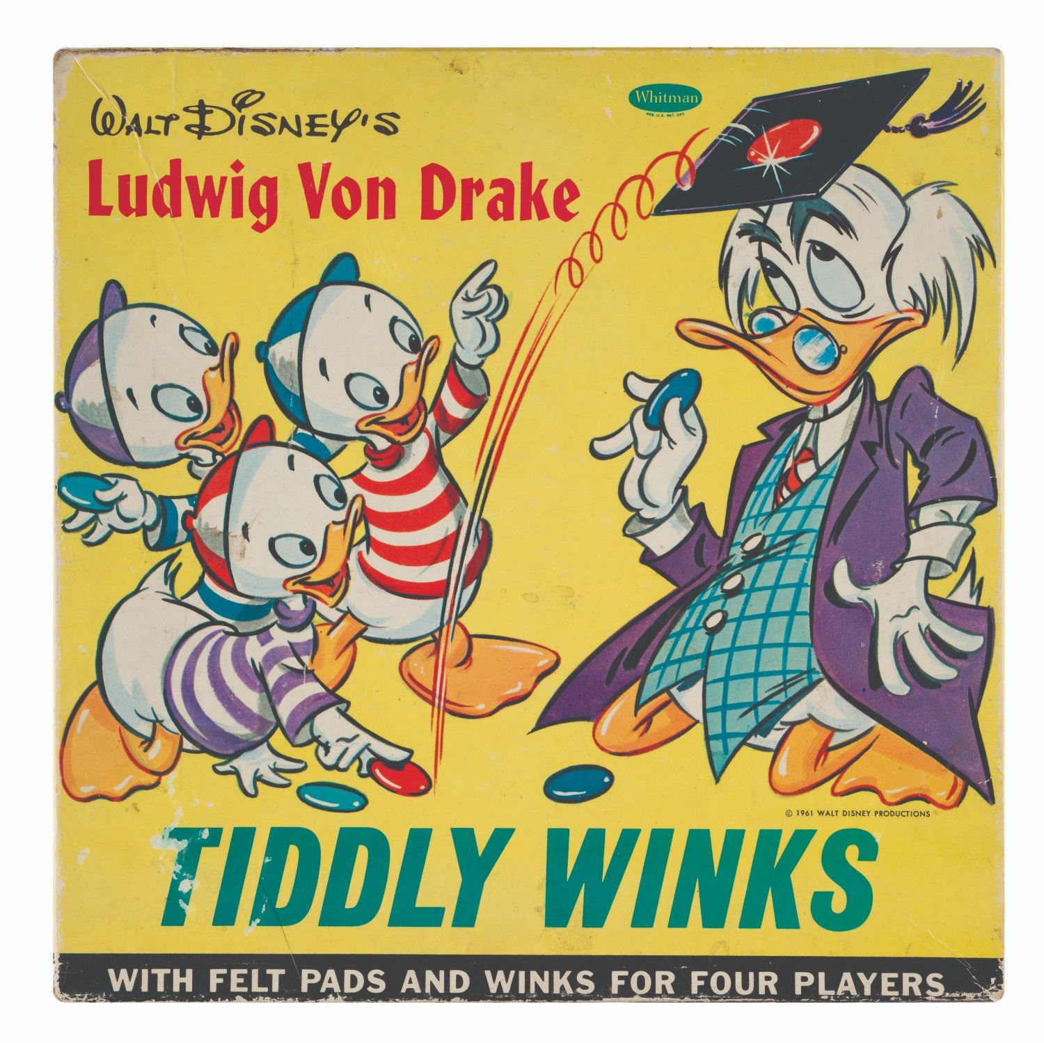 (Whitman, 1961) A Walt Disney’s Ludwig Von Drake Tiddly Winks by Whitman. The game includes 18 game pieces, four felt mats, and one pot with a playing field featuring Ludwig Von Drake - the host of “Walt Disney's Wonderful World of Color.” Measuring 10.25” x 10.25” x 1” deep, the game displays in good condition with edge wear, corner repair with tape, creasing, and light surface loss to the box.