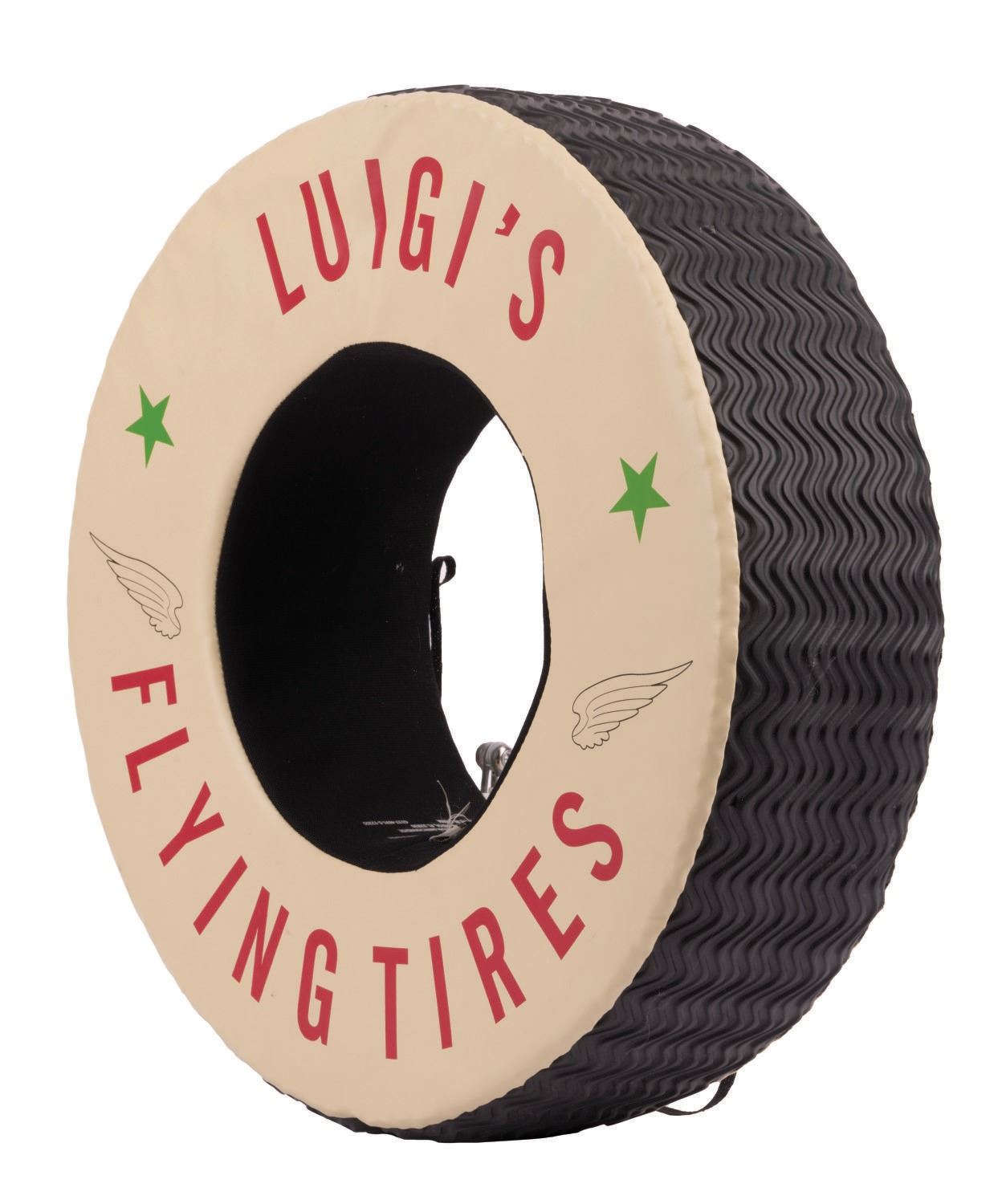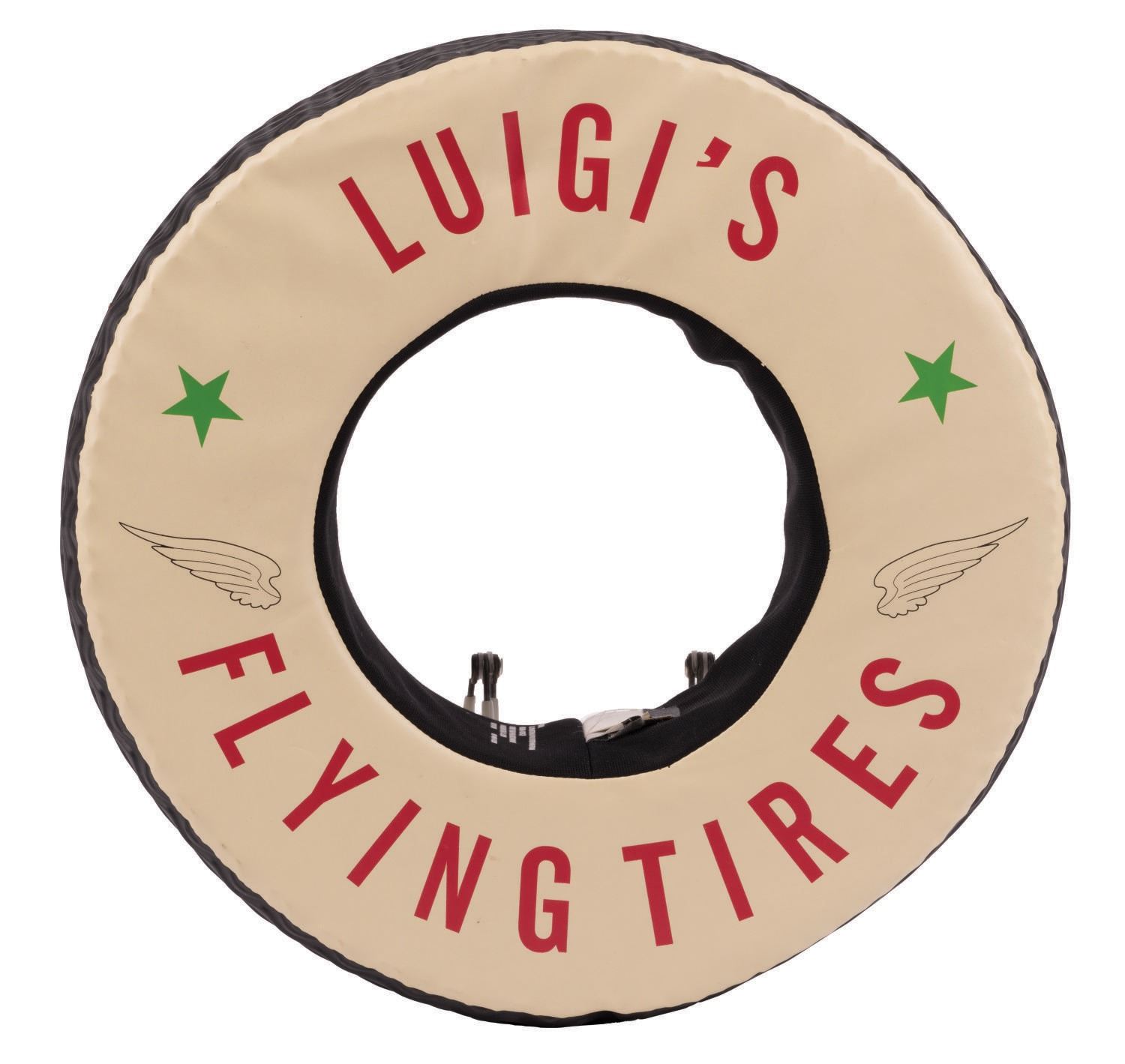 (California Adventure, 2010s) A rare souvenir hat for the short-lived Luigi's Flying Tires attraction in Cars Land. The foam tire reads "Luigi's Flying Tires" on both sides and has a faux tread around the outside. Designed to be worn with the head through the center, the hat has an opening of 7" in diameter and an overall size of 14" in diameter. The hat is in good condition with a few spots of residue and scuffing, and the elastic strap has lost its elasticity.
