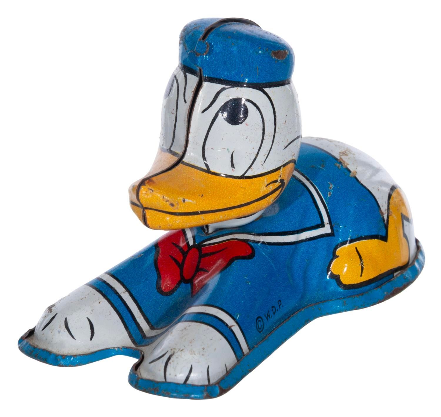 (Disney, 1950s) A Donald Duck rolling tin-litho friction toy manufactured by LineMar. Measuring 1.25"x2.75" and 2" tall, the toy is in fair condition with working wheels, oxidization and light scratching throughout.