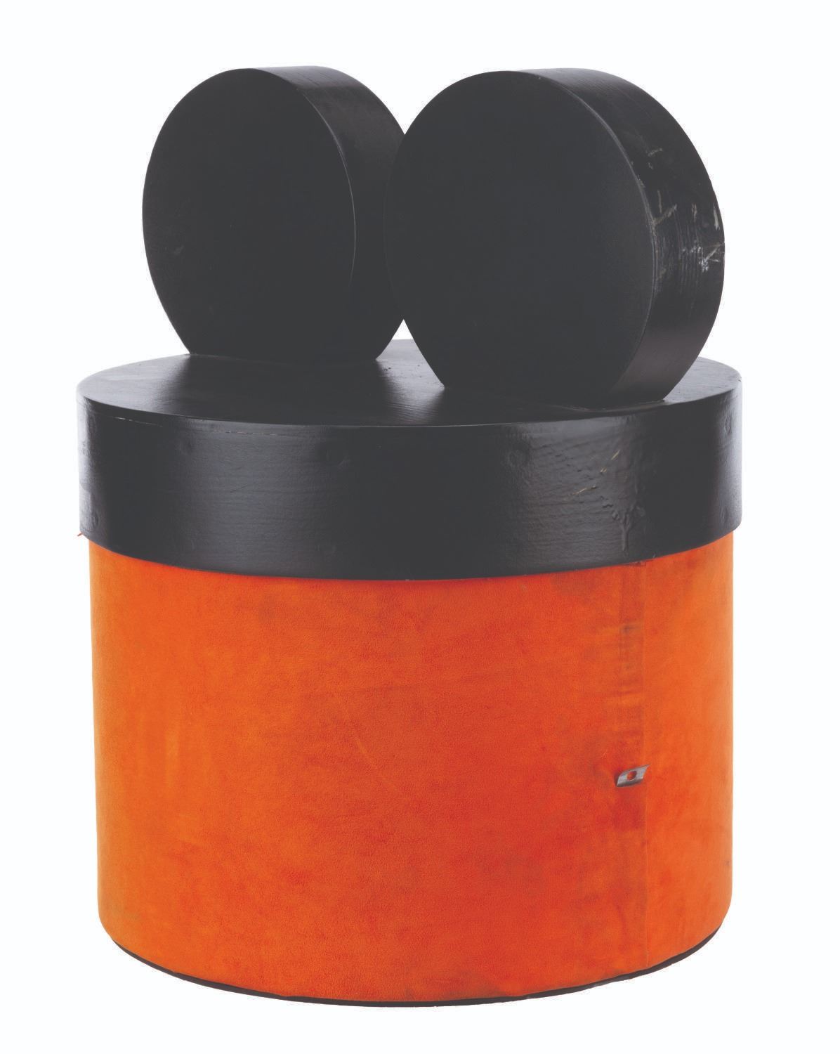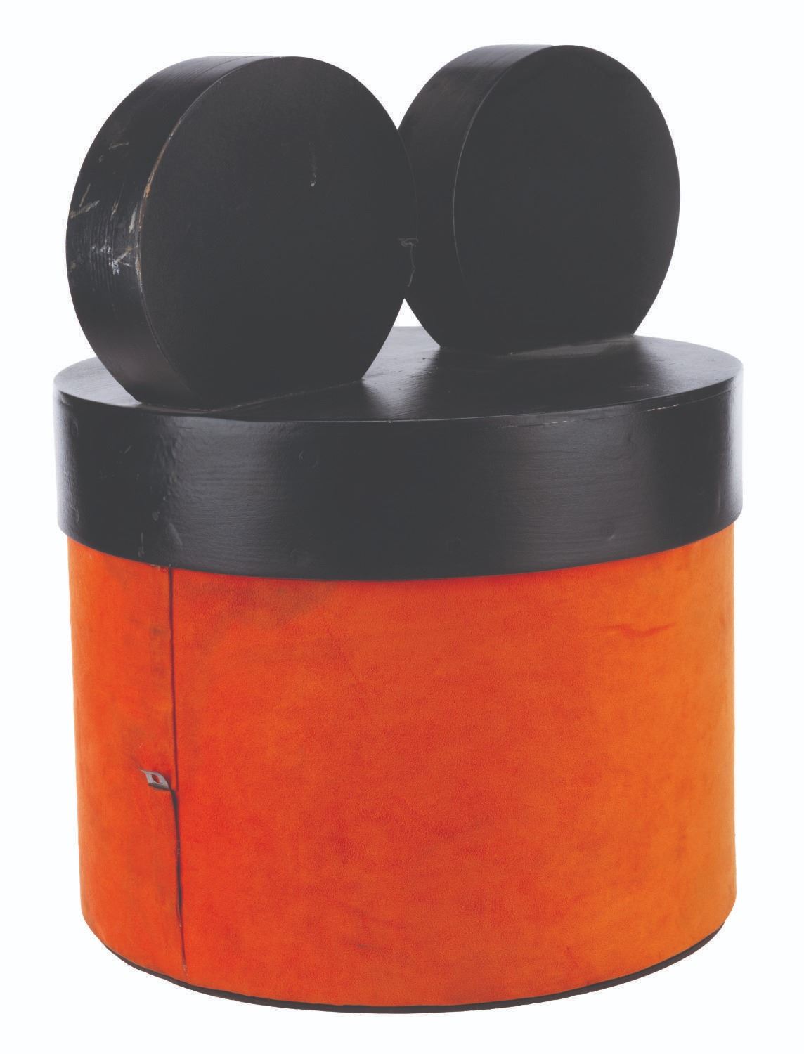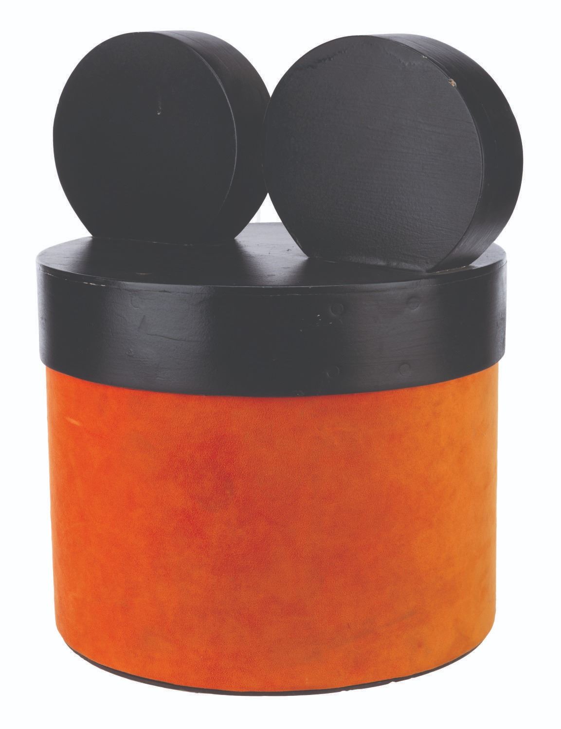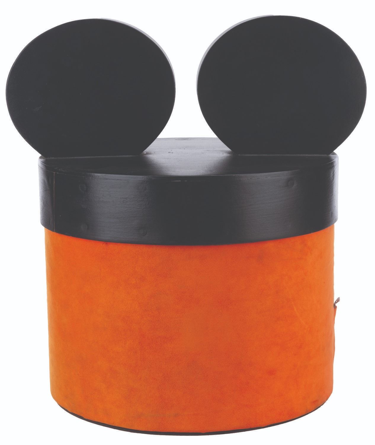 (Disneyland, 1980s-2000s) A Mouse-eared hatbox display piece from a Mad Hatter shop in Disneyland. Measuring 18" in diameter x 19" tall, the prop is in very good condition with light wear from Park display.
