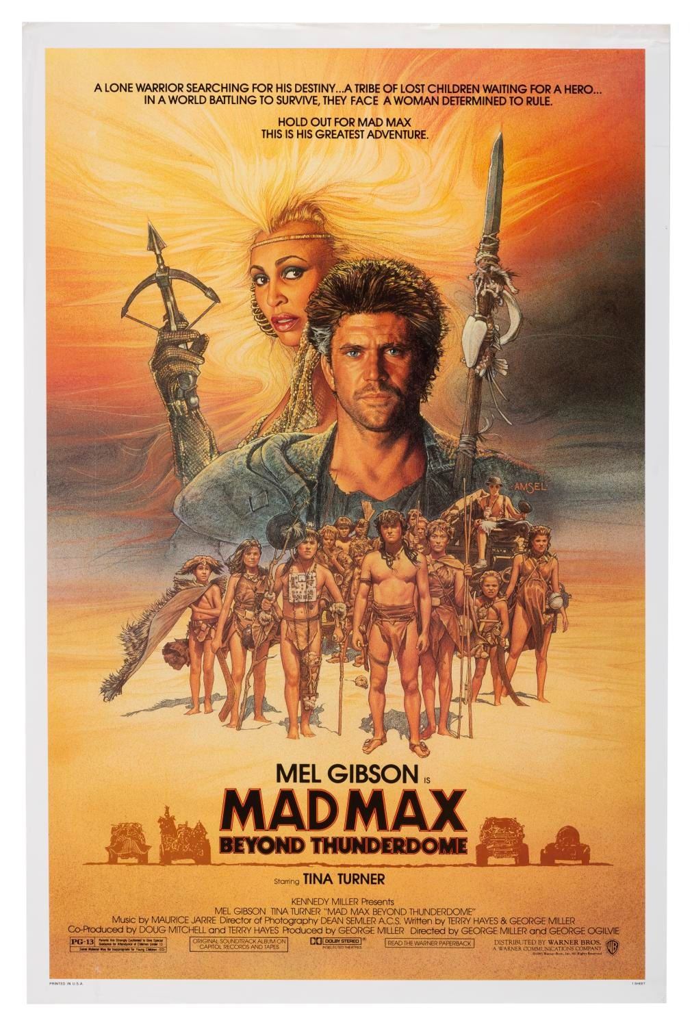 (Warner Bros., 1985) A one-sheet for "Mad Max Beyond Thunderdome" starring Mel Gibson and Tina Turner. Measuring 27" x 41", the never-folded poster displays in very good condition, with very light handling wear, and edge wear mainly along the top border edge, including small creases and tears.