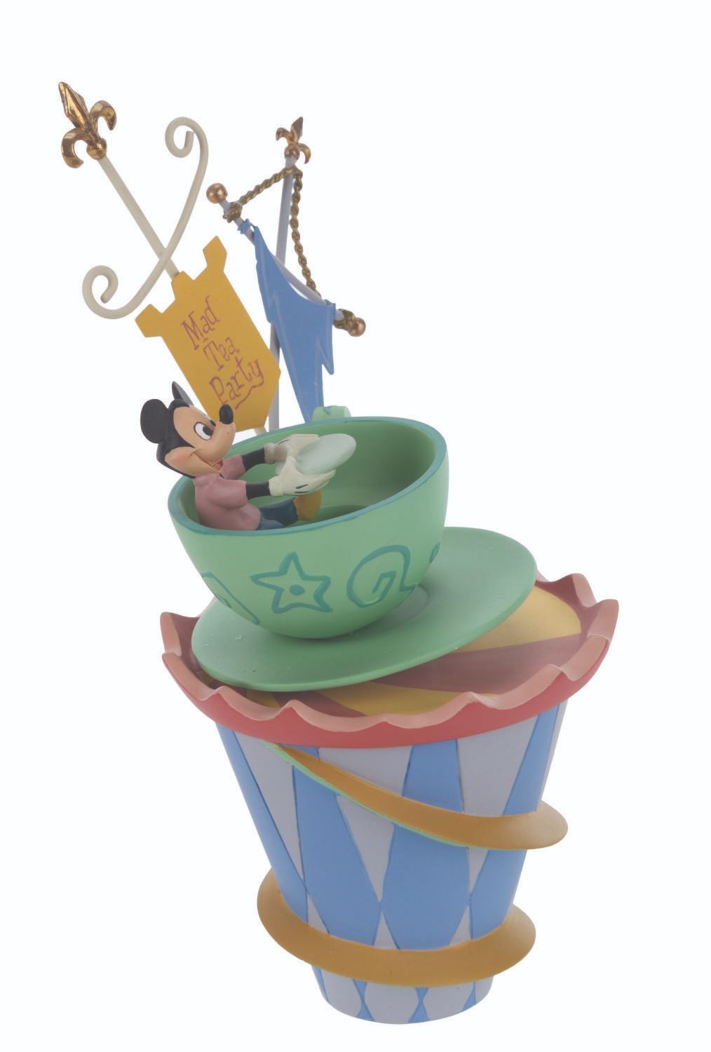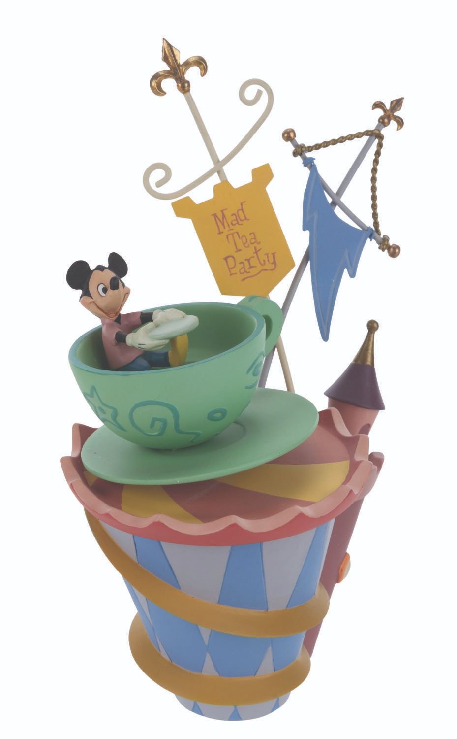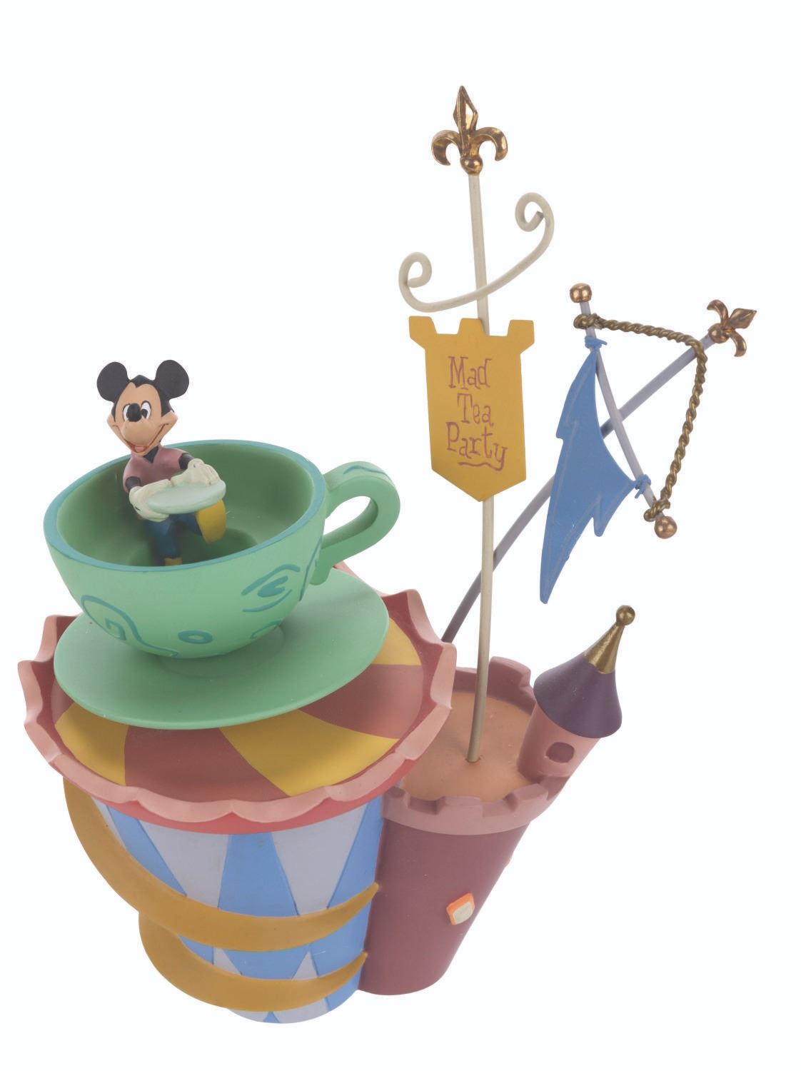(Disneyland, 2005) A Mad Tea Party trinket box designed and sculpted by Kevin Kidney for Disneyland's 50th anniversary. The box is a whimsical tower topped with Fantasyland and Mad Tea Party banners, and the lid features Mickey going for a spin on a Mad Tea Party cup and saucer. Numbered 0087 in an edition of 1955 and measuring 4.5” x 3.5” and 6.75” tall, the trinket box is in fine condition and comes with the original box.