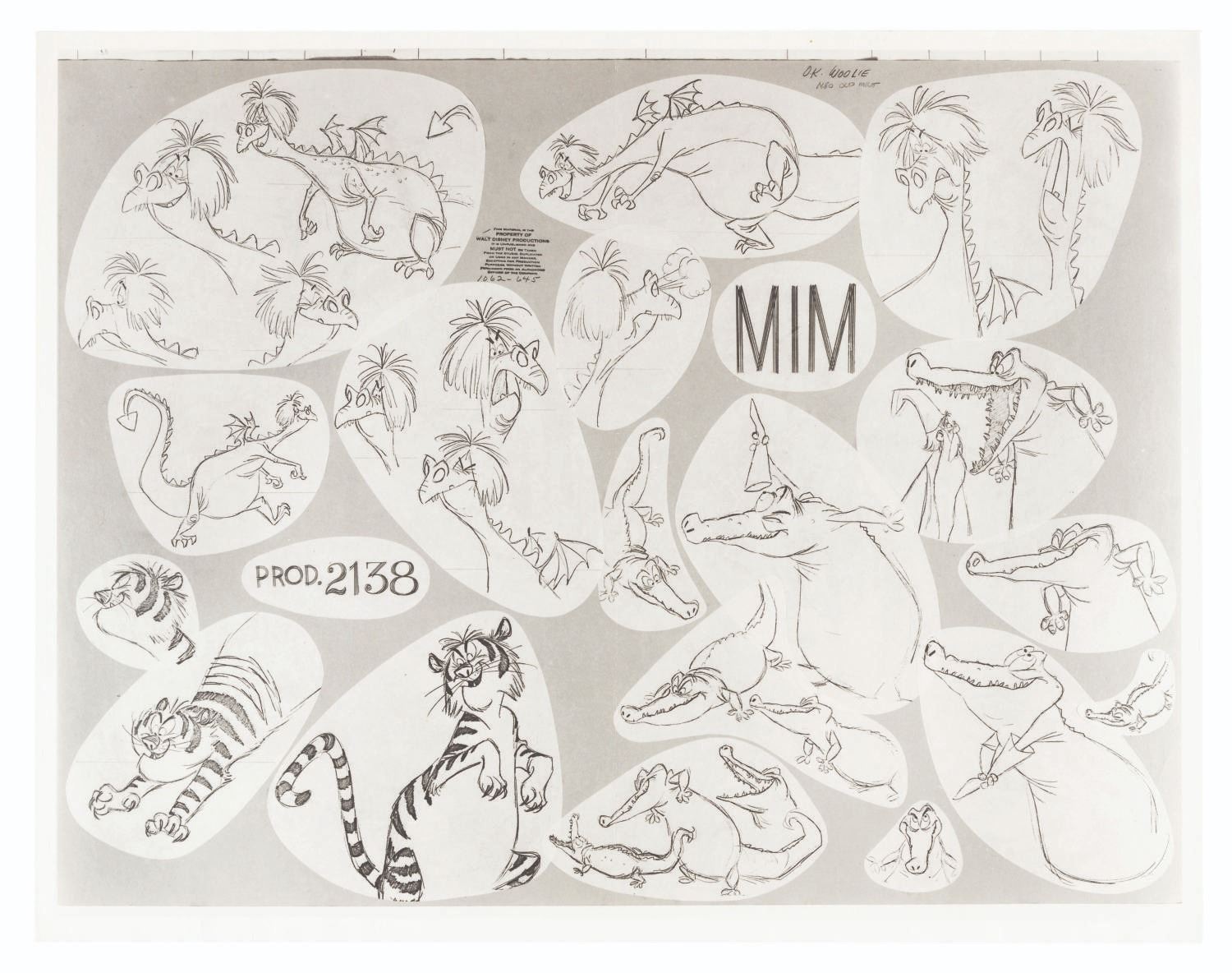 (Disney, 1963) An original photostat model sheet of Madam Mim transformed into various animals for the 1963 feature film “The Sword In the Stone.” Model sheets such as these were distributed to animators and crew working on the film so that everyone could draw the character the same way. Measuring 11" x 14", this piece is in very good condition with a vertical crease down the center of the sheet and minor edge wear.