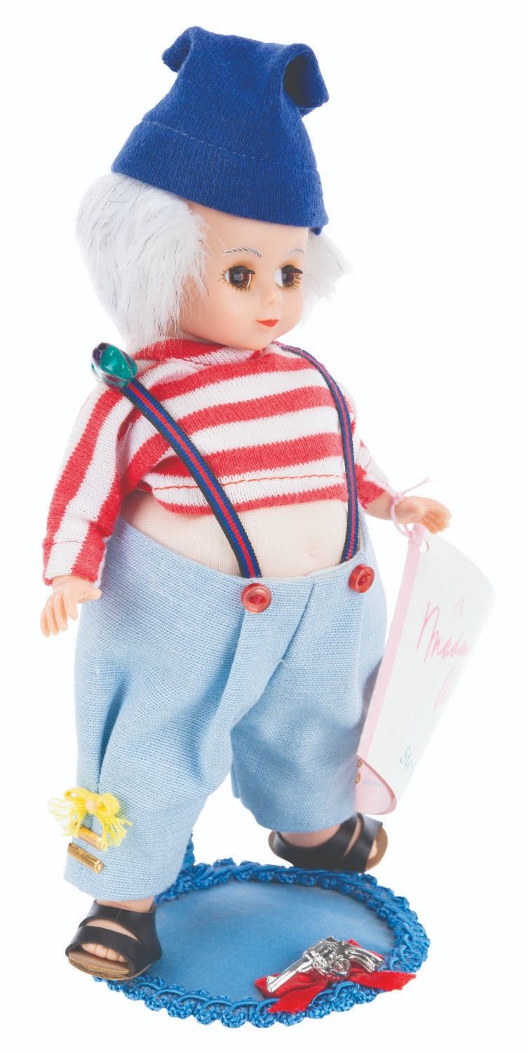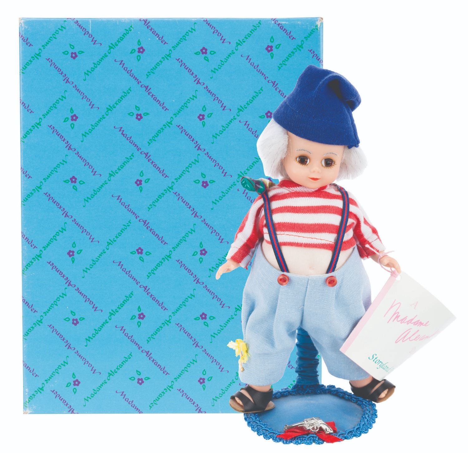 (Madame Alexander, 1993) A doll of "Peter Pan’s" Mr. Smee from Madame Alexander’s Storyland Dolls collection. Measuring 7.5" tall, the doll is in fine condition, with the internal strings slightly loose from age. This includes the original box and display stand.