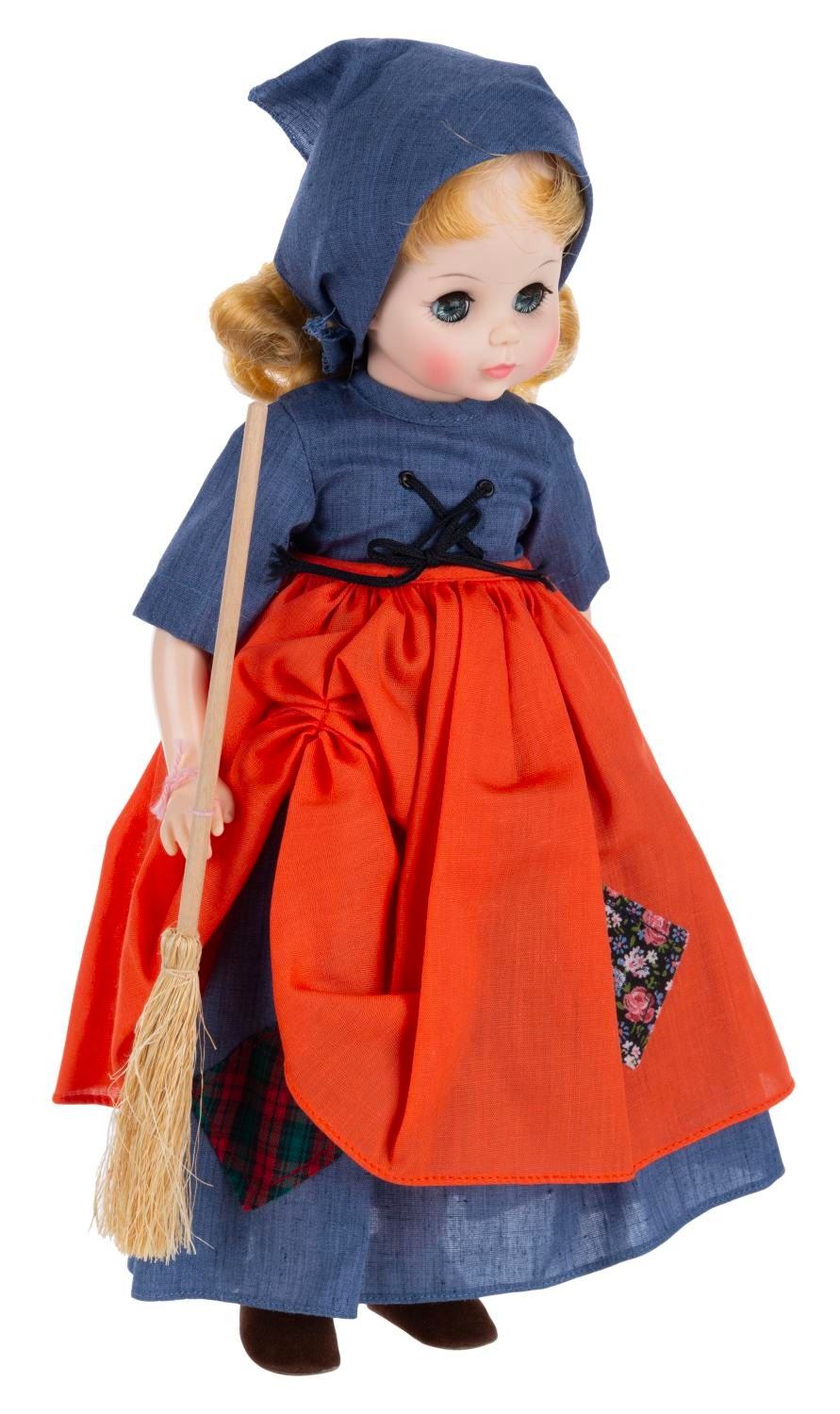 (Madame Alexander, 1970s) A Poor Cinderella Doll (#1540) by the Madame Alexander Doll Company. This doll features a blue dress and comes with the original box. Measuring 14" tall, the doll is in fine condition with her original clothes & broom. The box measures 9"x4.25"x14" and is in fair condition with creases and wear .