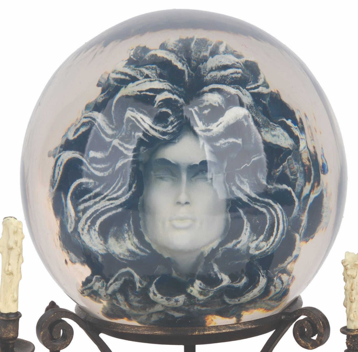 (Disneyland, 2019) A Madame Leota resin figure with metal accents, created for The Art of Disney Parks Collection to celebrate the 50th anniversary of the Haunted Mansion. Measuring 6" tall with a 6.5" diameter base, the figure is in very good condition with a chip to the paint on one of the candles.