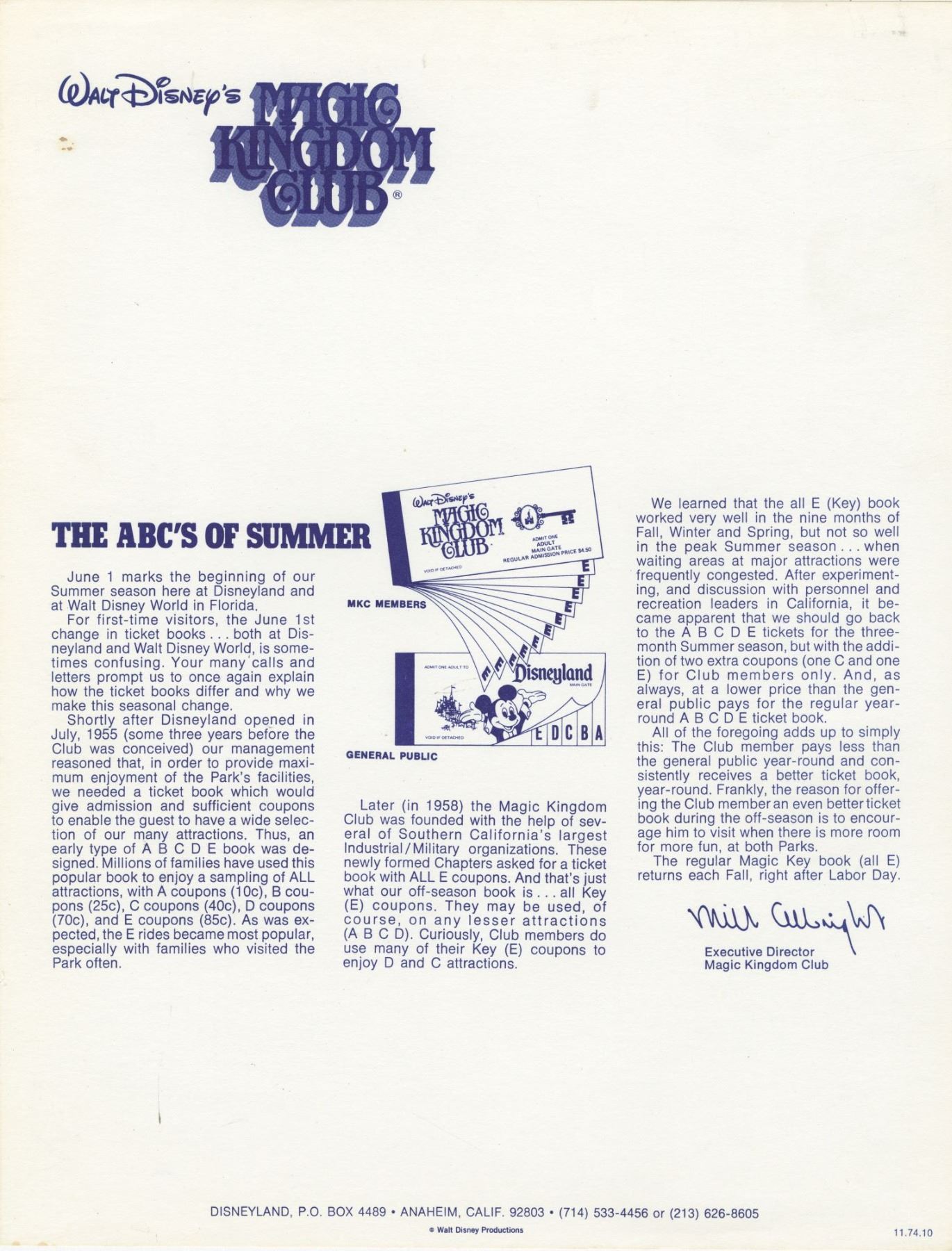 (Disneyland/Walt Disney World, 1974) A Magic Kingdom Club inter-office memo regarding the ticket changes being implemented for the summer season. The memo also features a facsimile of Executive Director, Milt Albright. Measuring 8.5” x 11”, the memo is in very good condition with minimal edge wear and discoloration from age.