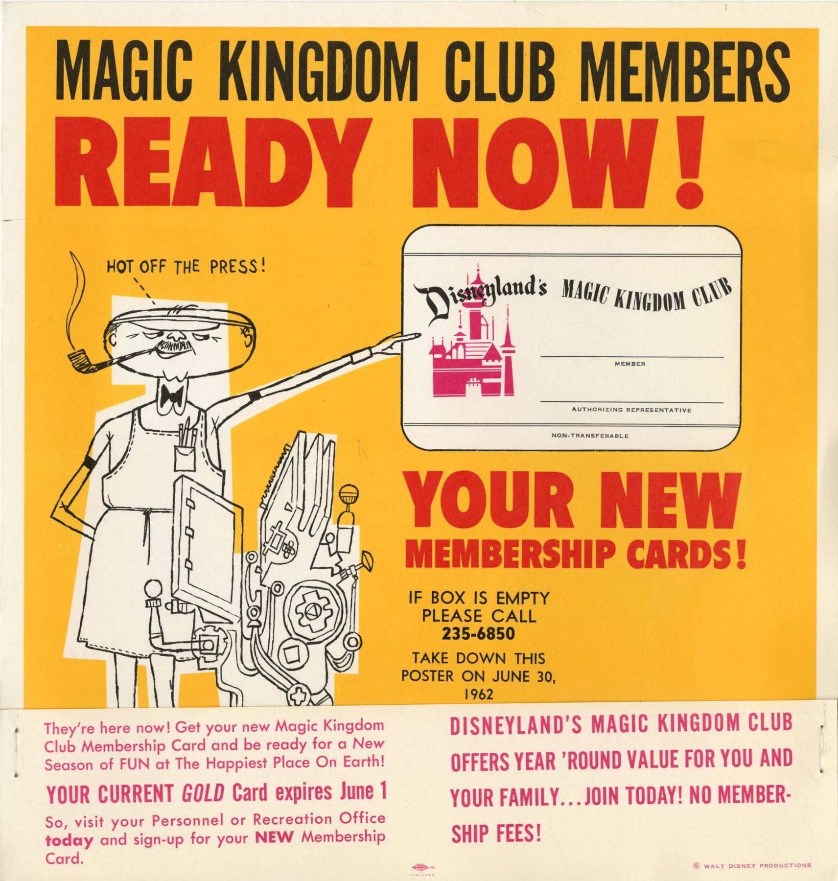 (Disneyland, 1962) A Disneyland Resort Magic Kingdom Club membership drive poster from 1962. The poster with a unique illustration of an antique printing press advertises the new Magic Kingdom Club cards. Measuring 11" x 8.5", the poster is in very good condition with the bottom edge folded up intentionally to make a pocket for membership forms, and staple holes on both sides from the pocket formation.