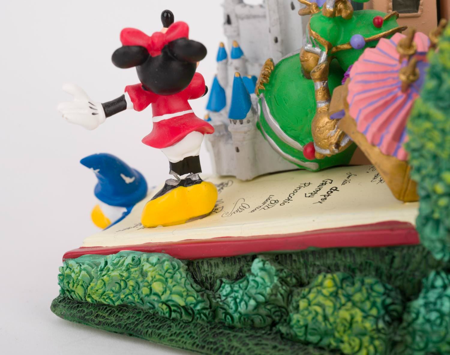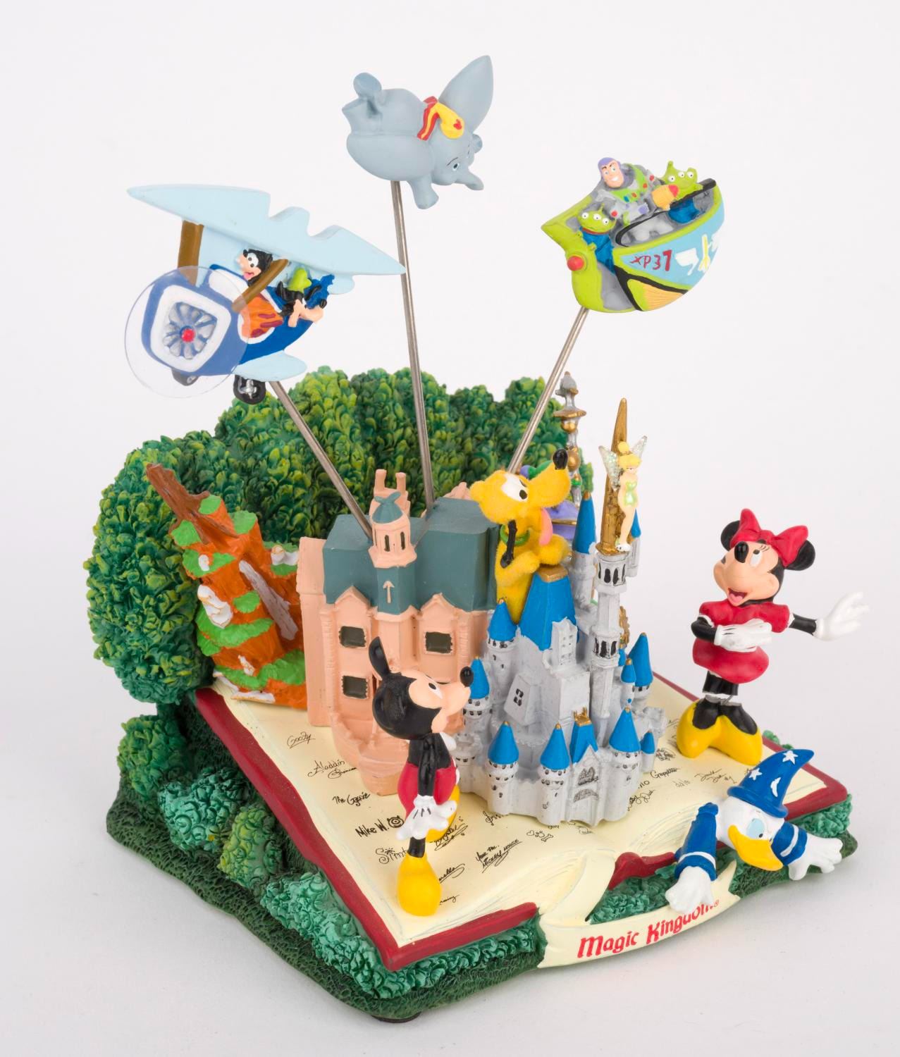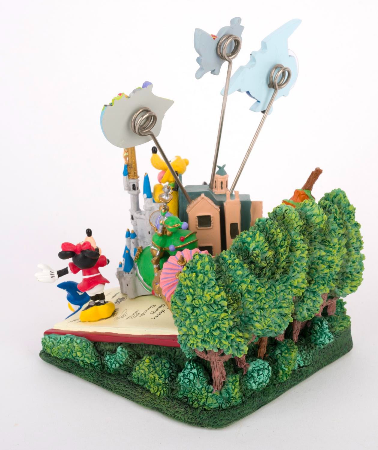 (Walt Disney World, 2000s) A resin photo clip stand depicting an open autograph book with dimensional characters and attractions of Walt Disney World springing out. Measuring 5" tall, the piece is in good condition, with a slight break to Minnie's legs that does not affect her pose.
