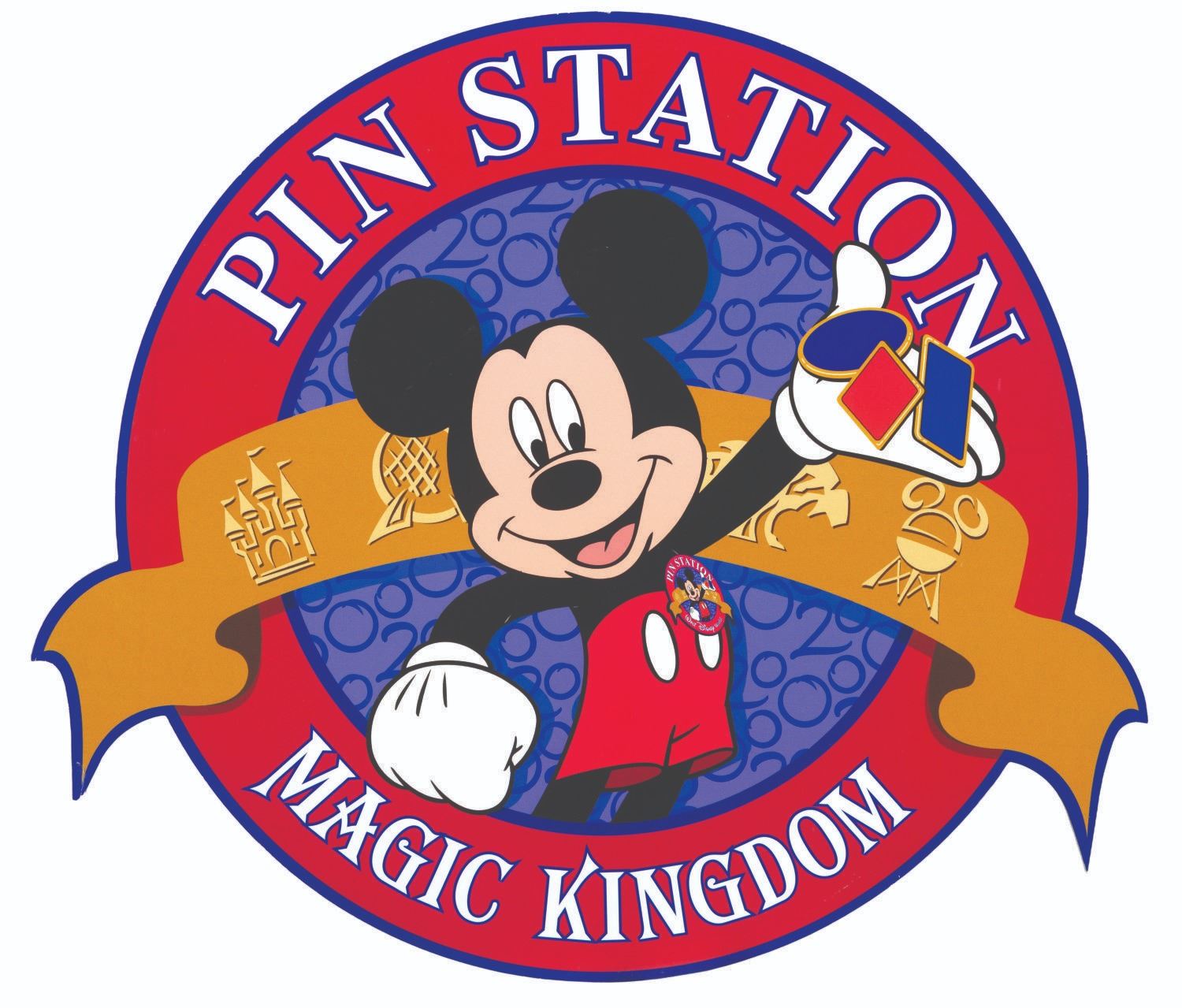 (Walt Disney World, 2000s) A Mickey Mouse sign directing Guests toward pin-trading locations in the Magic Kingdom at Walt Disney World. Measuring 20" x 23", the acrylic sign is in good condition with heavy scratches, light scuffs, and wear from Park use.