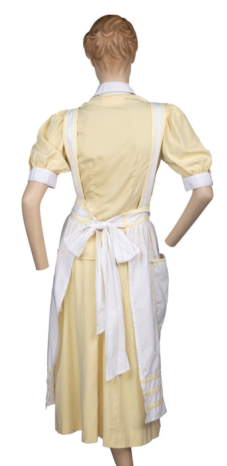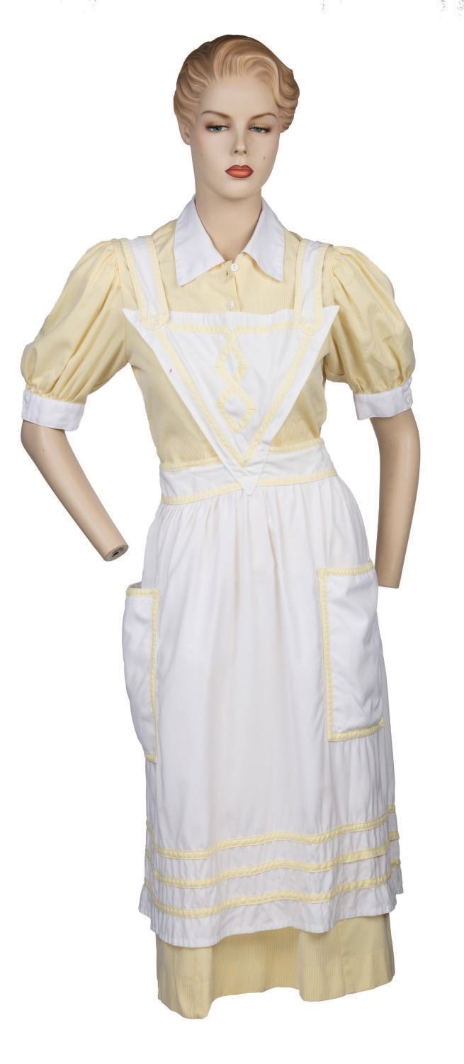 (Walt Disney World) A costume worn by Hostesses of the Magic Kingdom Plaza Restaurant at Walt Disney World. The shirt measures a Female XS, the Skirt is a Size XS, and the apron is "one size fits all," each piece in very good condition with pilling, loose threads, and wear from Park use.