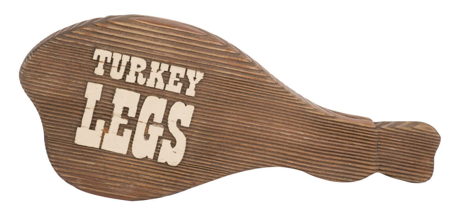 (Walt Disney World, c.2010s) A Turkey Leg sign from a Disney Parks Food Division Cart in Frontierland at The Magic Kingdom. Measuring 7"x15.5" and 1" deep, the wooden sign is in very good park-used condition, exhibiting slight wear to painted areas.