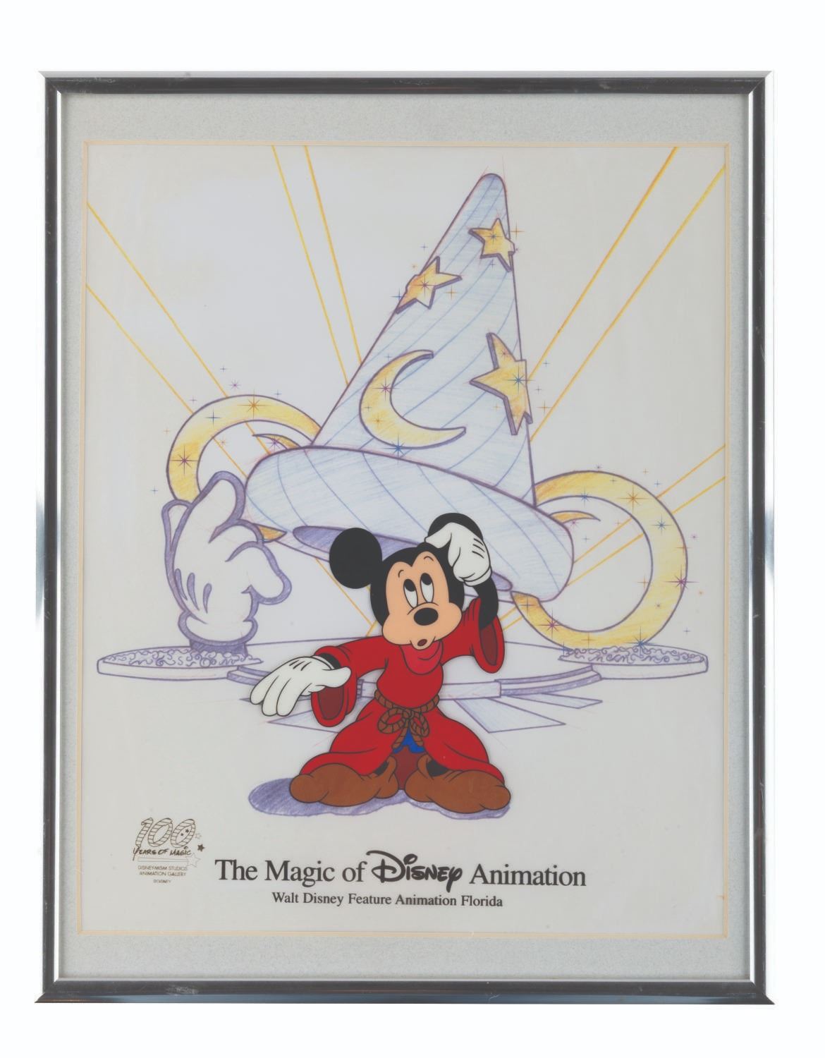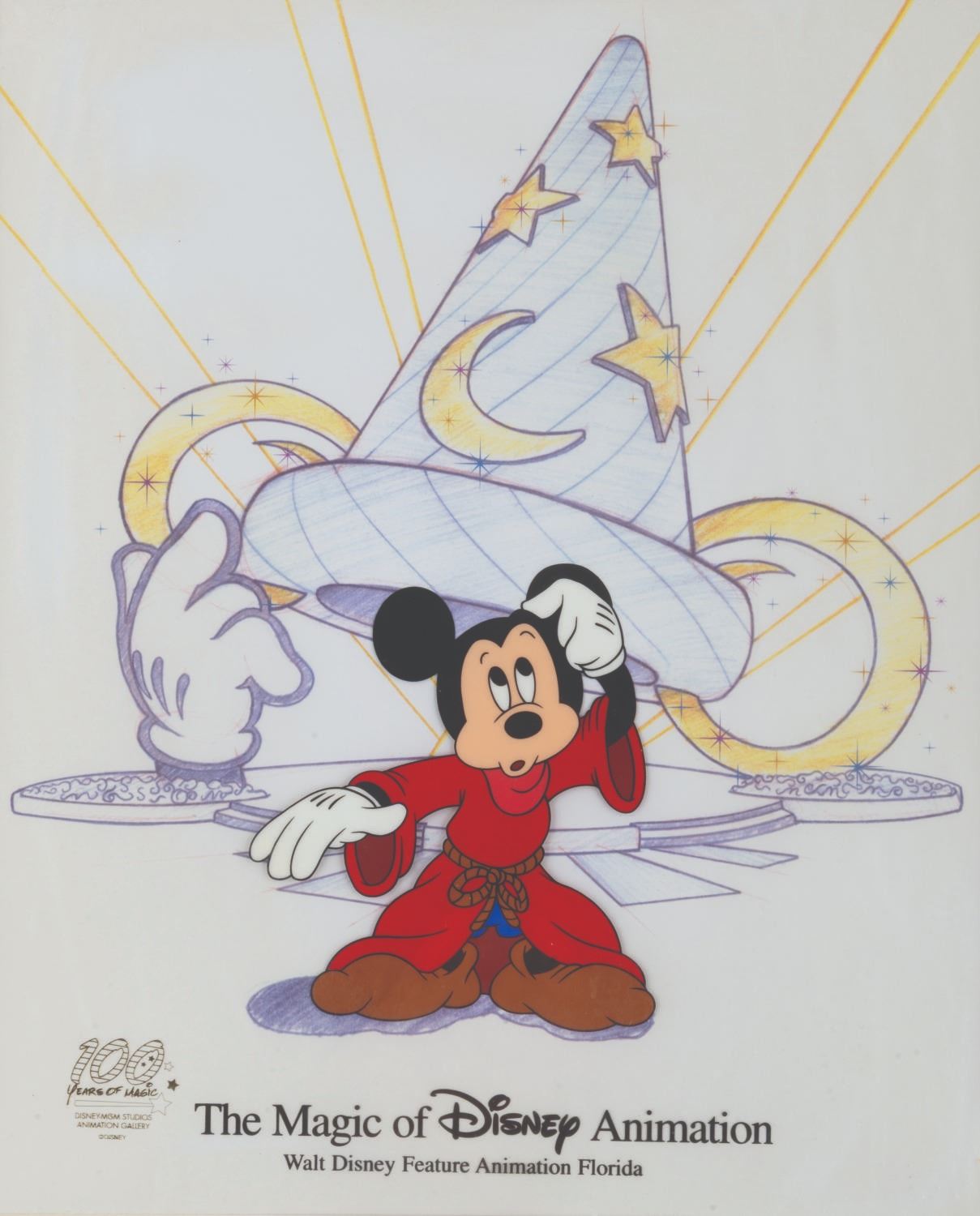 (Disney-MGM Studios, 2001) A Limited Edition sericel of Sorcerer's Apprentice Mickey titled"100 Years of Magic.” With a character size of 4.25” x 5” in a 10” x 12.25” visible image, the piece is in very good condition.