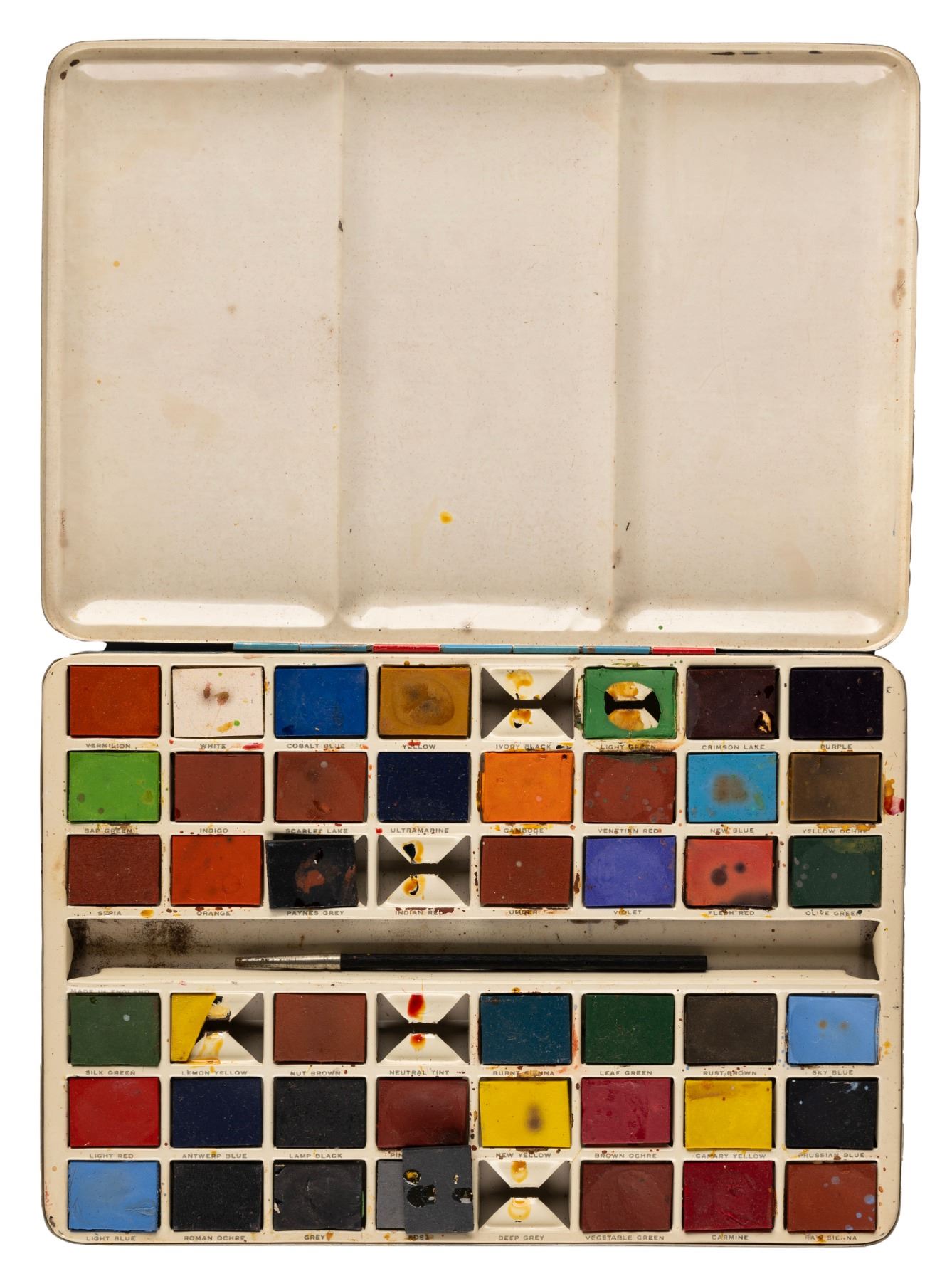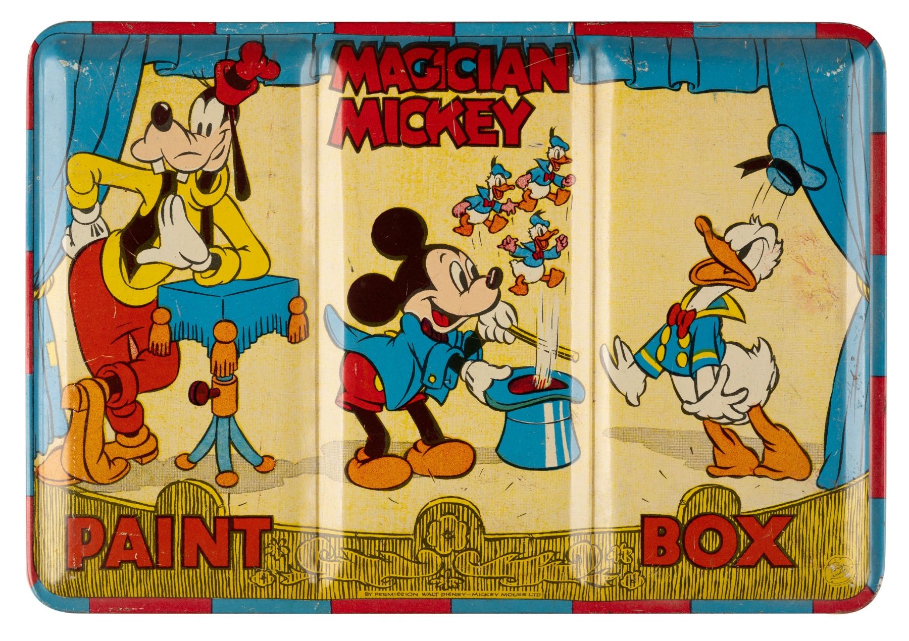 (Page of London, 1950s-60s) A Magician Mickey tin litho paint box with spots for 48 different paint colors. Measuring 6.75" x 9.75", the paint box is in good condition with wear including scratches, scuffs, paint chipping, discoloration, oxidation, and smudges. The paint samples themselves are in fair to good condition with chipping, smudges, and stains from age and use, and six colors missing from their labeled spots.