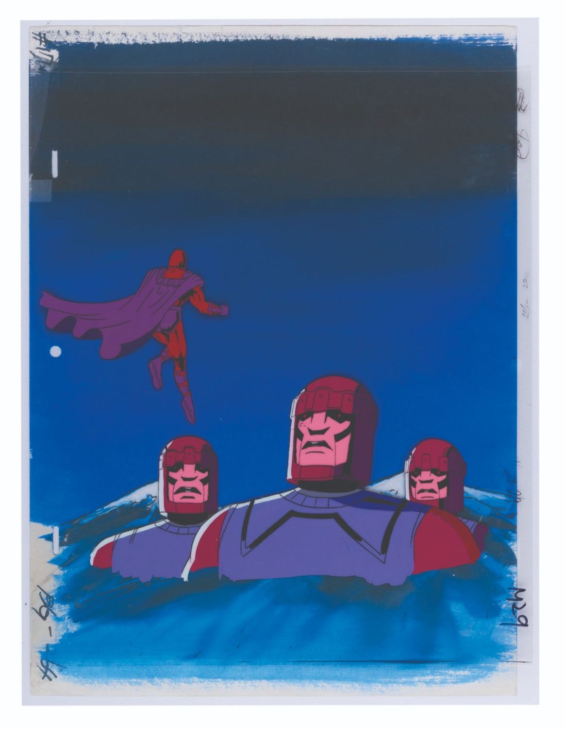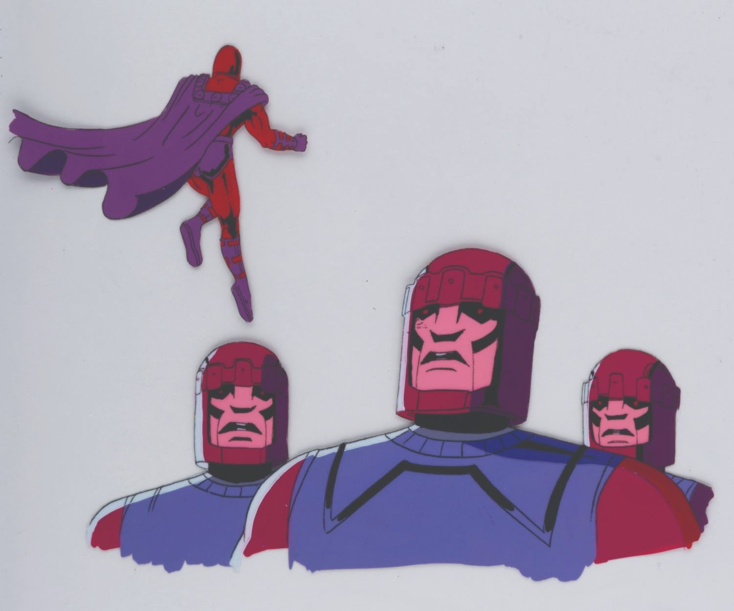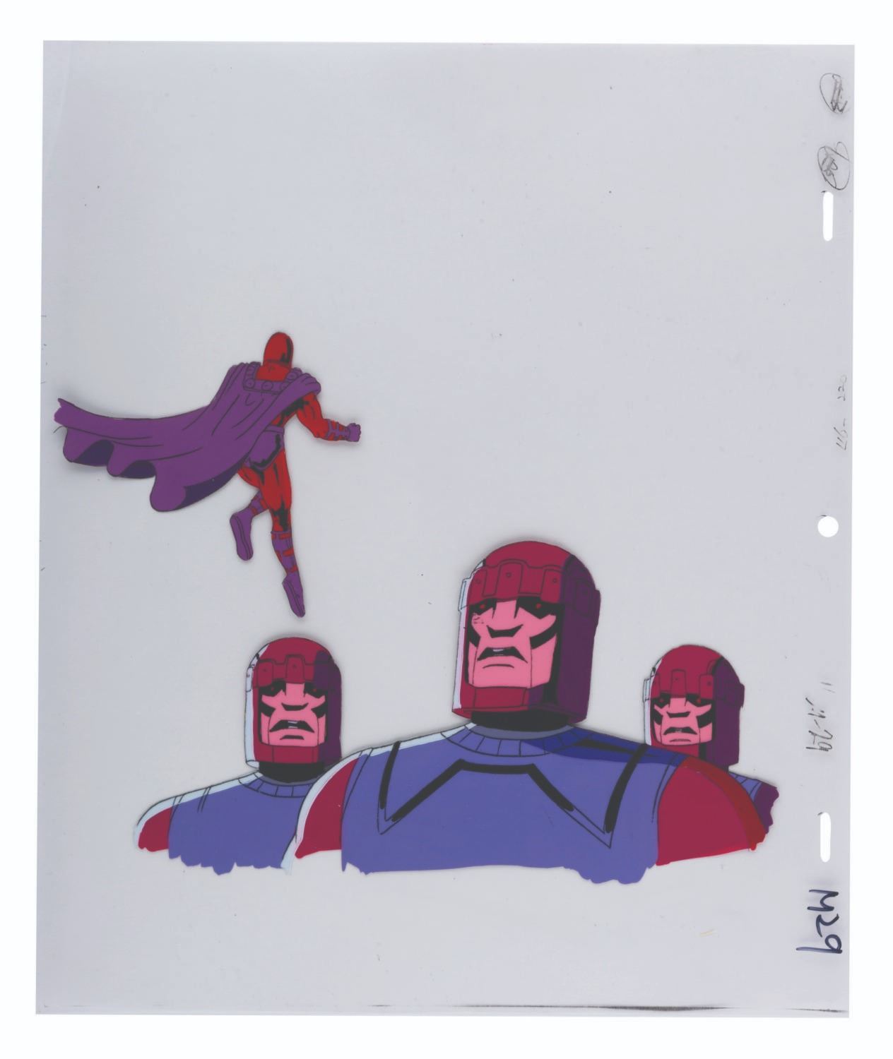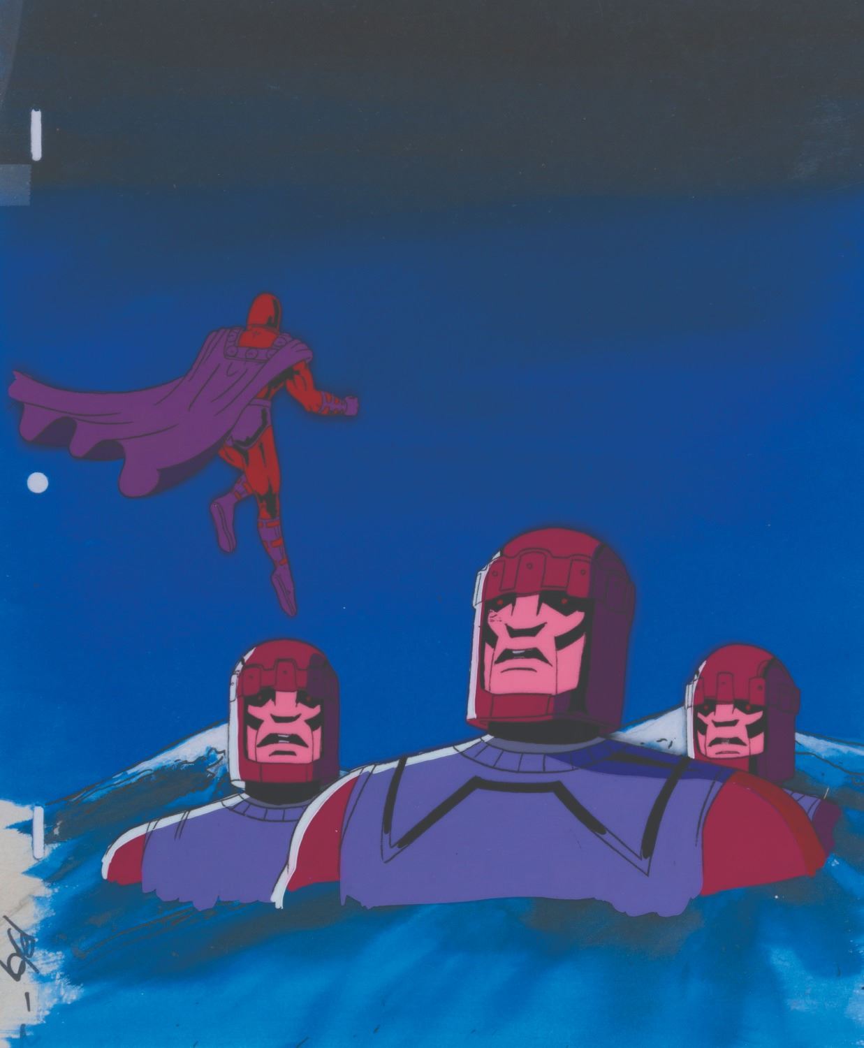 (Fox, 1995) An original production cel from “X-Men: The Animated Series” of Magneto and Sentinels from the season four episode “Sanctuary” with a color copy background. Measuring 12.5” x 10.5” with a character image size of 7” x 10.5”, the cel is in fine condition.